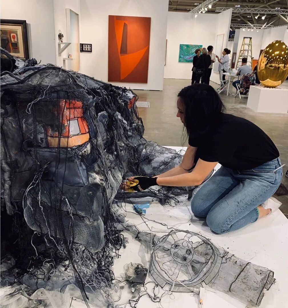数量庞杂的薄纱和毛线,密密麻麻穿插在铝合金车身框架中,它们纠缠糅合,打破再重组,经过纯手工的织造手段,最终构成了这一犹如车祸现场的景象。