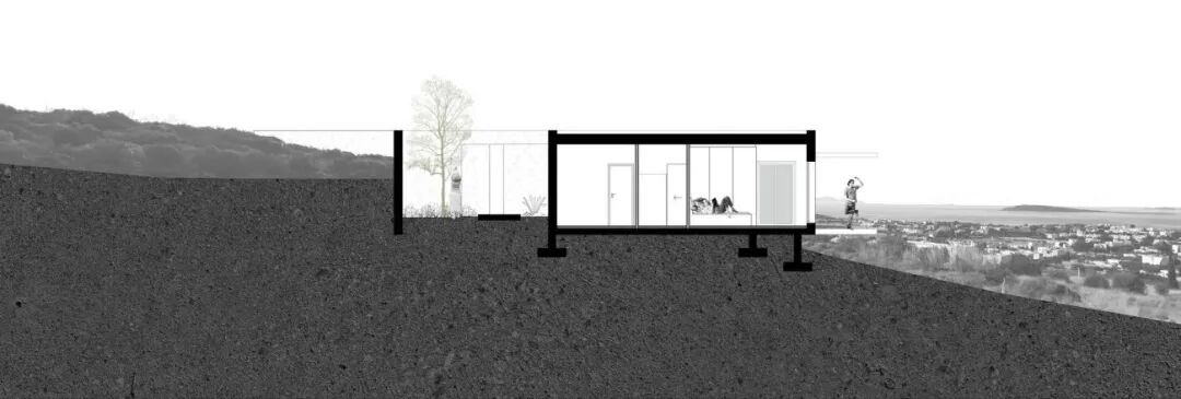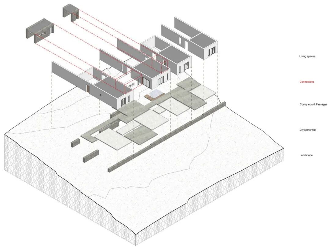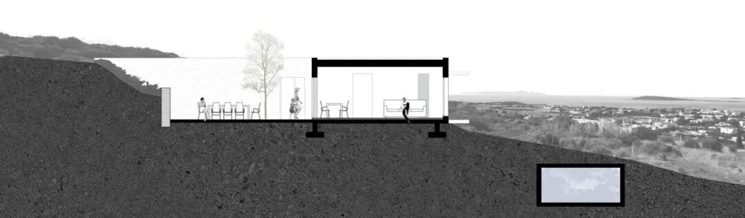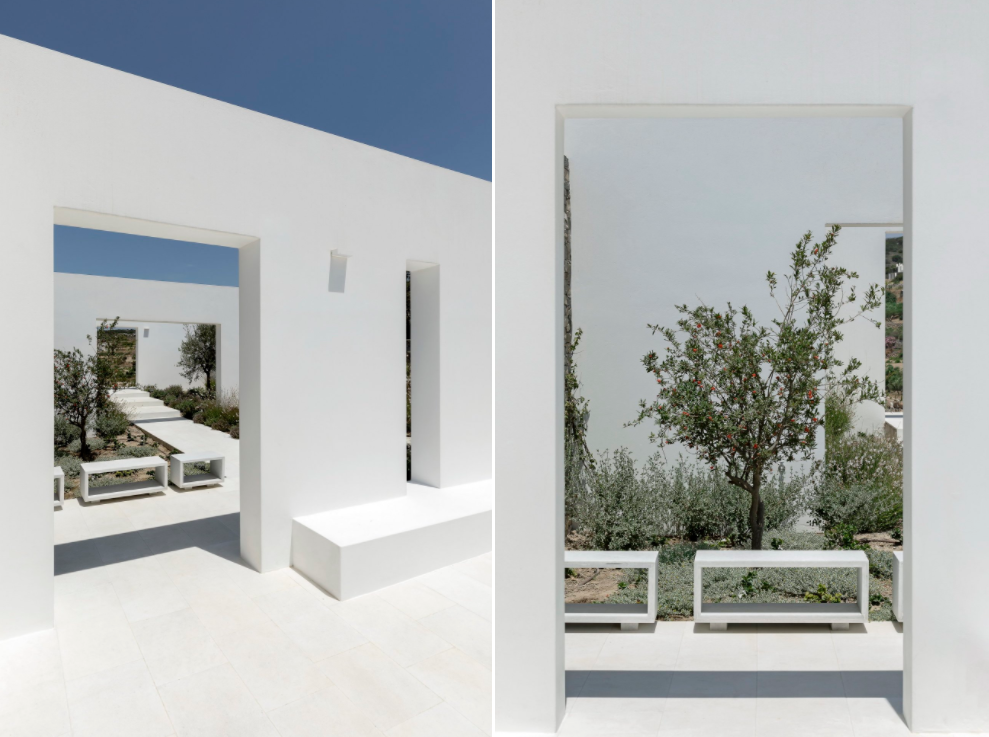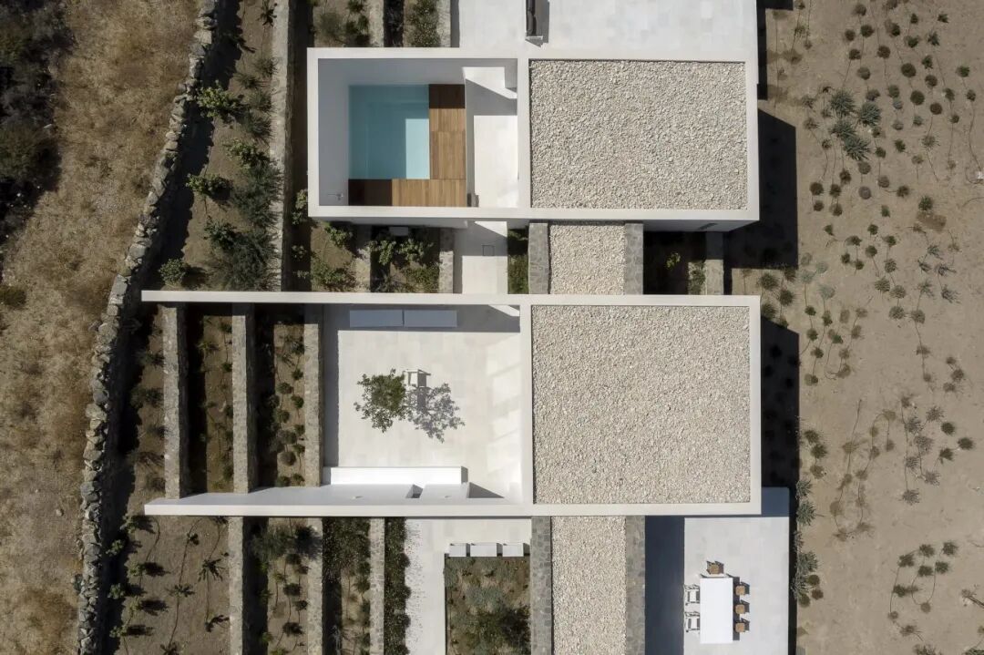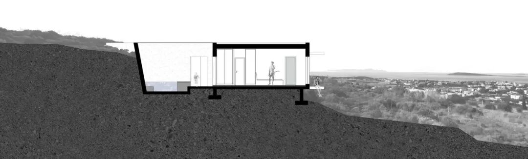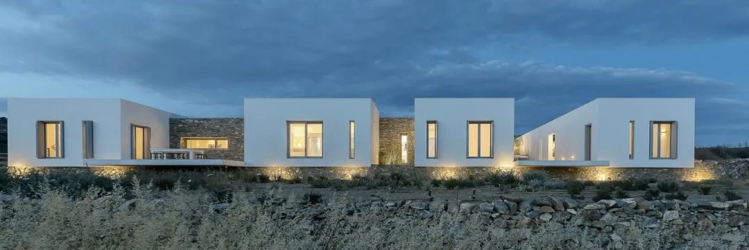 建筑的空间单元悬浮于景观之上,试图定义度假宜居的生活场景。在白天,基克拉迪群岛上的强烈光线影响着建筑内的活动场景。建筑为人们提供了一个相对私密的活动空间。