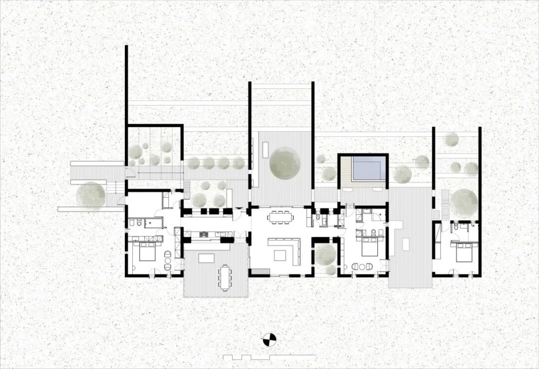 These spaces flow from the interior and are shaped by the walls. The walls are visible only from the east side of the plot; therefore, the living scenario is revealed upon entering the residence. A path crosses them, which connects the thematic sections. The path unfolds parallel to the path inside the house, forming views towards the sea and the living areas.