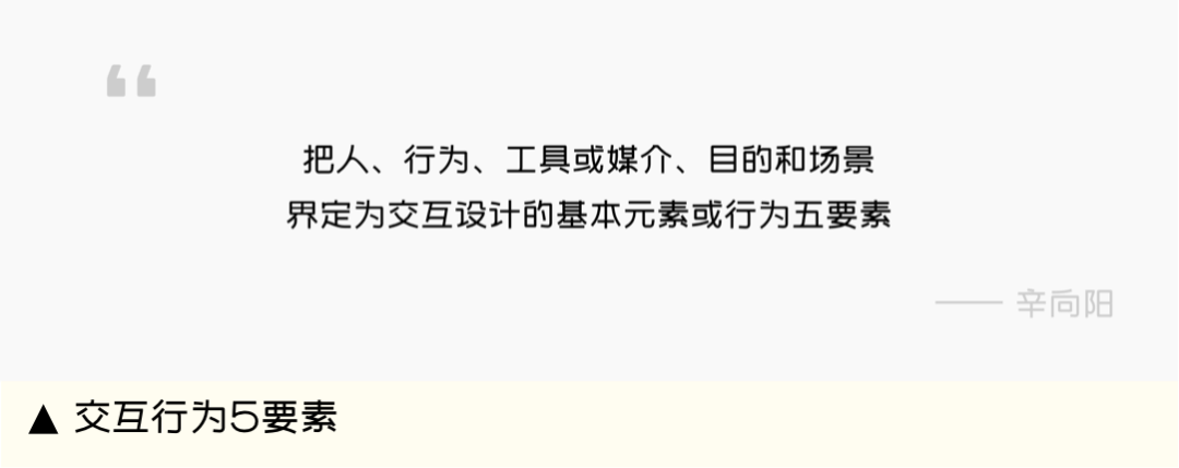 辛向阳先生在《从物理逻辑到行为逻辑》一文中,提出了交互行为5要素的概念,即用户、场景、目的、媒介与行为,以帮助设计师对问题进行准确解析和挖掘。