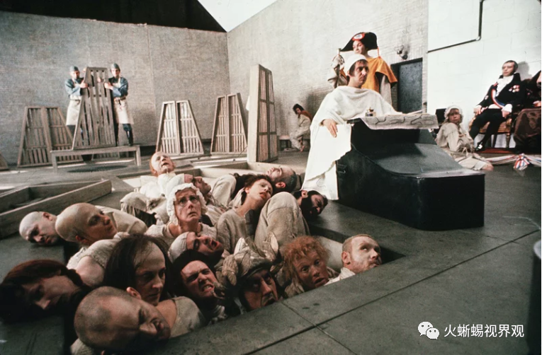 尽管人们在看这部剧之前做足了心理功课,但并没有让观众为彼得·布鲁克(Peter Brook)设计的畸形秀做好准备:穿着破衣服、流口水的疯子与观众摩擦肘部,在舞台上尖叫,以一场全面的骚乱结束了当晚的政治谩骂。就连谢幕也颇具挑衅意味。当观众欢呼的时候,演员们仍然在抽搐、流口水,他们在舞台的边缘以嘲弄的方式回击,压制住了每晚起立鼓掌的观众,直到所有观众离开剧院。