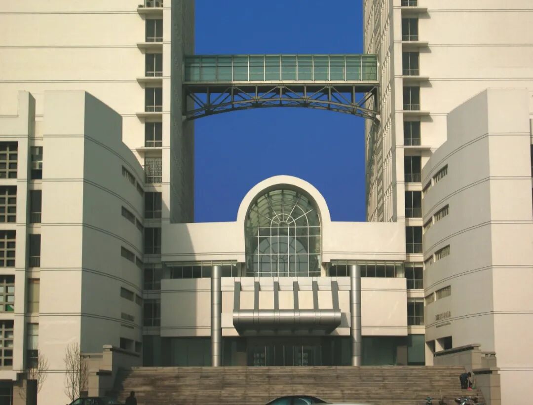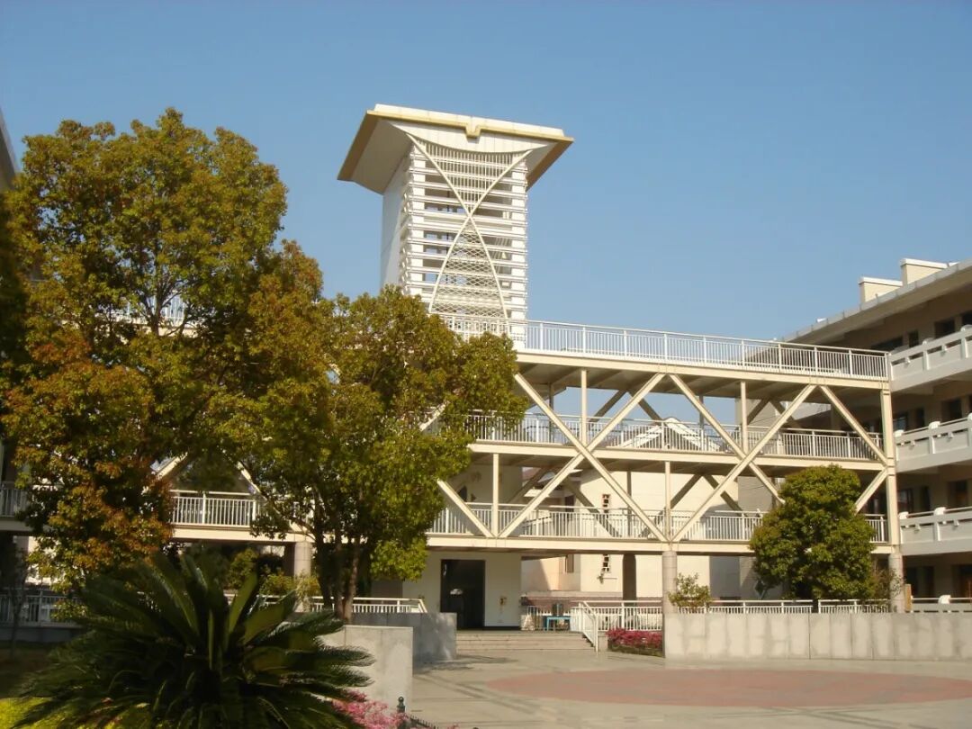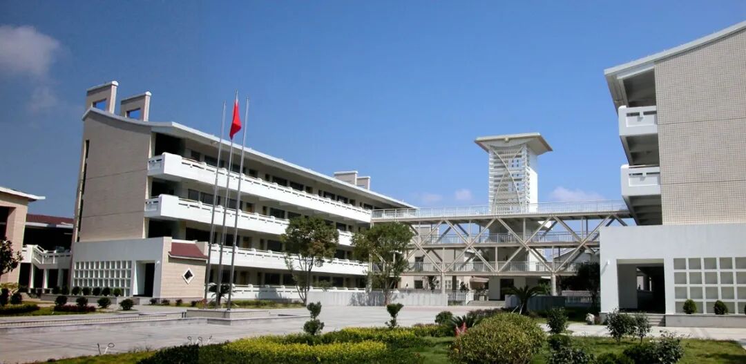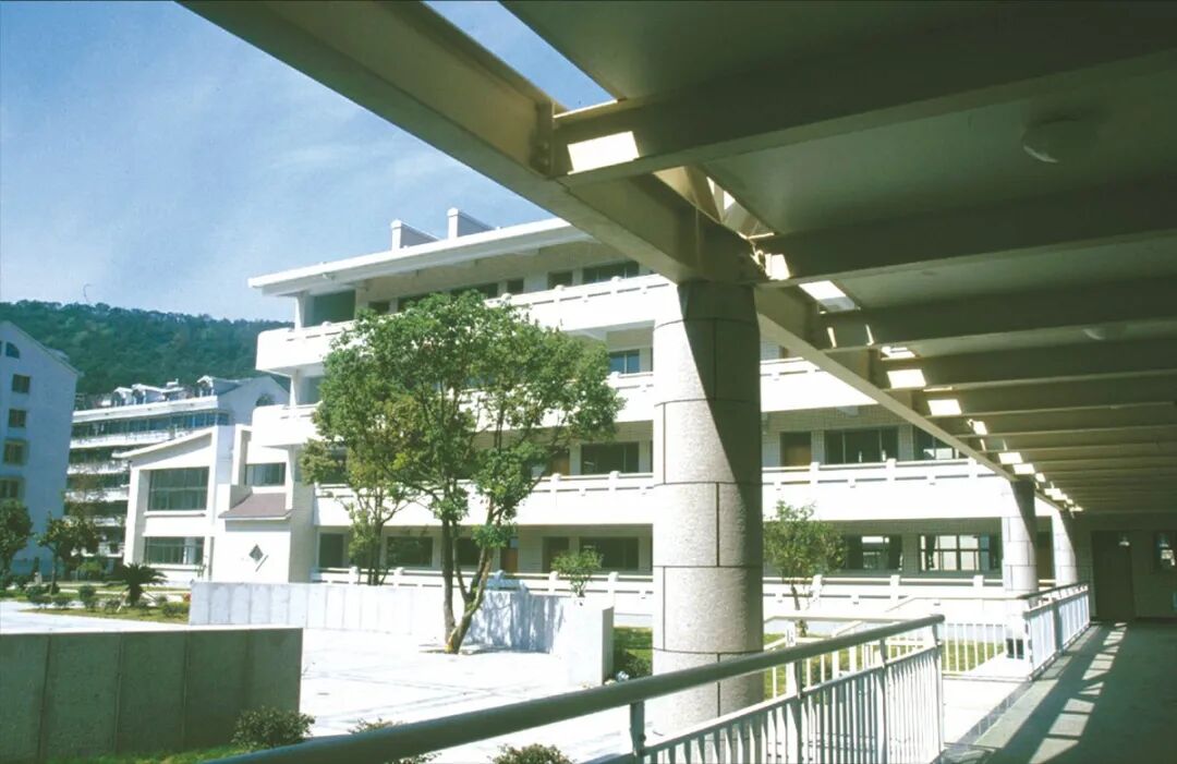 基于当地气候条件,在方案构思时首先考虑的便是建筑物的通风和朝向,几经修改确定教学楼呈三合院布局形式,南北两翼为教室,取开敞式的单面走道形式,并以一条通透的连廊把南、北两幢教学楼连接成为一个整体,三合院连接部分为透空的钢架,不仅虚实对比强烈,而且透过它还可以隐约看到后部的庭园,更是有效地丰富了空间的层次变化。中部设置一部楼梯,与两教学楼西端两部楼梯鼎足而立,使得垂直交通分布均匀,十分方便于交通和疏散。