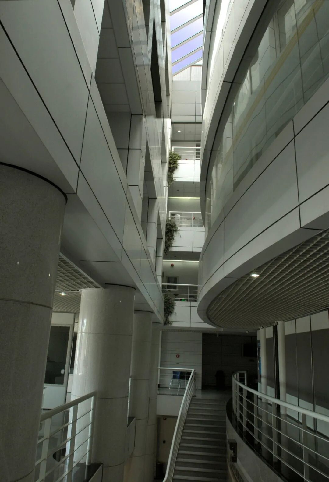 基地十分局促,只有把平面设计得尽可能紧凑,才能使建筑物与城市干道保持适当距离,以最大限度地减轻噪音的干扰。将主体部分安排在两条相互平行又比较邻近的矩形平面之中,南北两条各为18层,从而形成两片短板的体形,南北两部分各设一个交通枢纽,以较短的走道连接各工作房间。全部用房均为南北向,具备良好通风、采光条件。