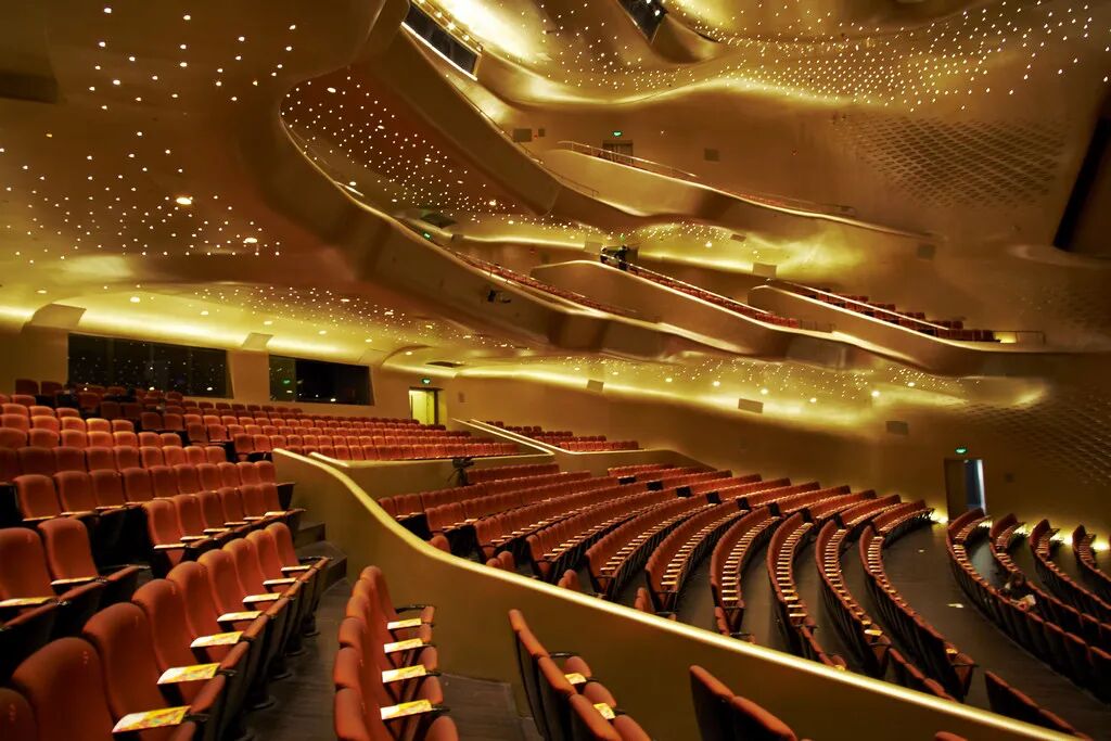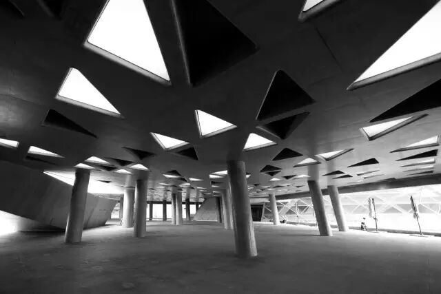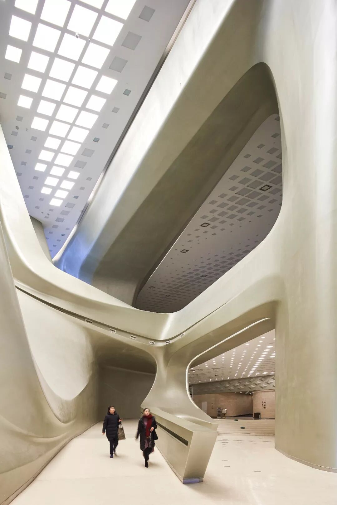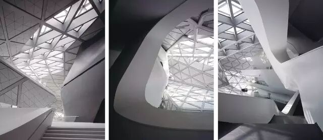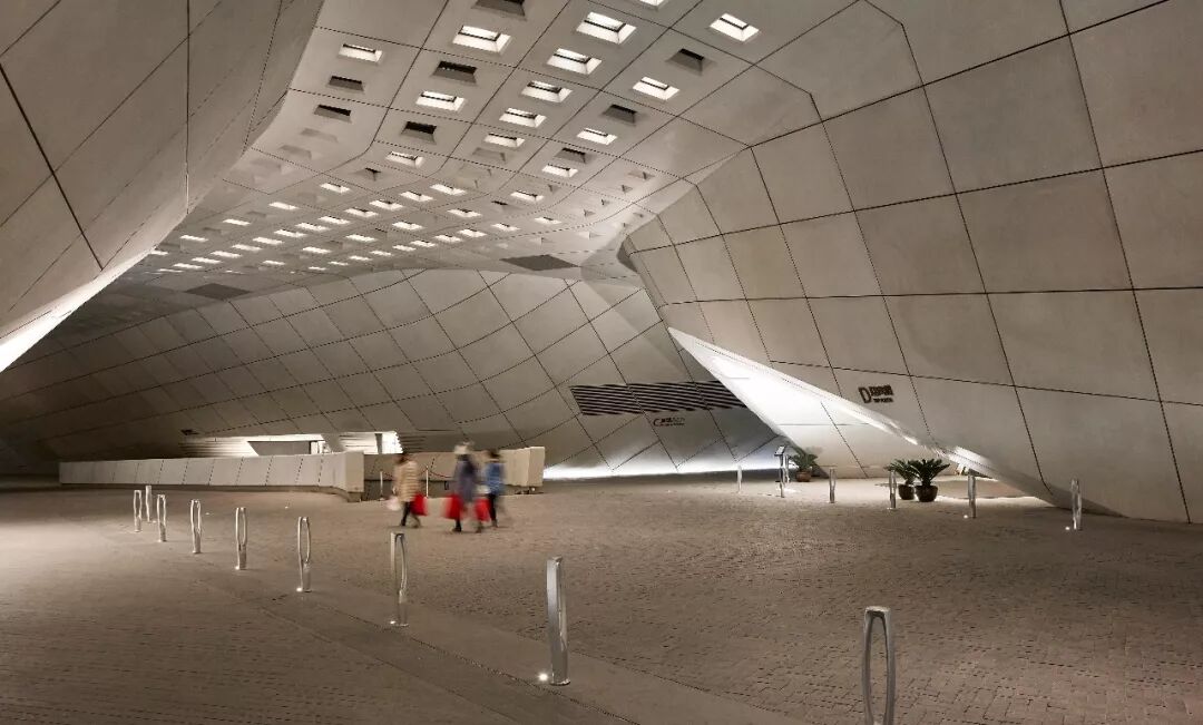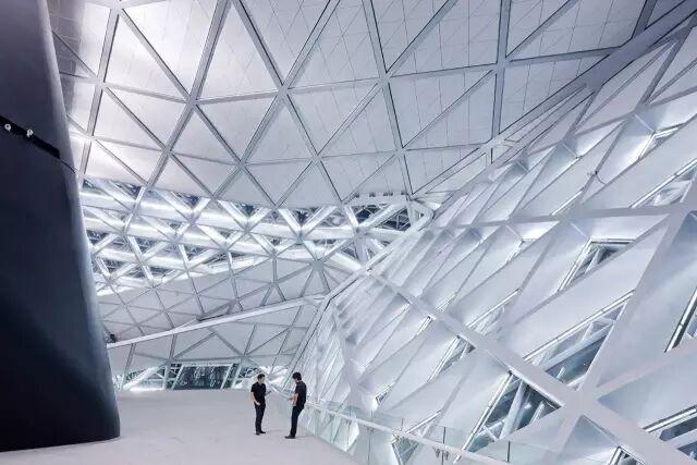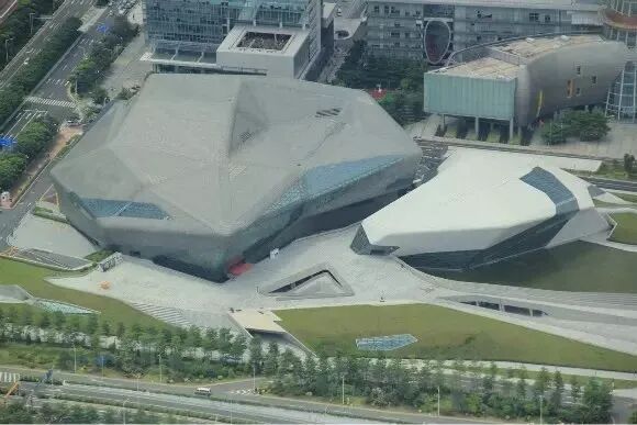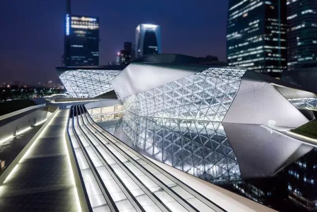 广州大剧院没有垂直的柱子,没有垂直的墙,采用不规则的几何形体设计,致使“石头”的外观是扭曲倾斜的,仅外表面就有64个面,41个转角和104条棱线。
