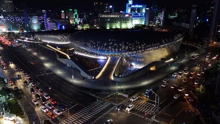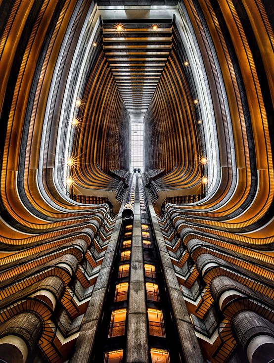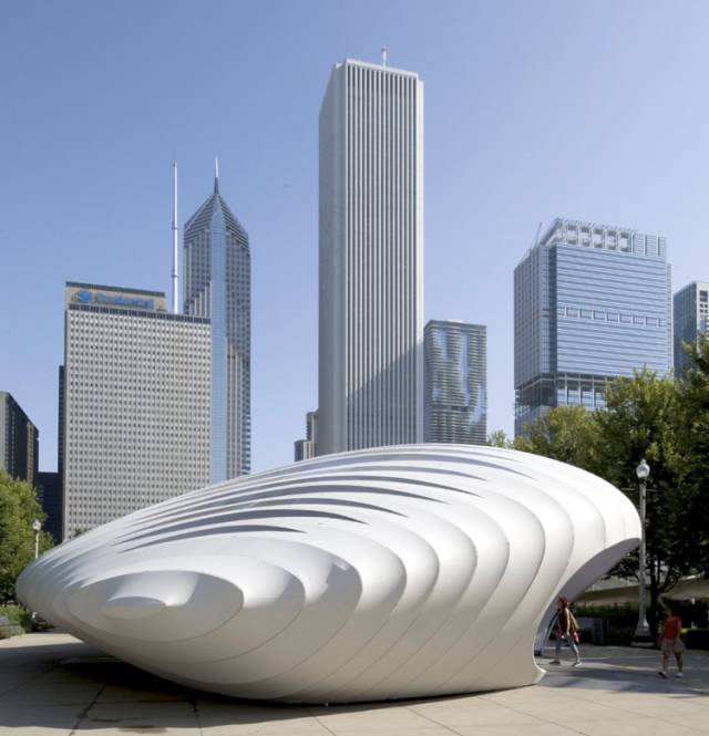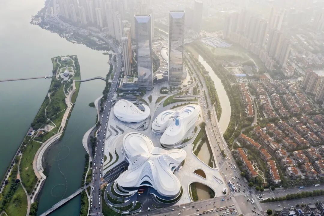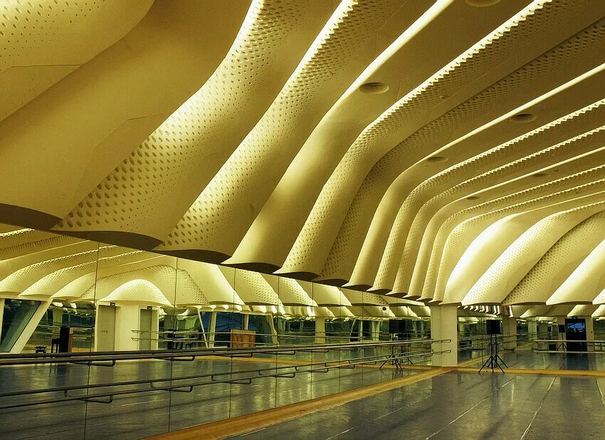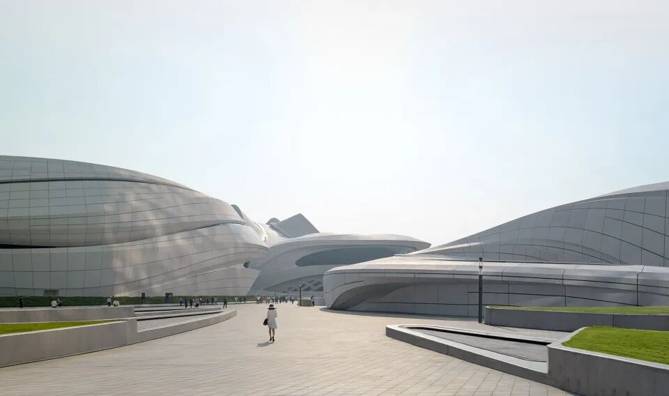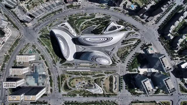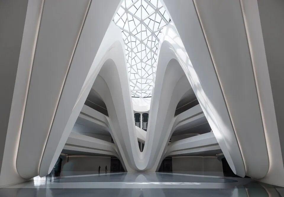 广州大剧院没有垂直的柱子,没有垂直的墙,采用不规则的几何形体设计,致使“石头”的外观是扭曲倾斜的,仅外表面就有64个面,41个转角和104条棱线。