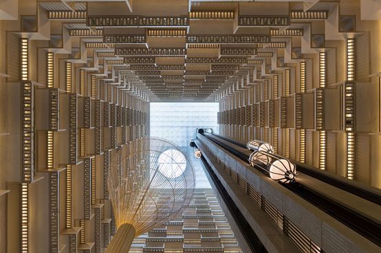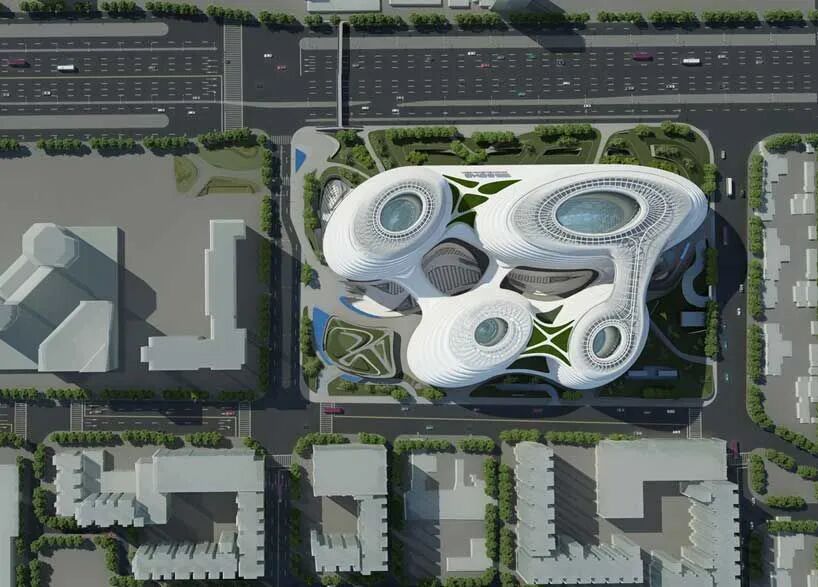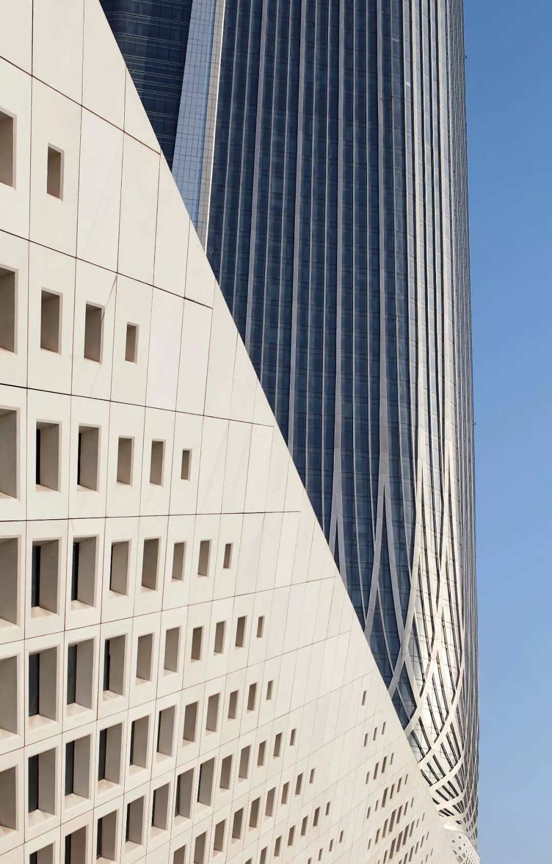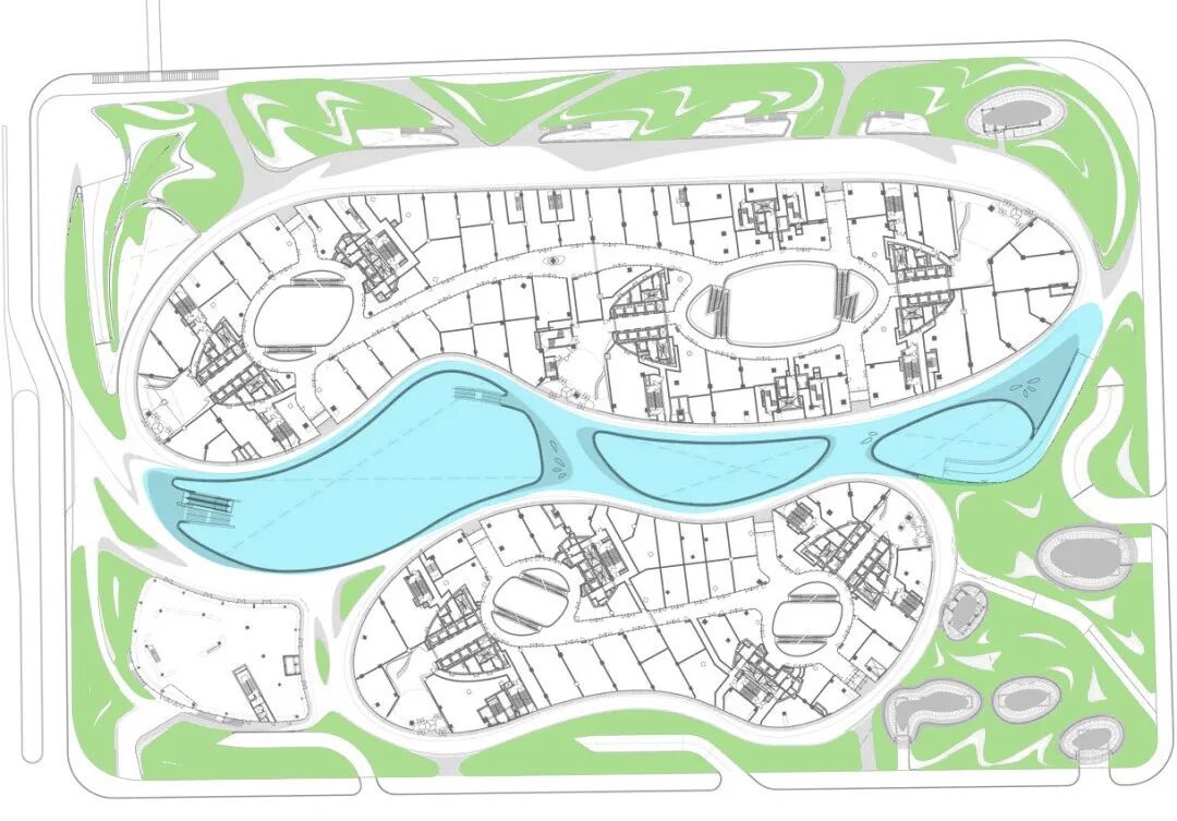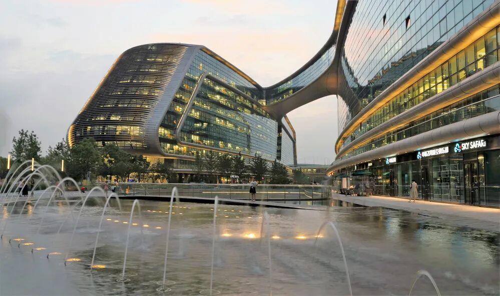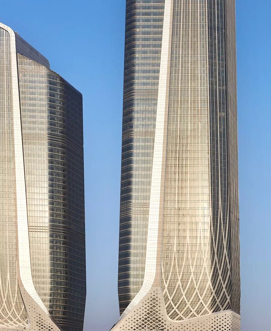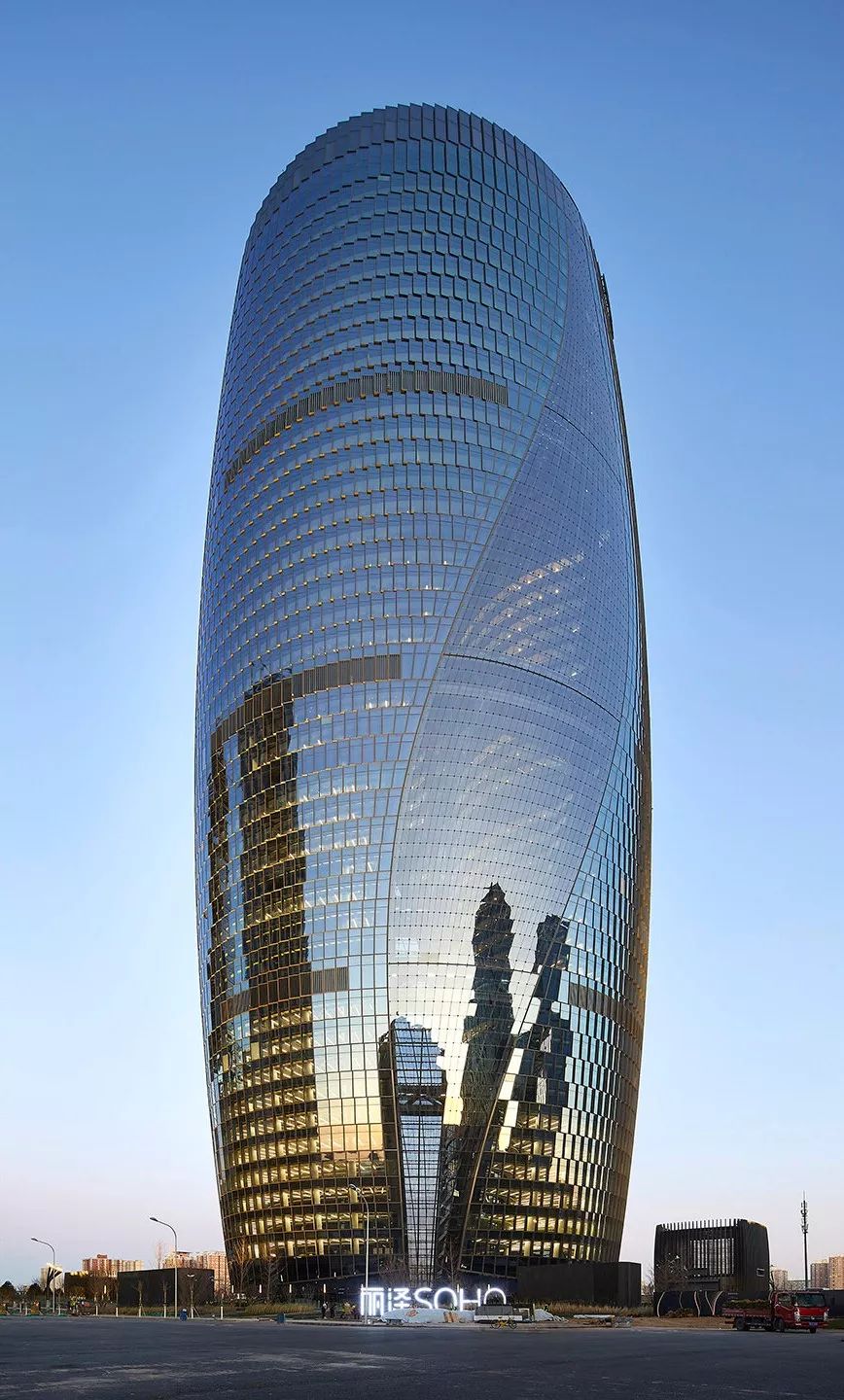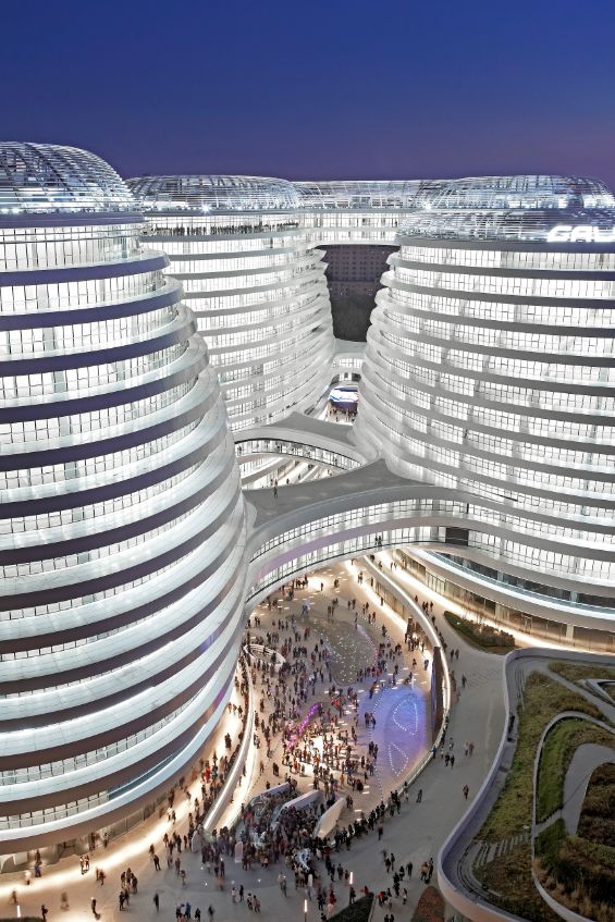 丽泽SOHO的建筑设计采用DNA双螺旋结构,流线型双塔以舞者般的优雅姿态回望市中心。每层楼的中央部分都可以通过高达近200米的通透中庭享受到自然光,俯视城市风景。