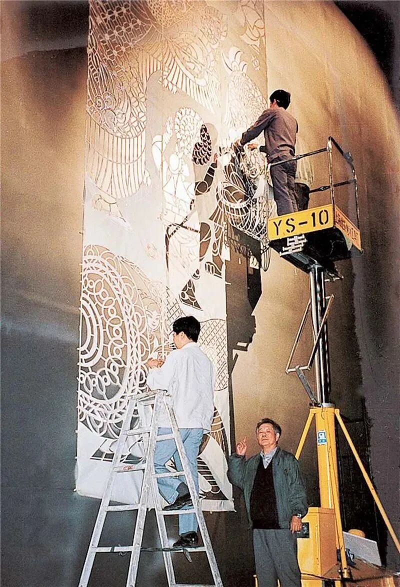 ▲1991年周令钊设计的深圳华侨城华夏艺术中心剧场金属防火幕《民族乐舞》安装现场