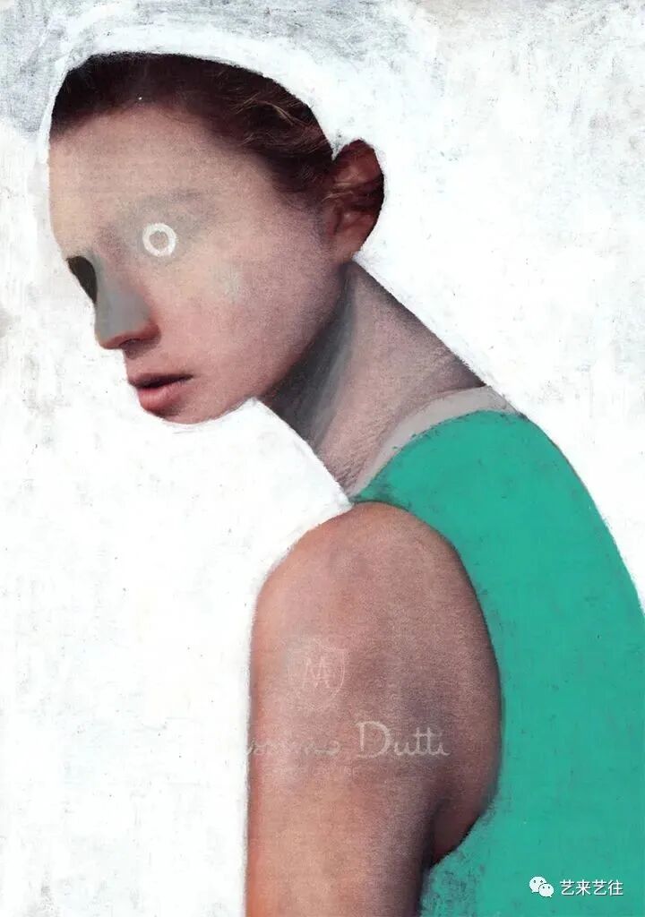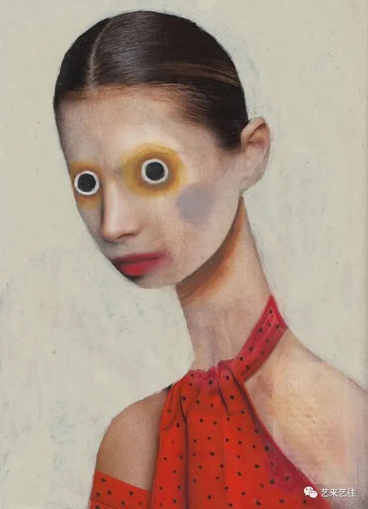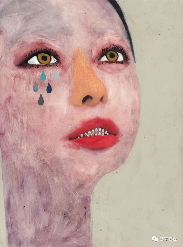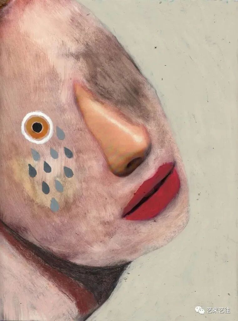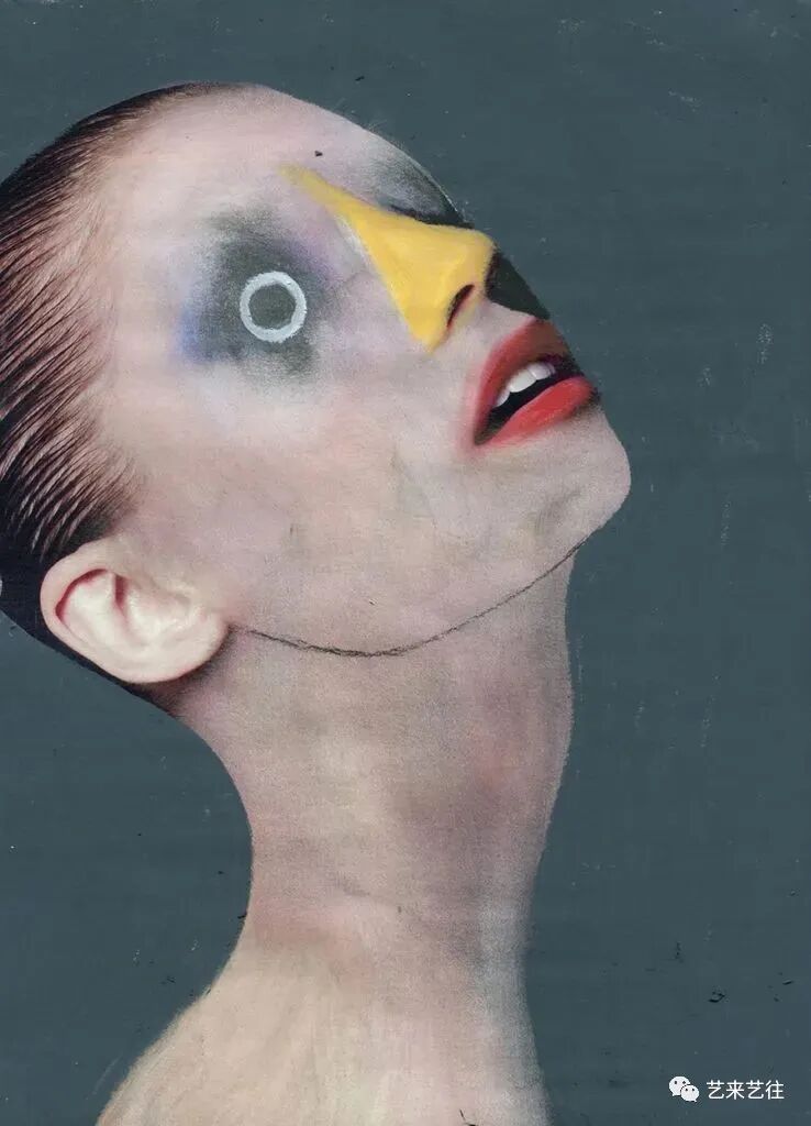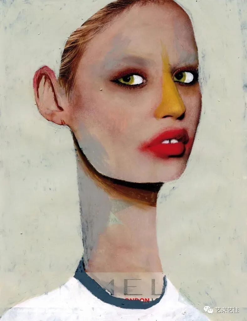 吉姆·蒂奥·扎拉鲁基引人注目的肖像捕捉到了人类状况的奇异之处。在他的早期作品中,他重新利用了时尚杂志上的照片,并将迷人的主题变成了奇异的、有虫眼的生物。原来的画面几乎被一个新的地质层级完全掩埋。只有鼻子、嘴巴或耳朵未被触及,作为对象过去生活的痕迹。大胆的举动带来了重生。新面孔用尖尖的、几乎没有画过的眼睛盯着你,而张开的嘴唇上涂着小牙齿,增加了肉食般的笑容。