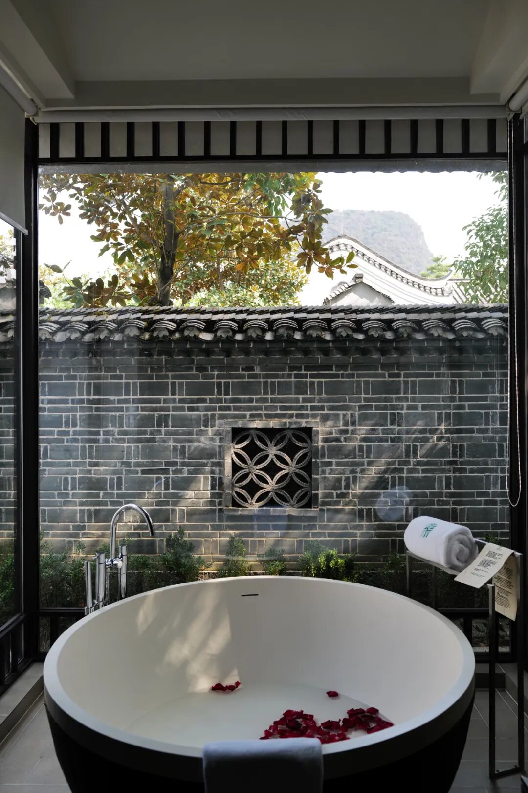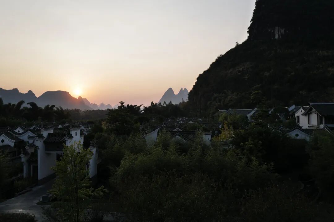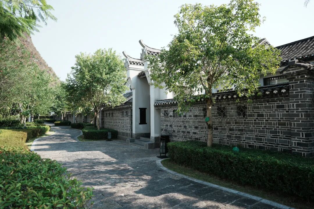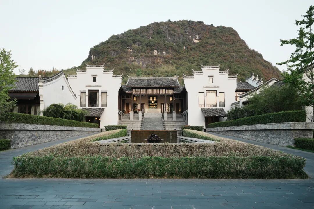 酒店沿着蜿蜒的漓江和起伏的喀斯特地貌舒展,一座座沿袭了桂北民居精髓的白墙黛瓦小楼,或沿江而立、或隐于浓密的绿意,用现代笔触,将古典村落的神韵刻画得栩栩如生,更与周围的环境形成一幅美轮美奂的水墨画。