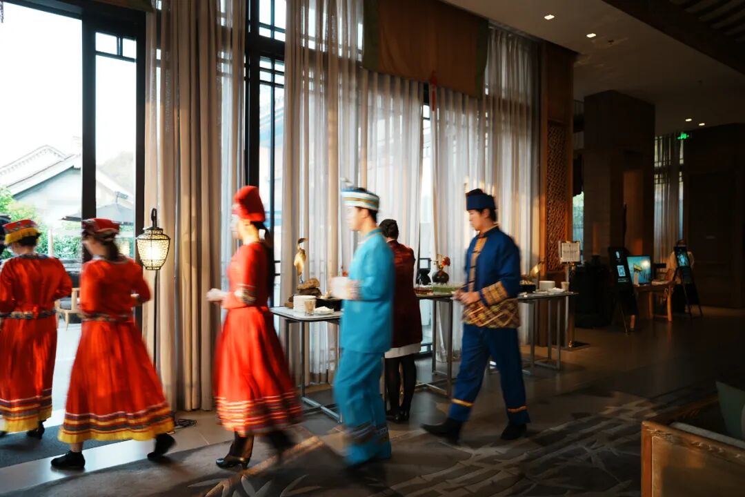 待我回别墅午休后再返回大堂,大堂早已被玫瑰色的阳光倾洒,身着各式当地民族服饰的员工组成列队,将宾客引向大堂外的户外露台,以极具仪式感的日落仪式,促成宾客借相聚感受温情,借入夜式感渲染时光的动人。