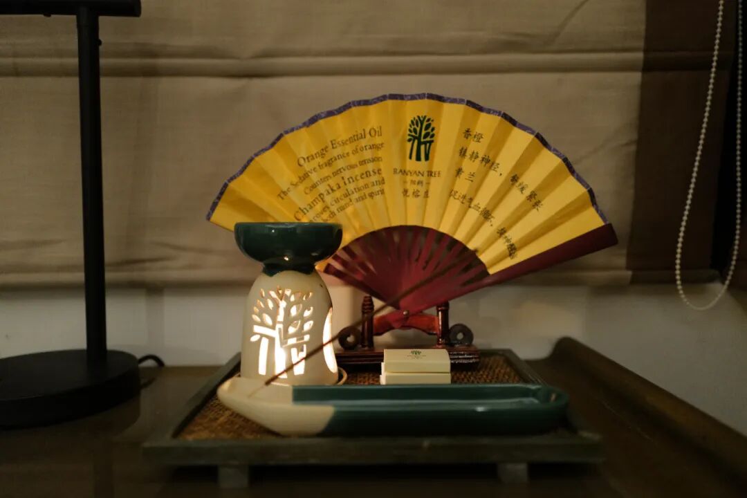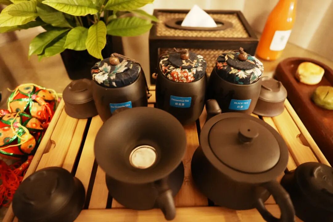 迷你吧照例有丰富多姿的茶叶品类和冲泡器具,香薰桌上照样有满载精油的香薰炉和每日更替香枝的香薰盘。