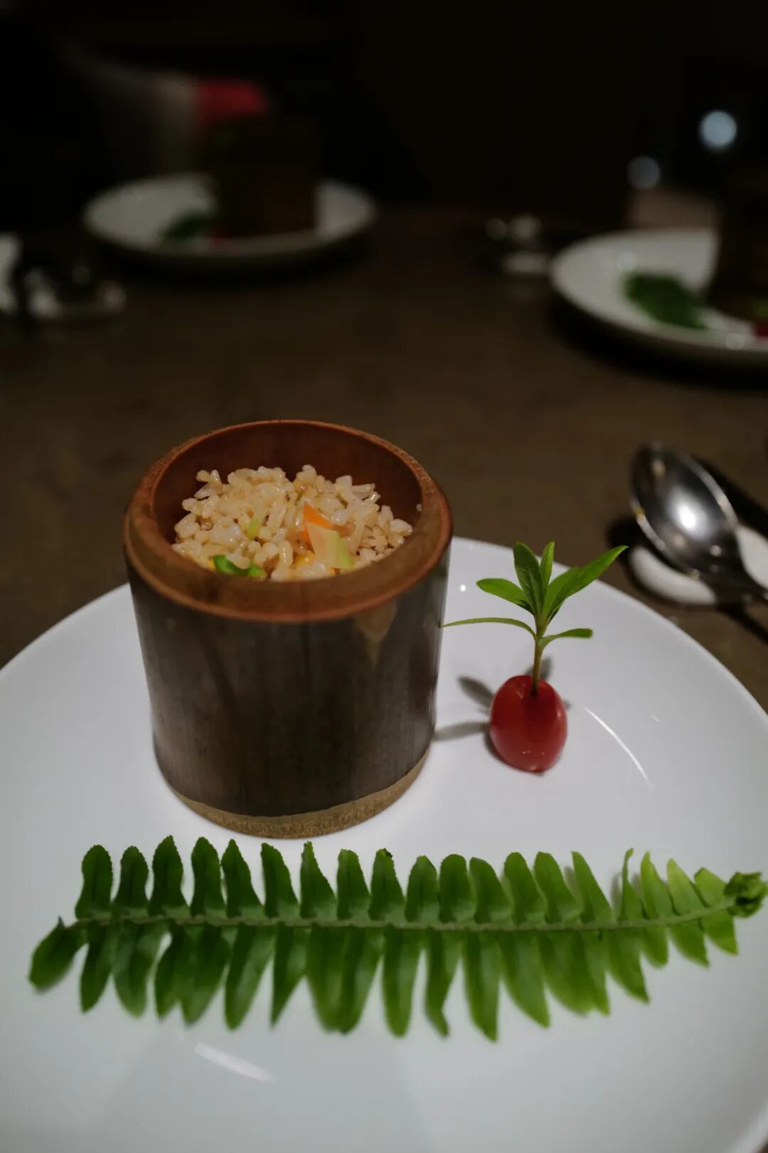 竹筒饭运用了全系粗米配合蔬菜丁制成,在装盆时配上了新鲜的蕨类叶片,让人对酒店所处的自然之境深感敬畏。