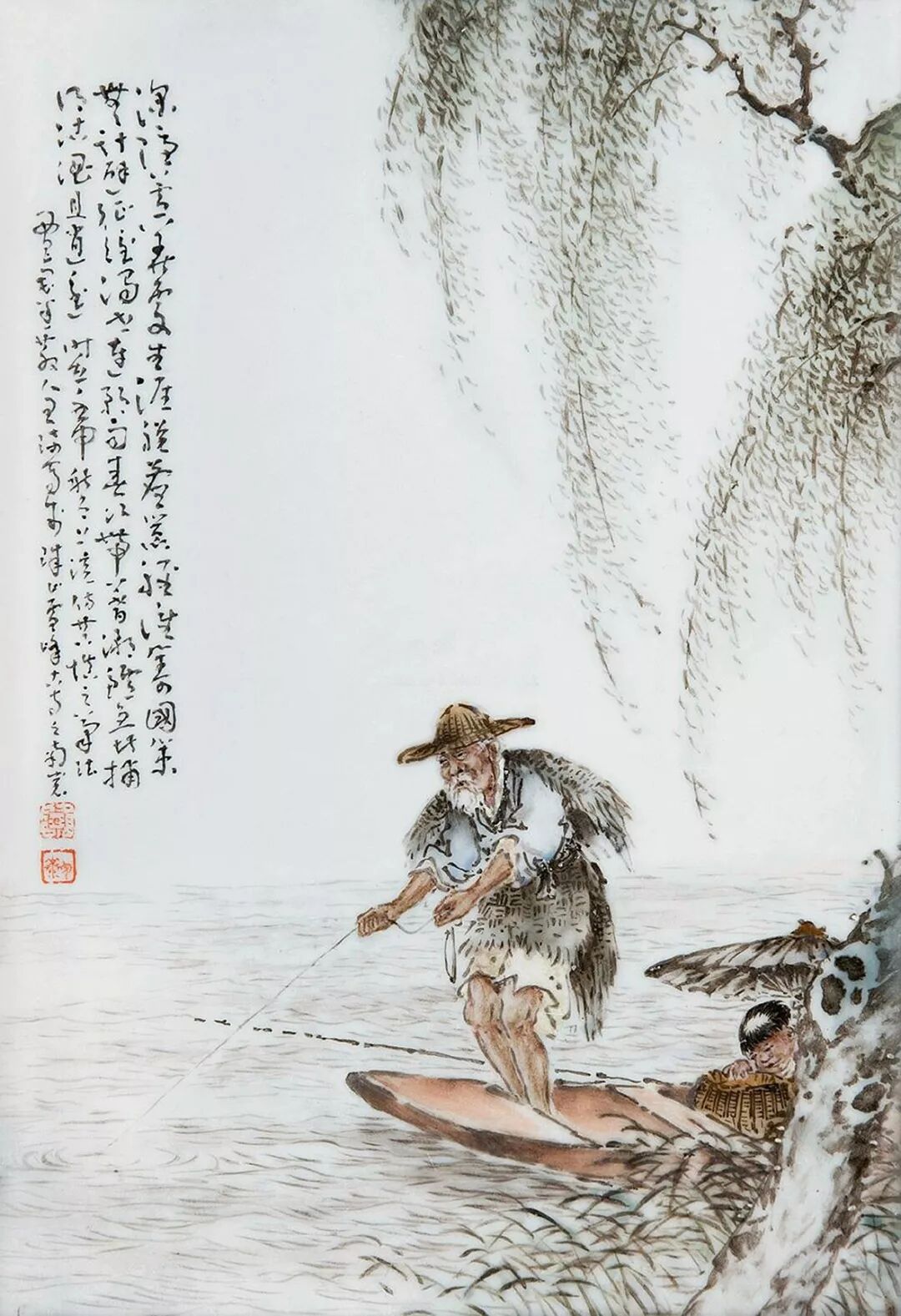 王琦粉彩《渔翁图》瓷板
