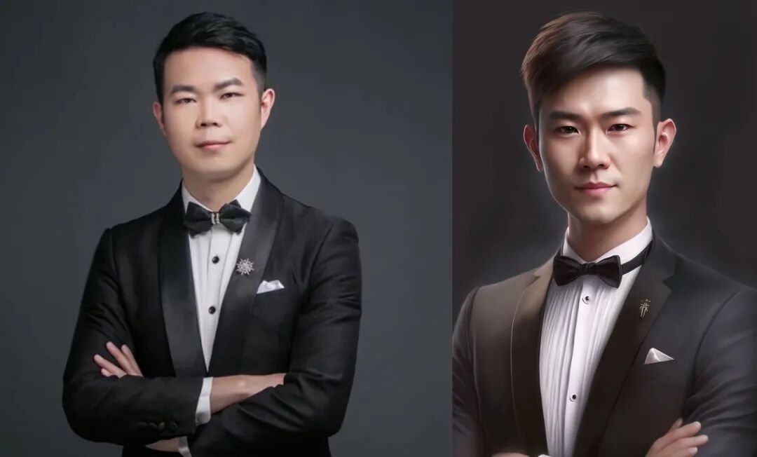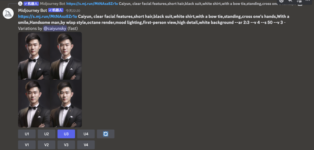 链接.png Caiyun, clear facial features,short hair,black suit,white shirt,with a bow tie,standing,cross one's hands,With a smile,Handsome man,by wlop style,octane render,mood lighting,first-person view,high detail,white background --ar 2:3 --v 4 --s 50