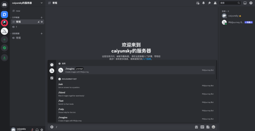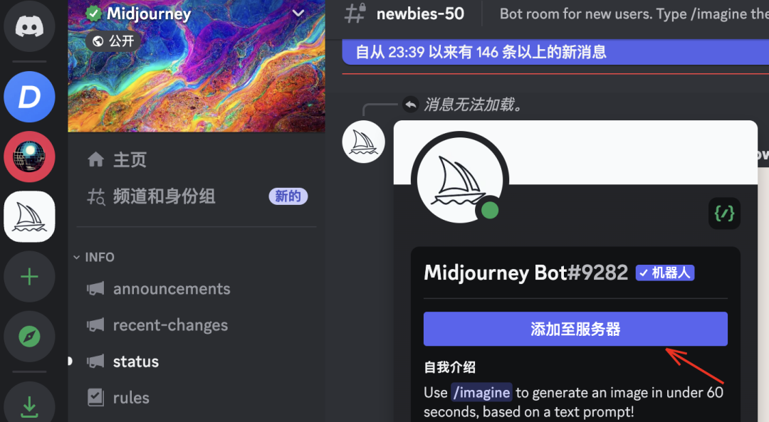 选择亲自创建——仅供我和我的朋友使用。然后在官方群里找到Midjourney机器人,点它头像,点添加至服务器,就可以把机器人加到自己创建的服务器里了