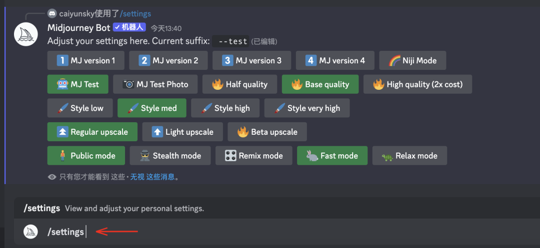 在输入框中输入/settings,然后回车后可以得到它的默认设置页面,可以修改不同预设。也可以在关键词后面加上基础预设,它会自动覆盖掉默认设置。