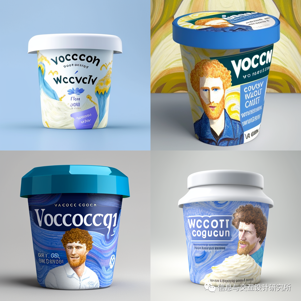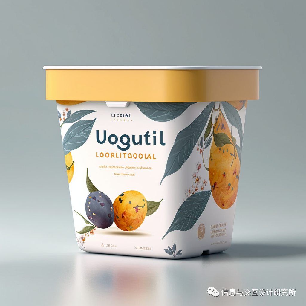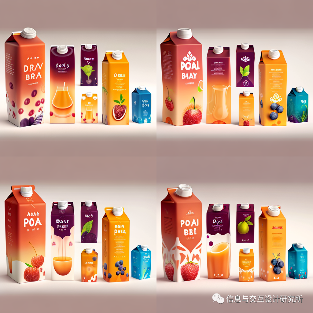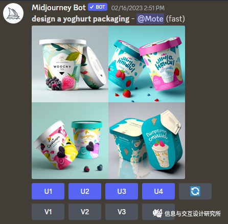 向discord的midjourney模块发送:design a yoghurt packaging(设计一款酸奶包装)命令后,出现图中的四款包装设计图片。
