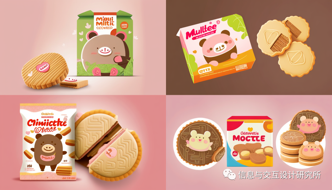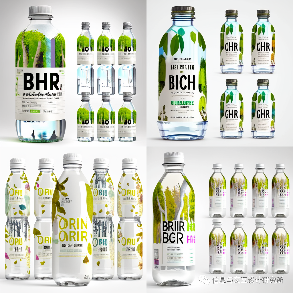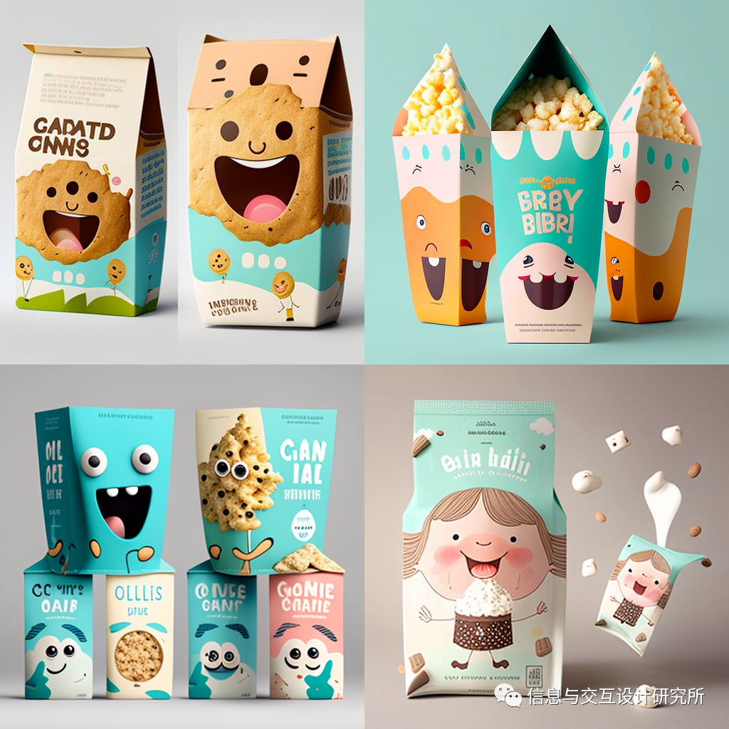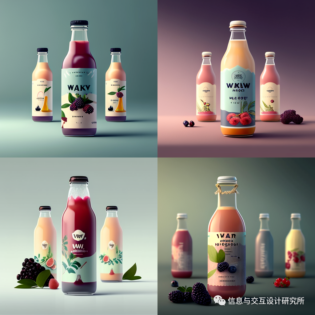 向discord的midjourney模块发送:design a yoghurt packaging(设计一款酸奶包装)命令后,出现图中的四款包装设计图片。