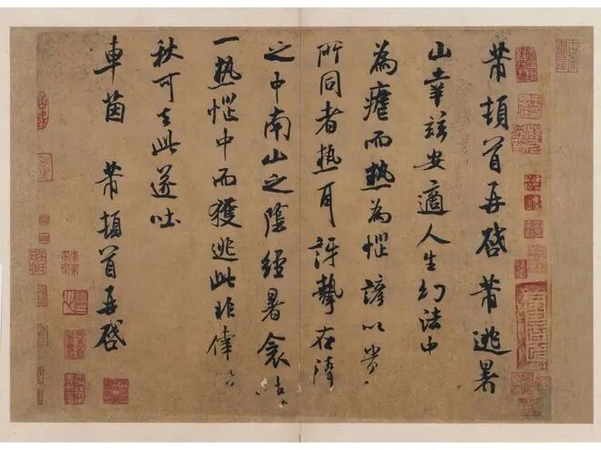 释文:芾顿首再启。芾逃暑□山,幸兹安适。人生幻法中,□□为虐而热而恼。谚以贵□所同者热耳。讶挚在清□之中,南山之阴。经暑衿□一热恼中而获逃此,非幸□□。秋可去此,遂吐车茵。芾顿首再启。