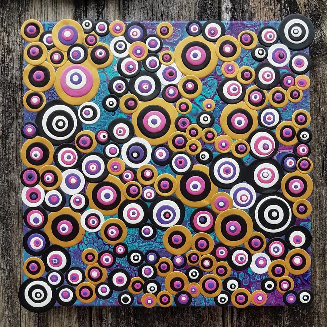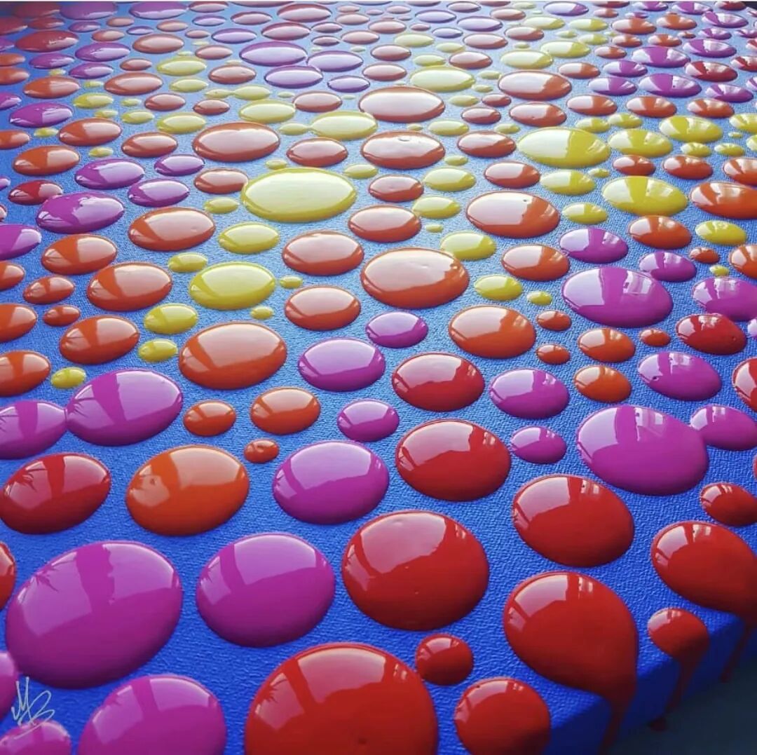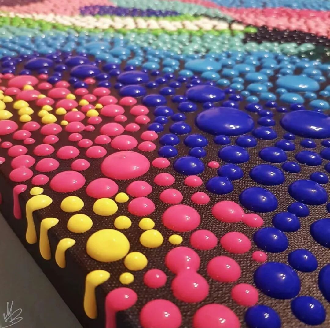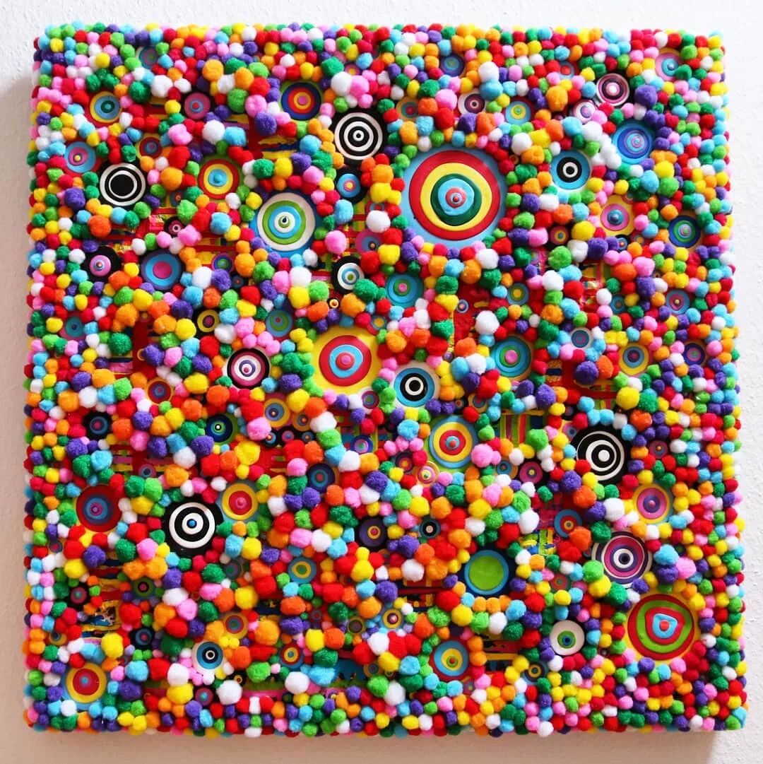 Melanie Burkard在作品中实验性地融合了各种材料:填充物、绒球、小球、白色泡沫。她将丙烯涂料用硅油稀释并制成液体,让颜色在画布上自由流动。这种运动会产生细胞和有机气泡状结构,形成了纯色背景上的斑点,并用干燥器将颜色加厚并分层,从而呈现出浮雕般的结构,创造出 3D 效果。