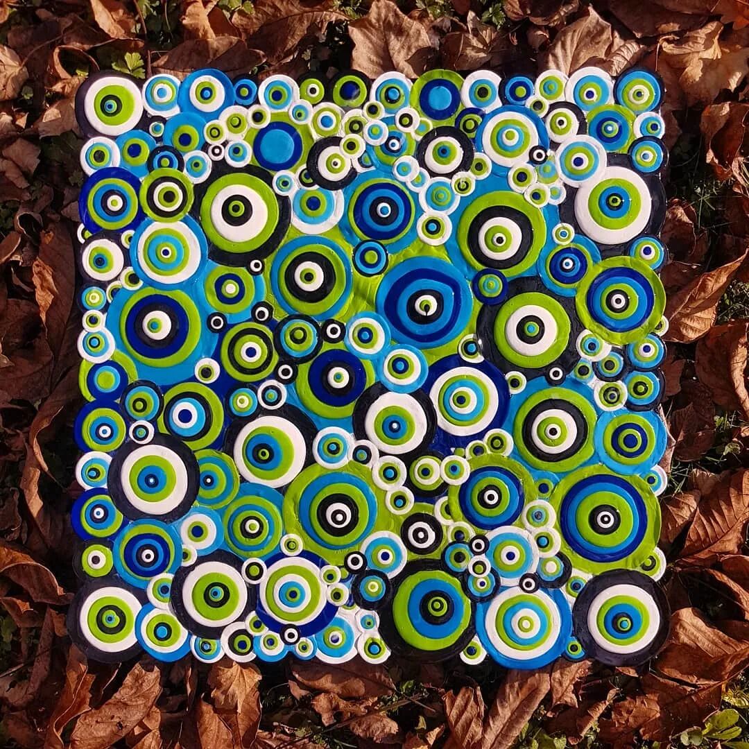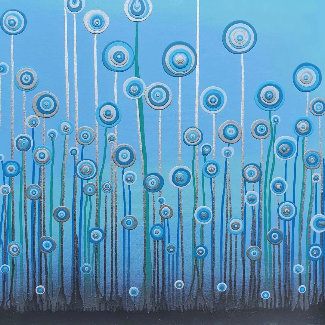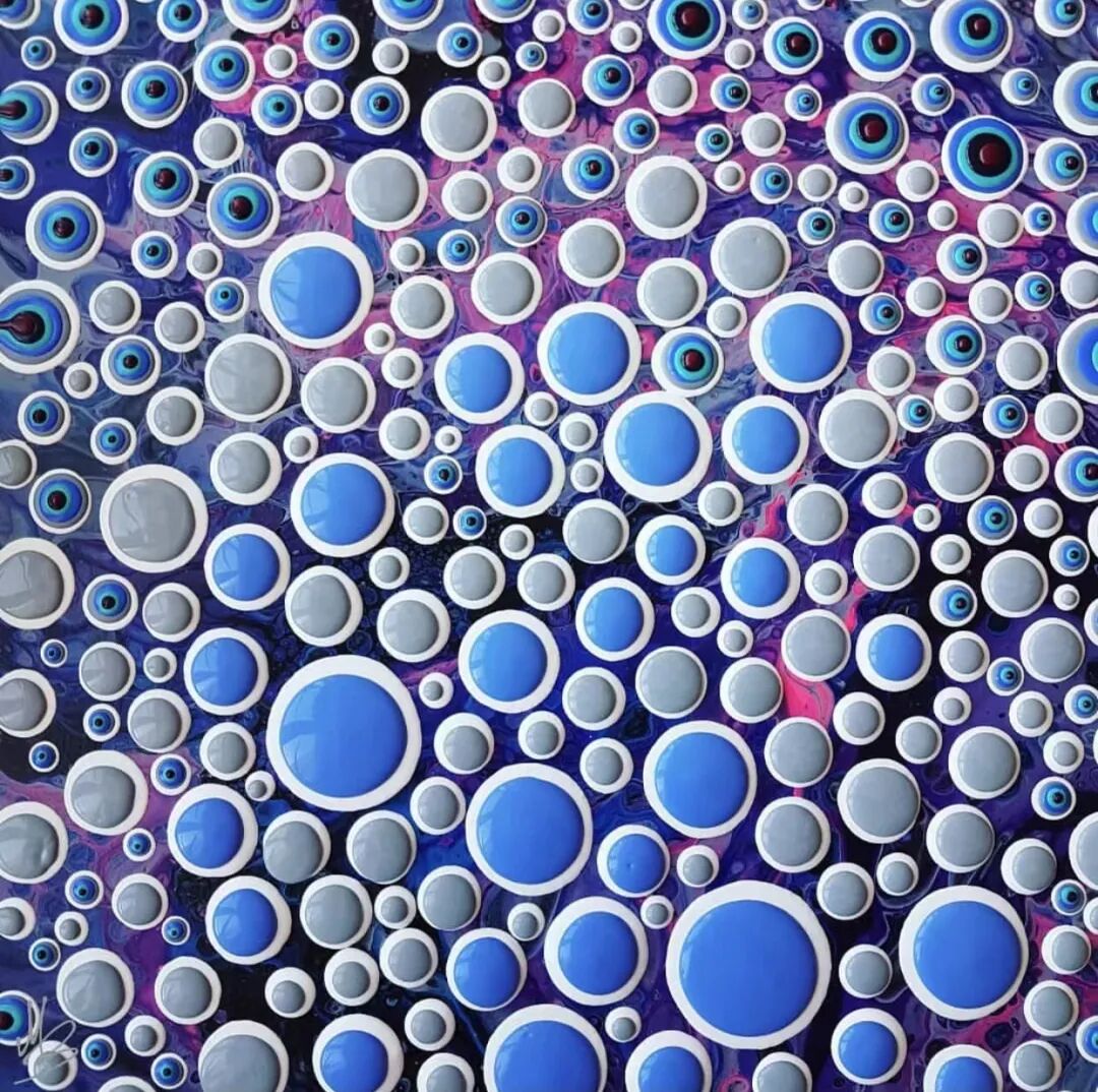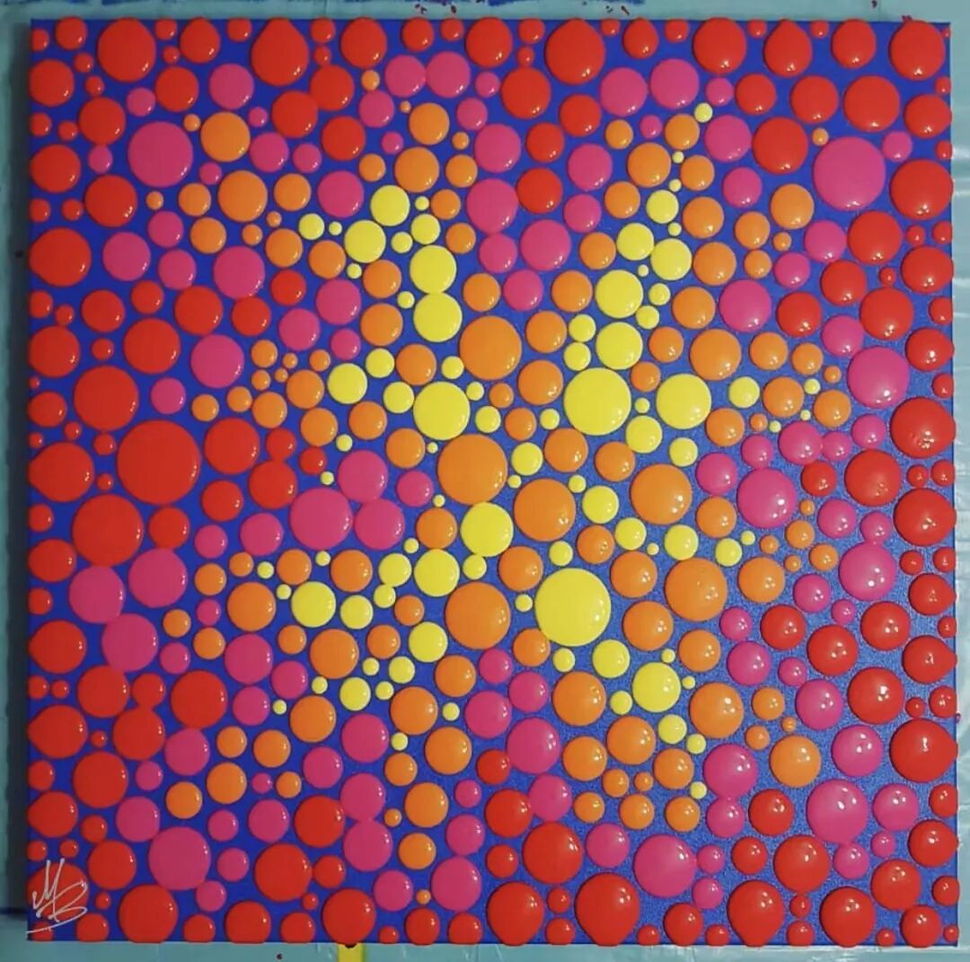 Melanie Burkard在作品中实验性地融合了各种材料:填充物、绒球、小球、白色泡沫。她将丙烯涂料用硅油稀释并制成液体,让颜色在画布上自由流动。这种运动会产生细胞和有机气泡状结构,形成了纯色背景上的斑点,并用干燥器将颜色加厚并分层,从而呈现出浮雕般的结构,创造出 3D 效果。