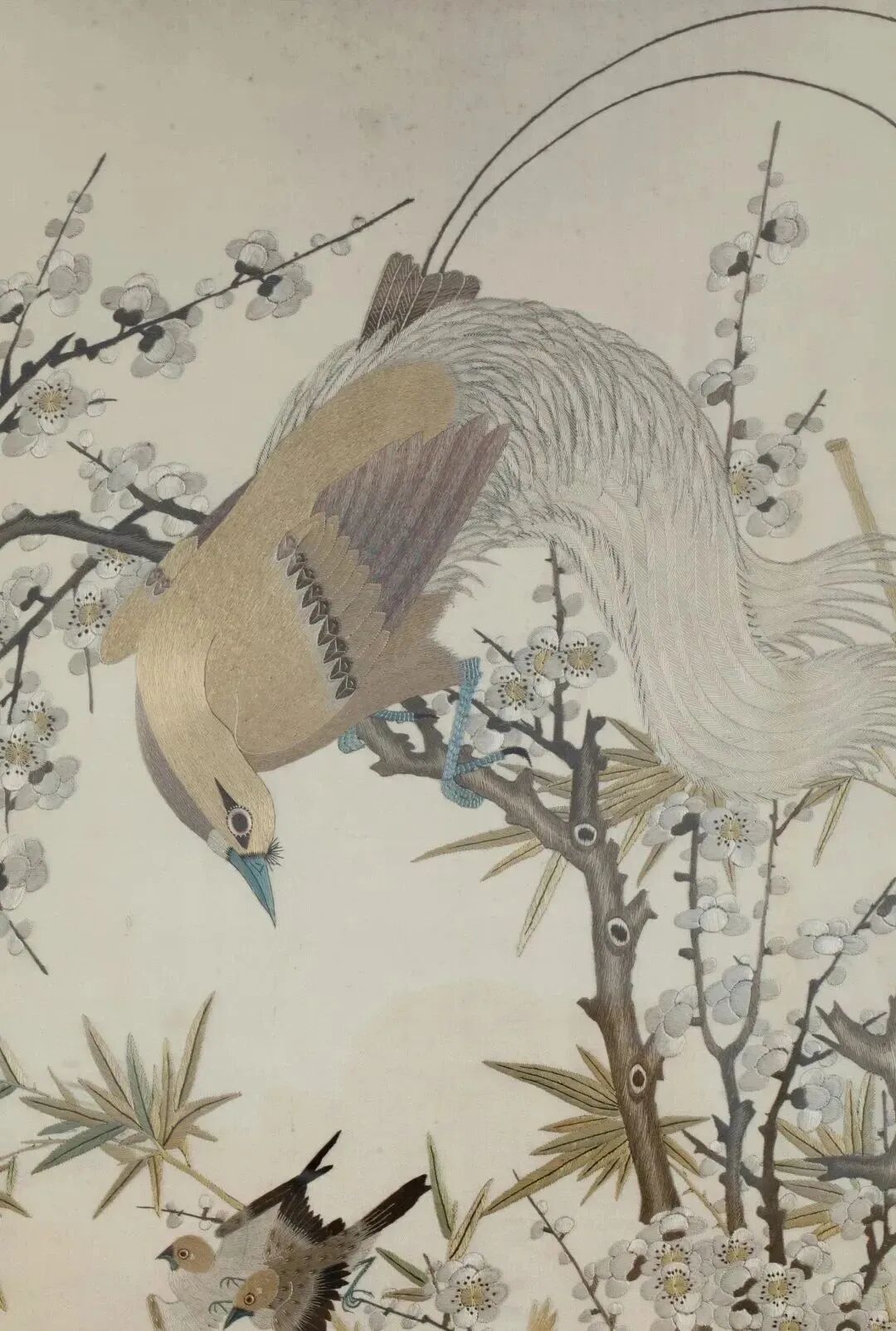 1867年巴黎世博会上展出的花鸟主题点翠刺绣屏风/V&A博物馆藏