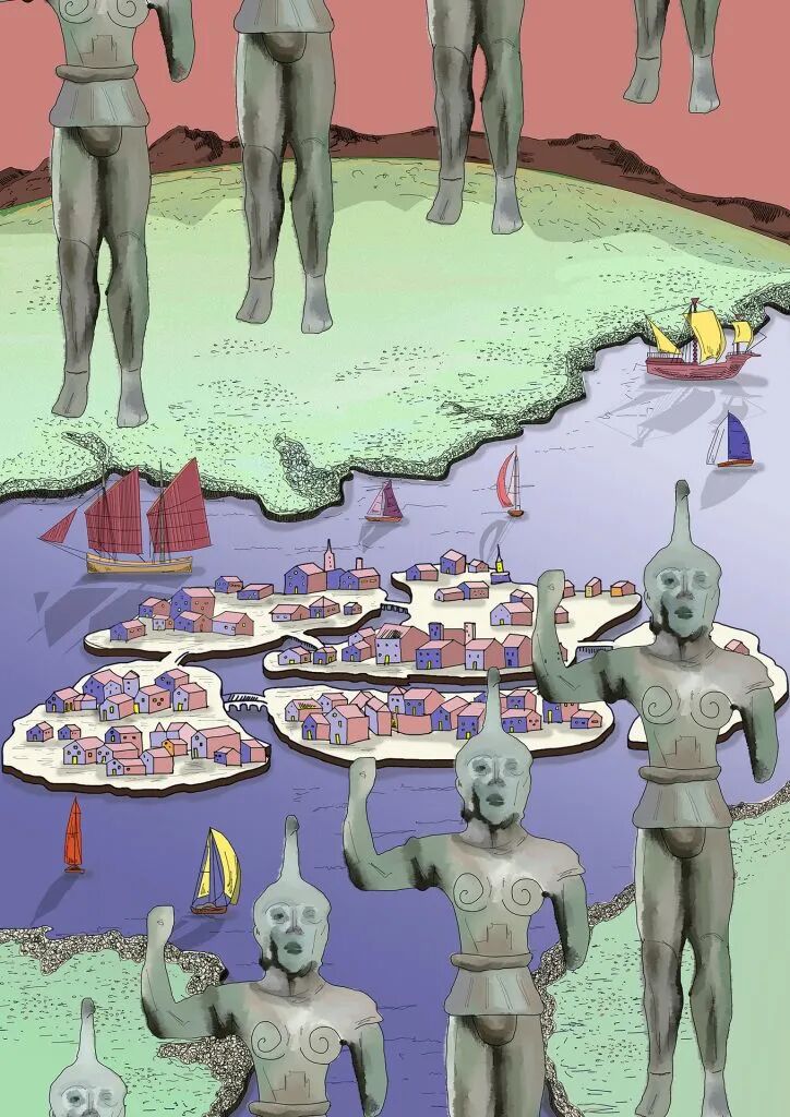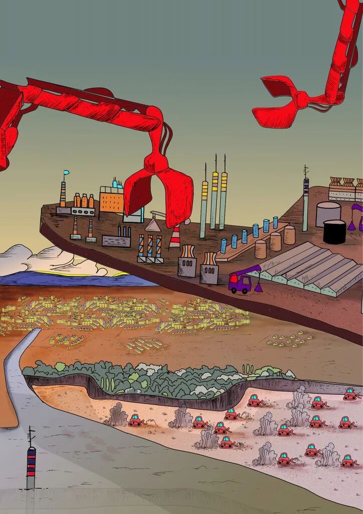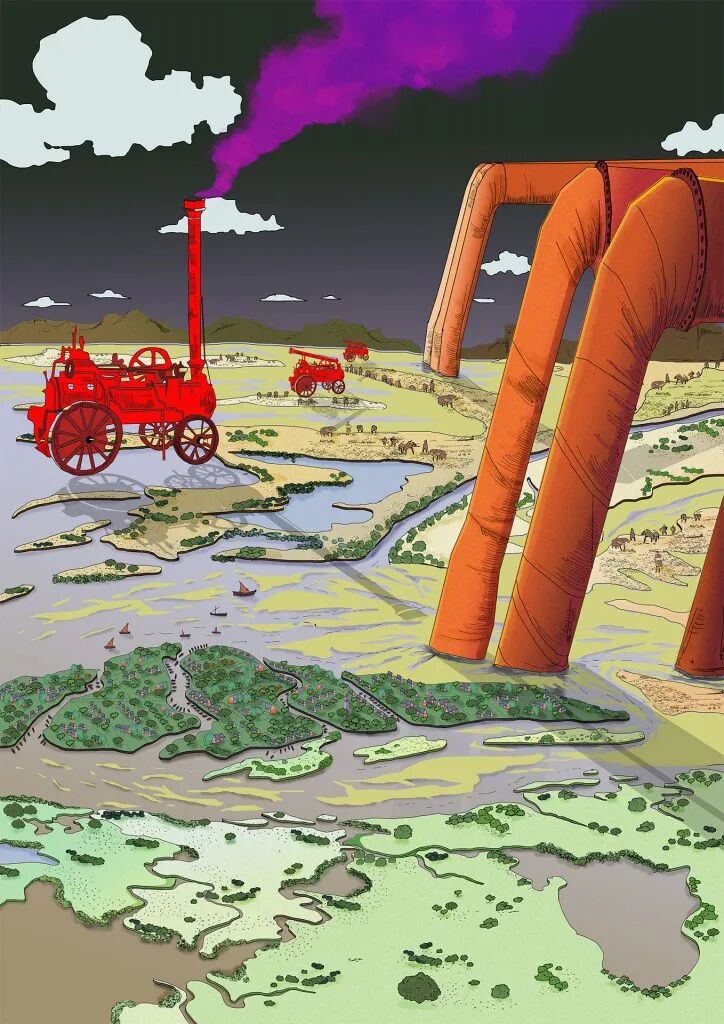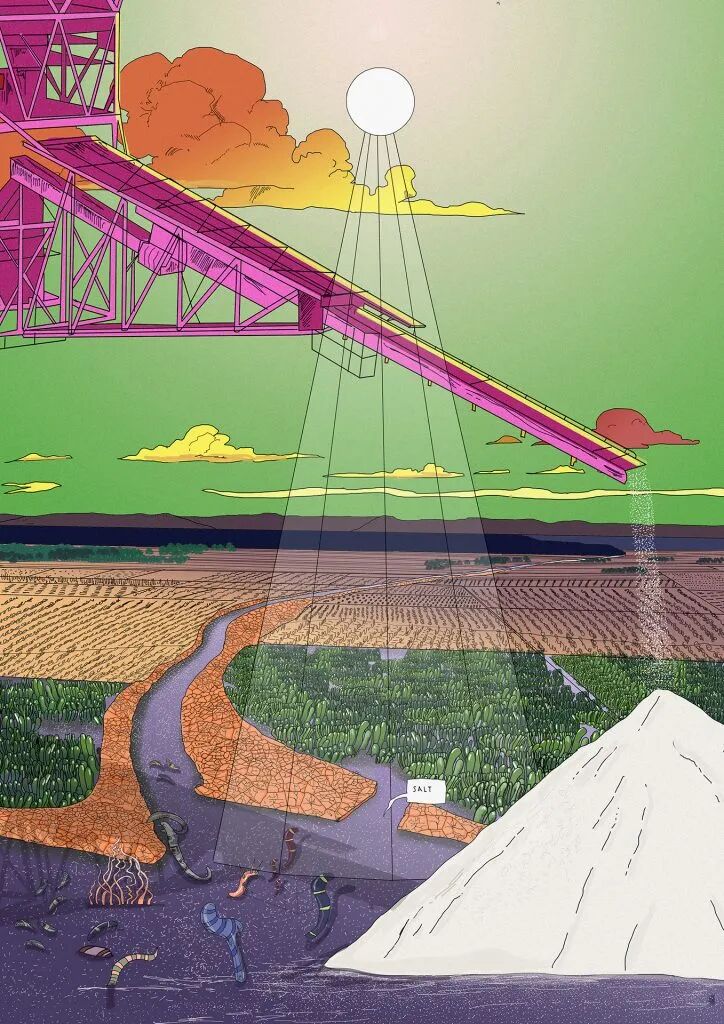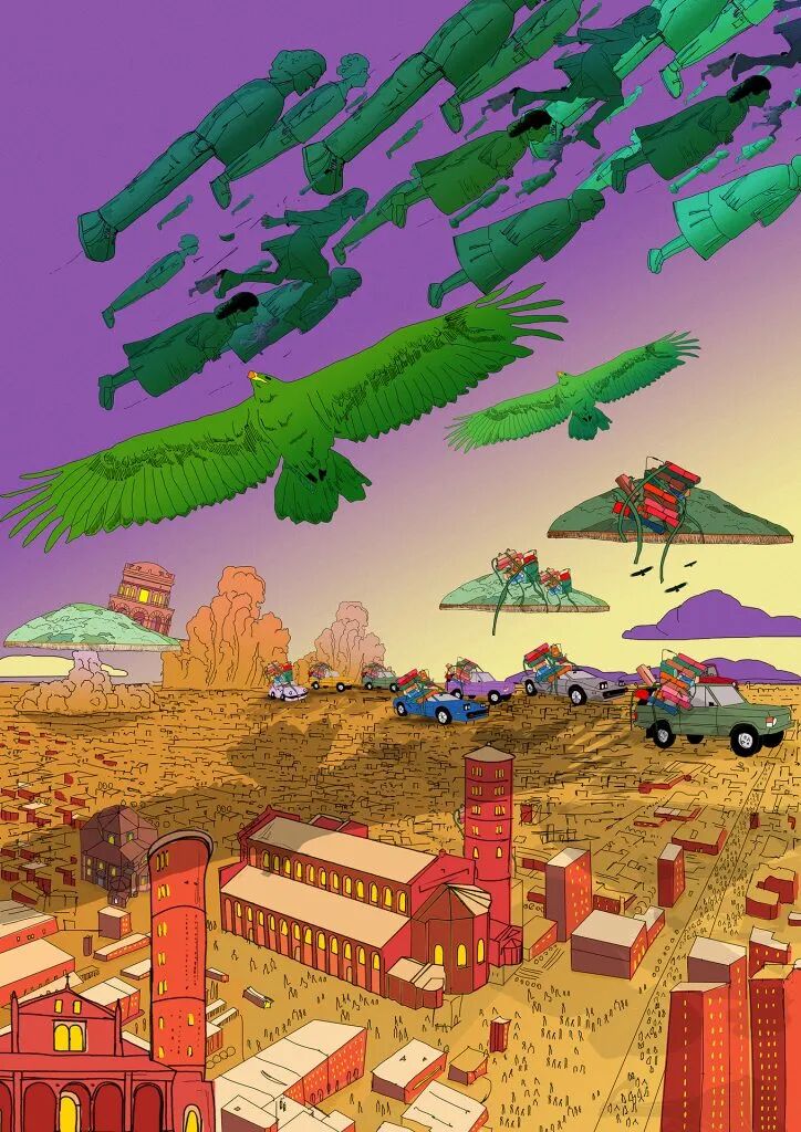 A: 每幅插画都描述了一个特定的主题和事实,因此可以阅读与其故事无关的内容。我们把每一幅插画想象成一张海报,上面有标题和副标题,可以在街上看到,就像一部新手机的广告一样,宣传世界上正在发生的事情。这一系列插画的叙述跨越了从过去到2100年的时间线,并希望讲述一个以拉文纳市为样本城市的故事,因为拉文纳市深受气候变化加速的影响,特别是海平面上升的风险。其目的是提出问题和促进反思,让人们意识到这些问题:作品引发的情感可能会产生影响,并使其行动或至少引起兴趣。