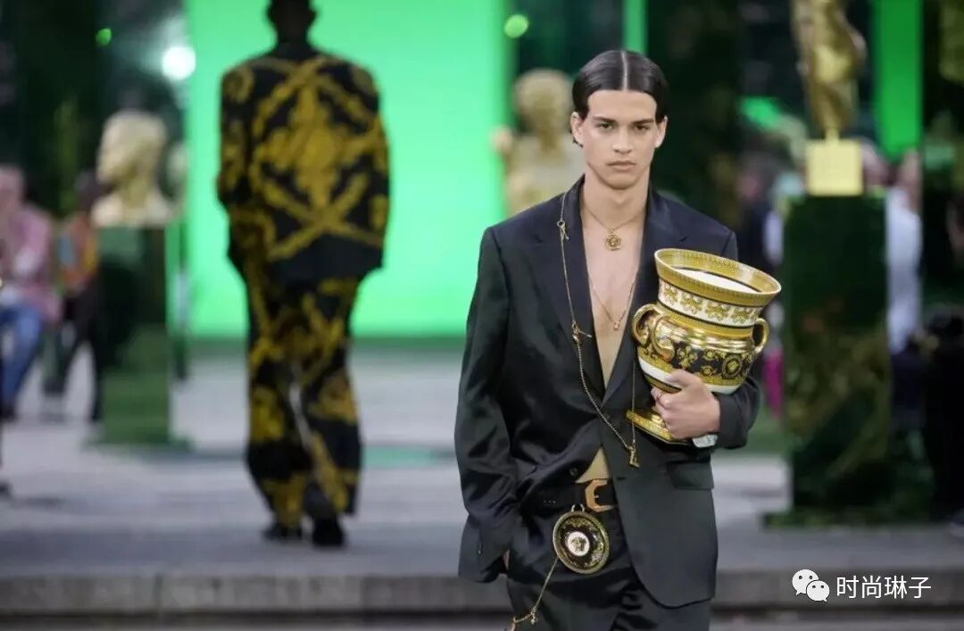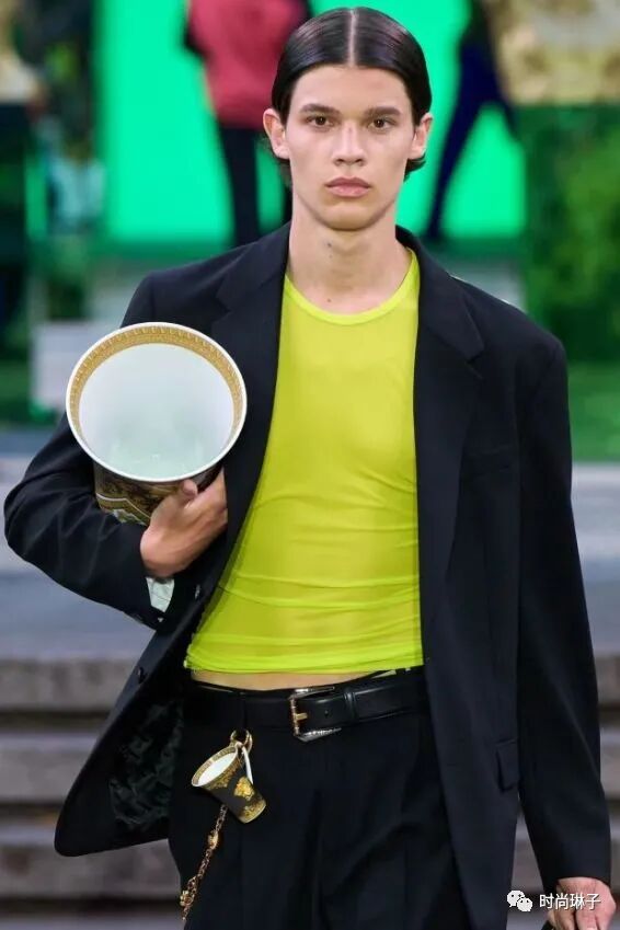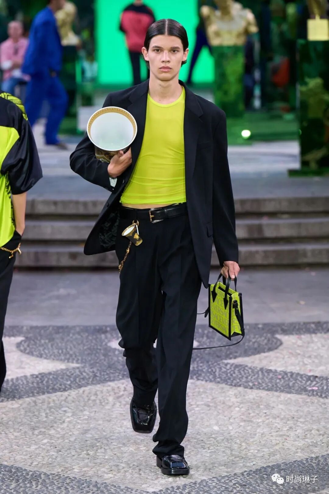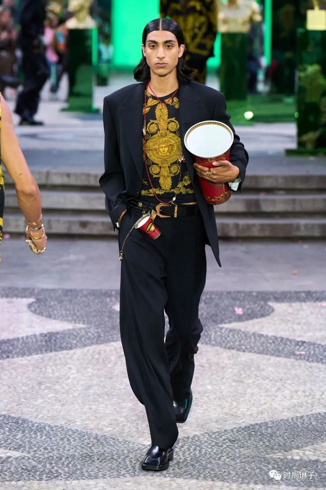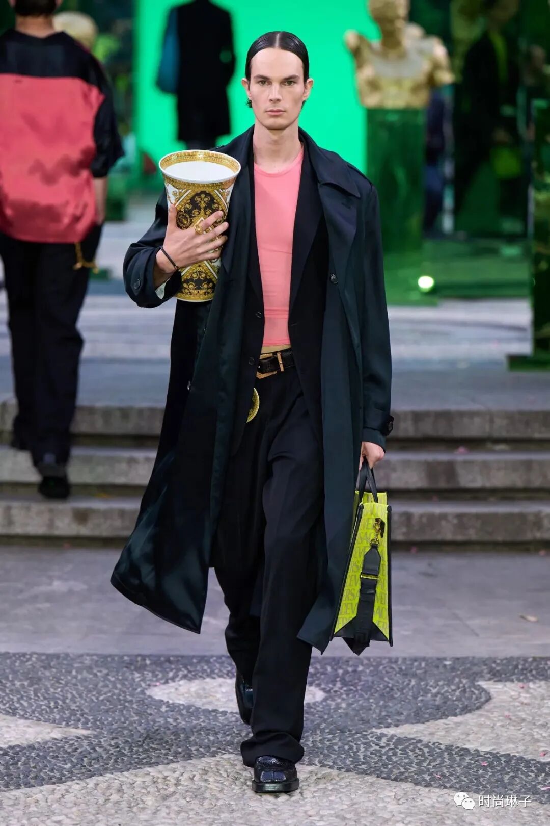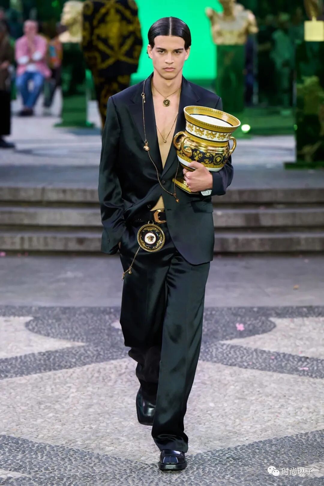 VERSACE 2023春夏男装系列中家居用品作为配件,有趣而正式,以多元风格冲击视觉界限。
