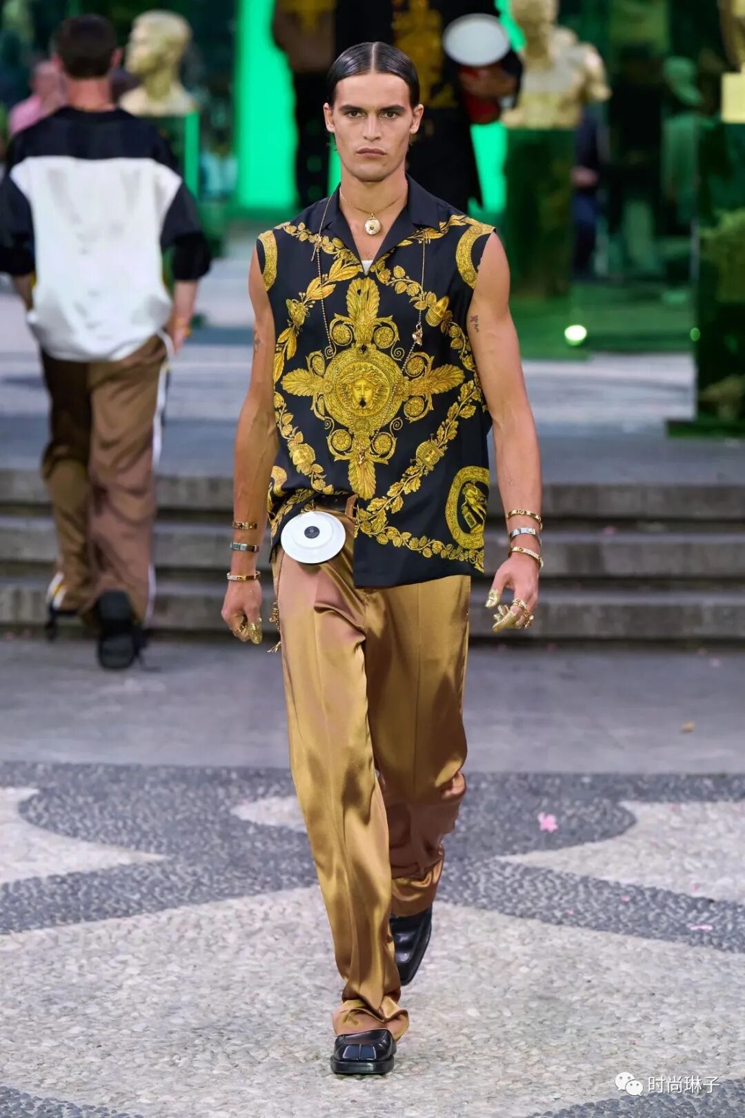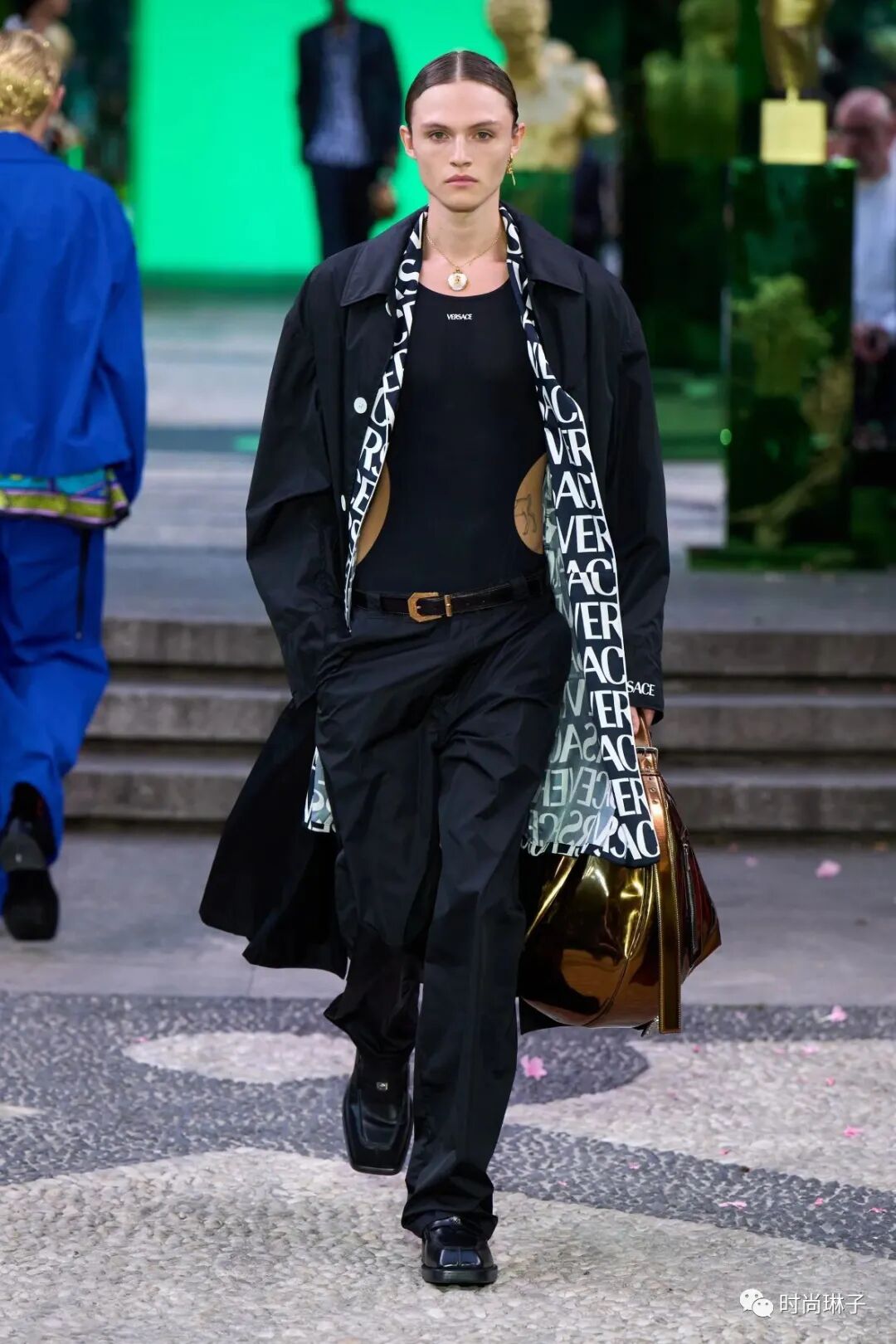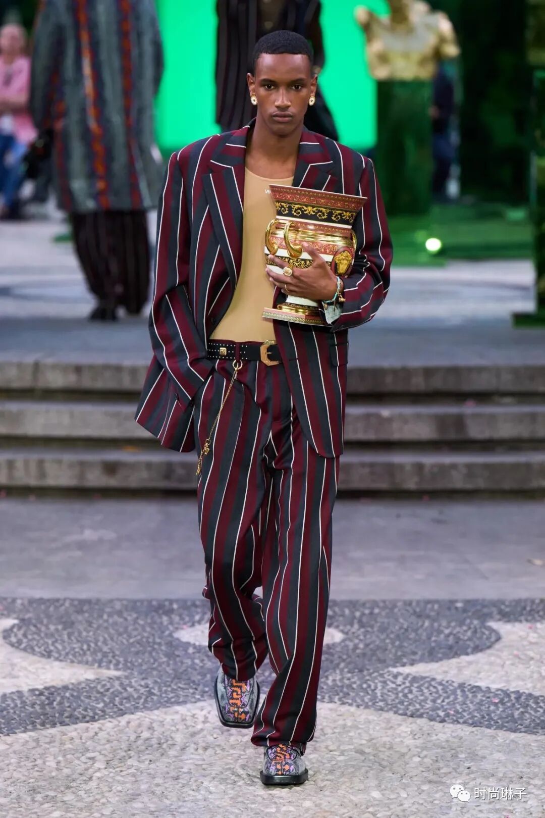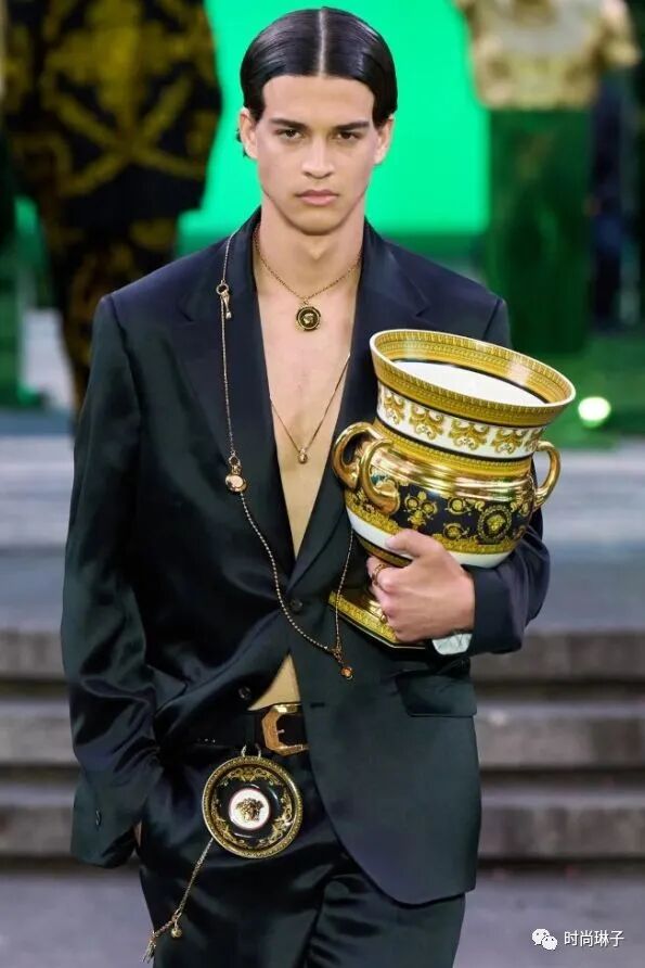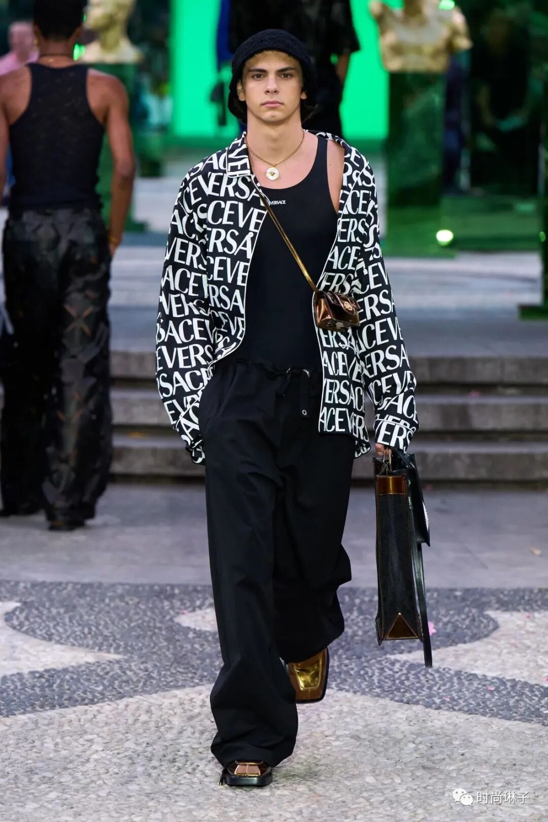 VERSACE 2023春夏男装系列中家居用品作为配件,有趣而正式,以多元风格冲击视觉界限。
