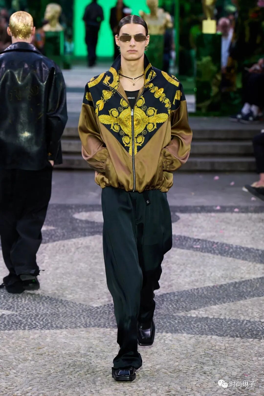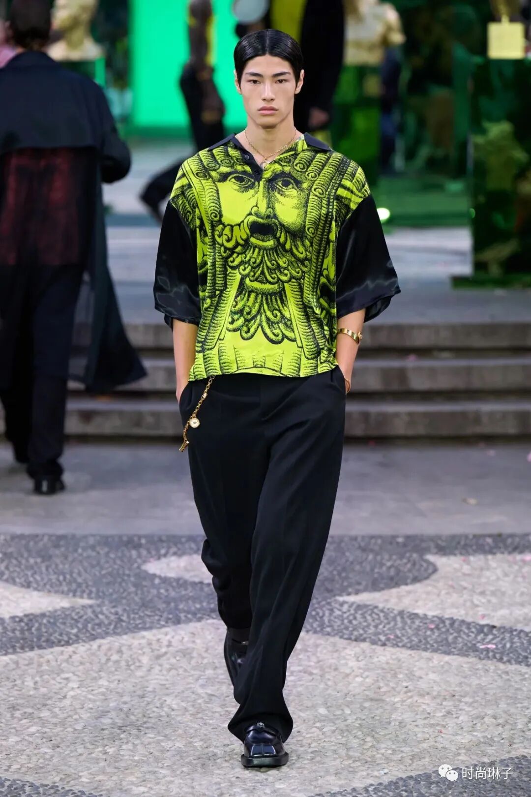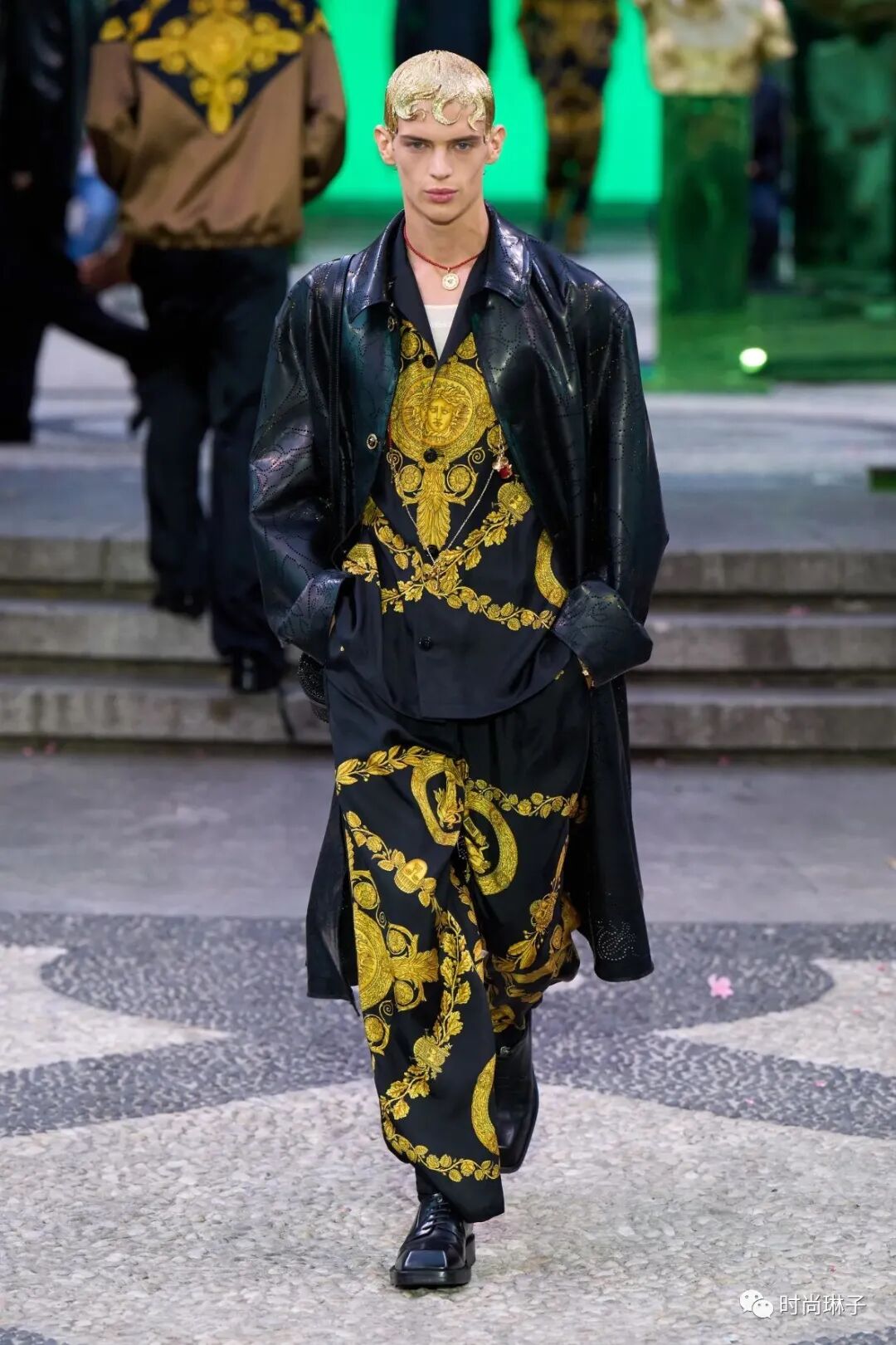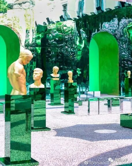 范思哲VERSACE 2023春夏男装秀在品牌位于米兰Via Gesù 12号的总部庭院内举行,以复古绿色的镜面艺术空间为背景,古典主义的方形高柱上放置如古罗马时代的金色半身雕塑,一些模特头戴3D的金色发饰,穿梭在这极具现代感但又好似庞贝古城的“新遗址”内,展示范思哲VERSACE的全新男士系列。