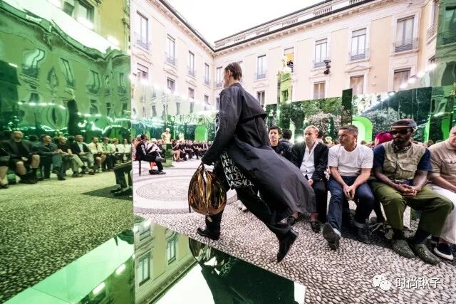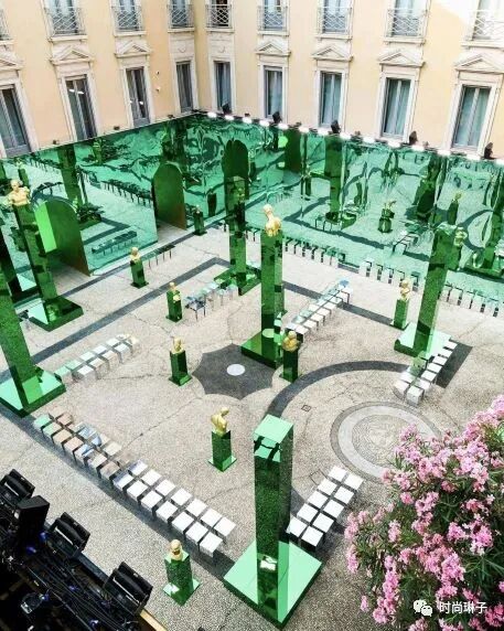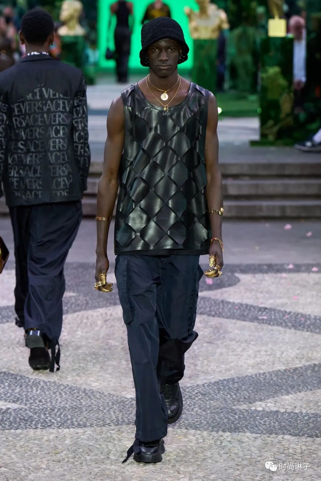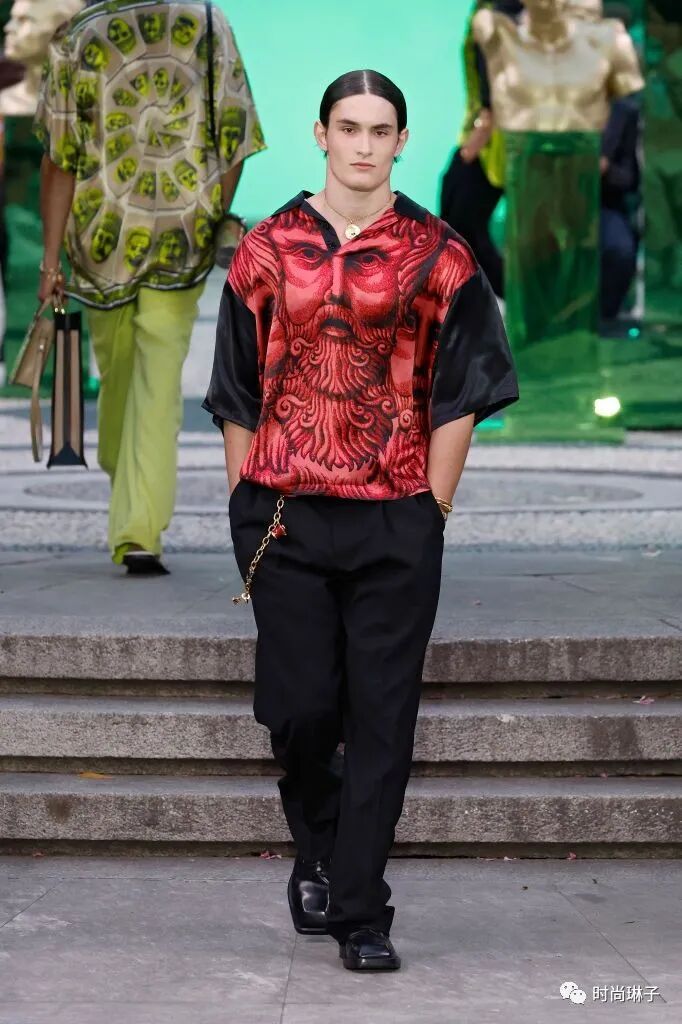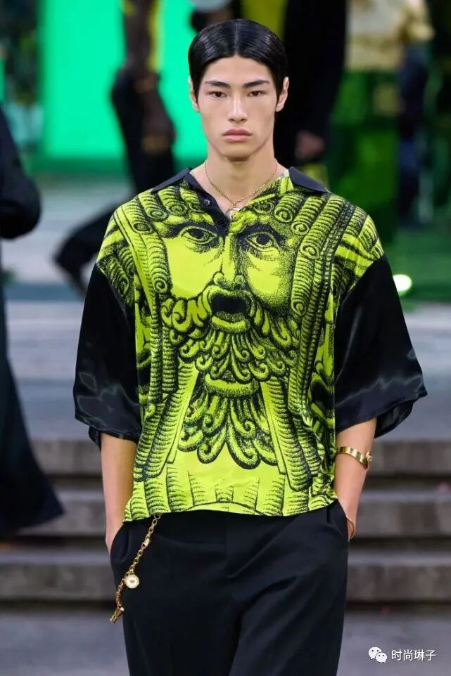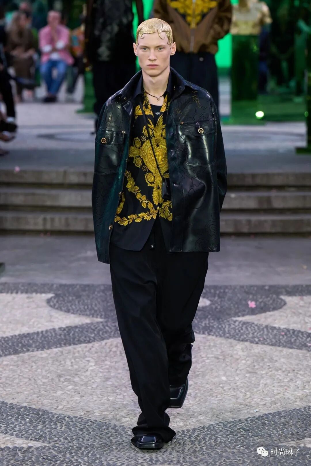 范思哲VERSACE 2023春夏男装秀在品牌位于米兰Via Gesù 12号的总部庭院内举行,以复古绿色的镜面艺术空间为背景,古典主义的方形高柱上放置如古罗马时代的金色半身雕塑,一些模特头戴3D的金色发饰,穿梭在这极具现代感但又好似庞贝古城的“新遗址”内,展示范思哲VERSACE的全新男士系列。