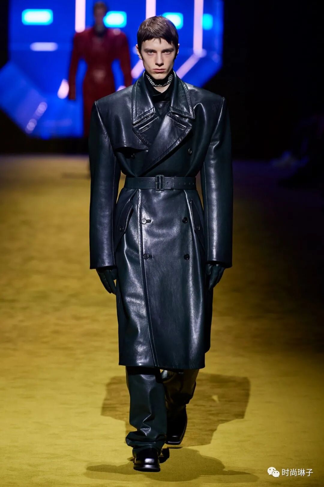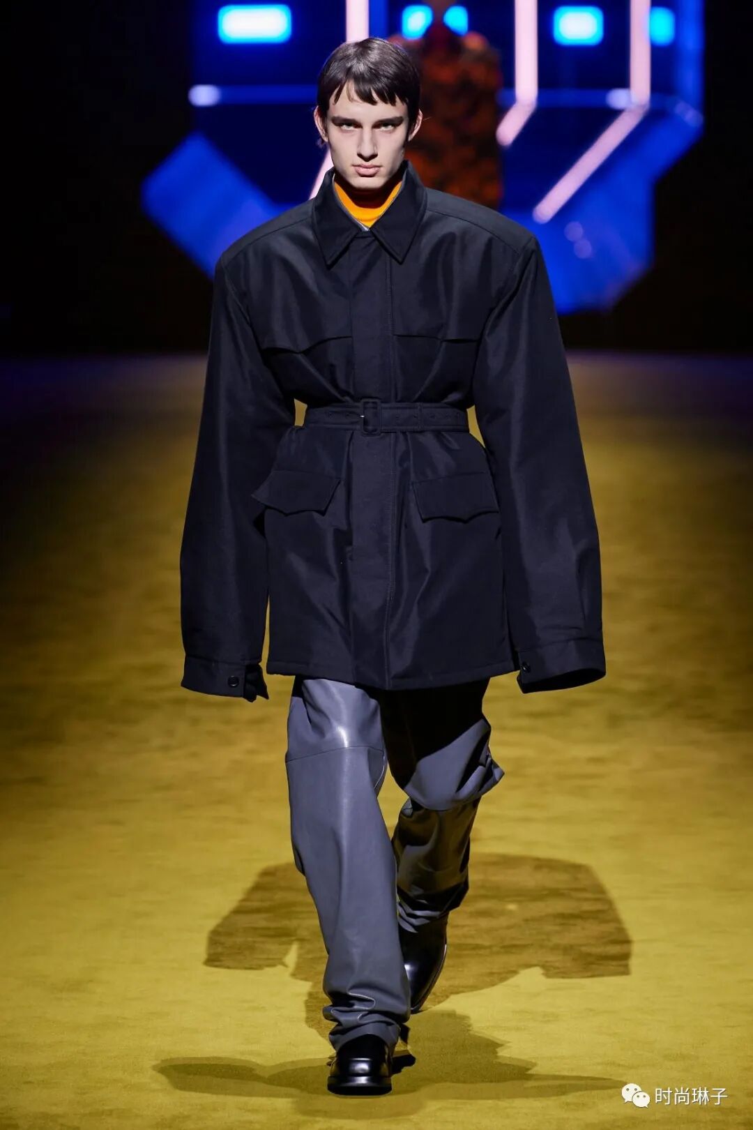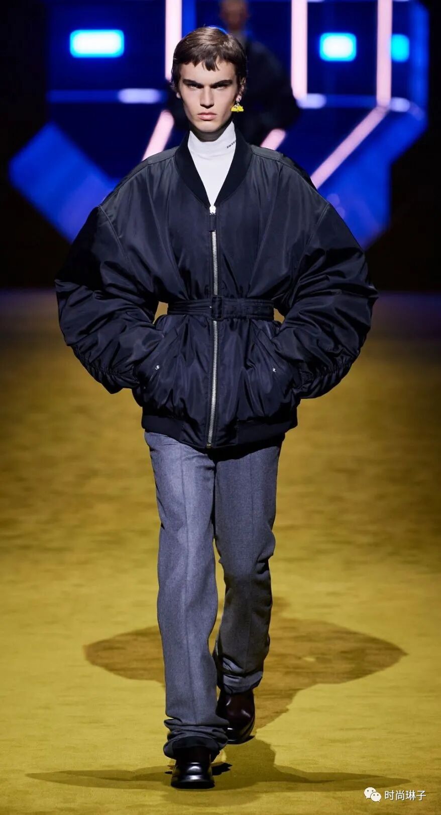 Prada普拉达2022秋冬男装系列中的夹克、飞行员夹克和风衣搭配腰带,和宽肩的造型对比,更强调倒三角的腰部塑形。