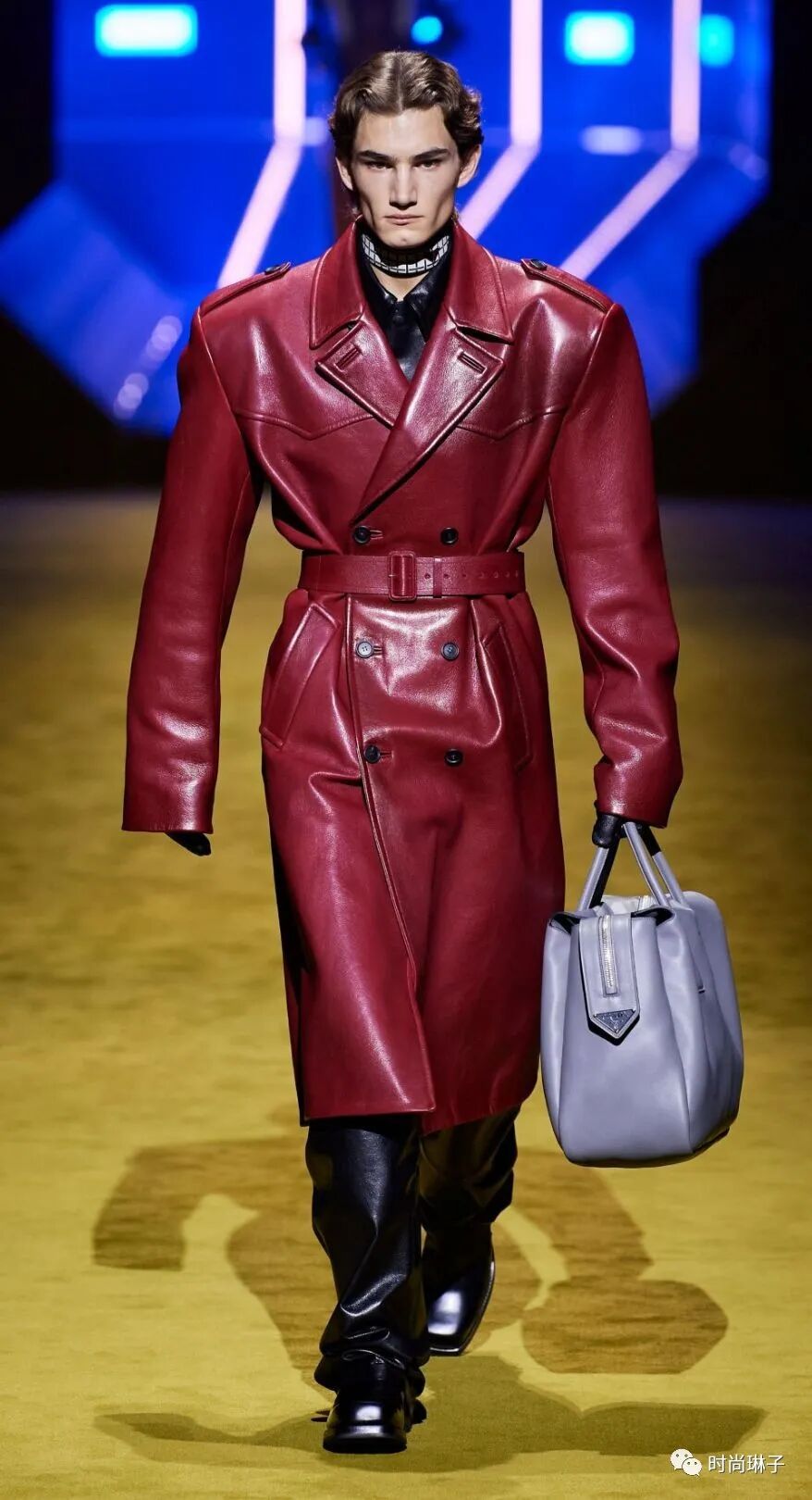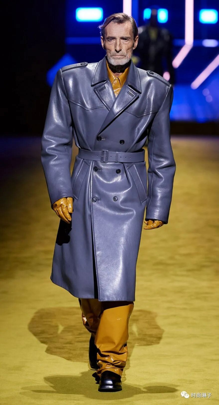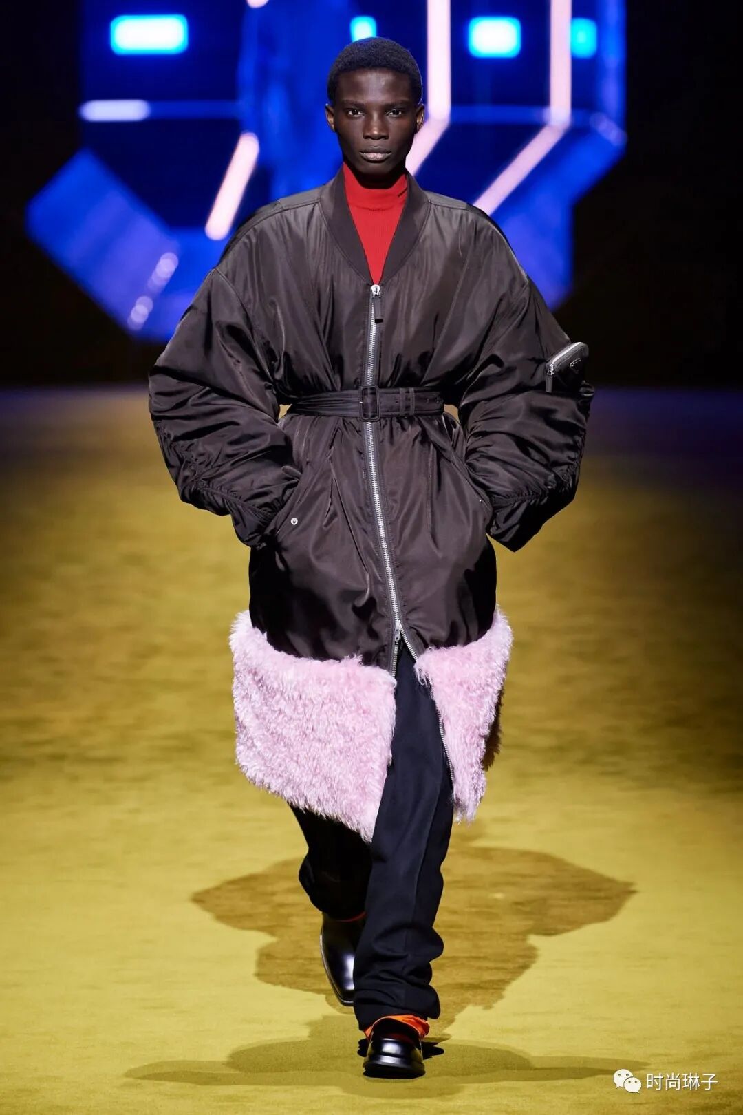 Prada普拉达2022秋冬男装系列中的夹克、飞行员夹克和风衣搭配腰带,和宽肩的造型对比,更强调倒三角的腰部塑形。