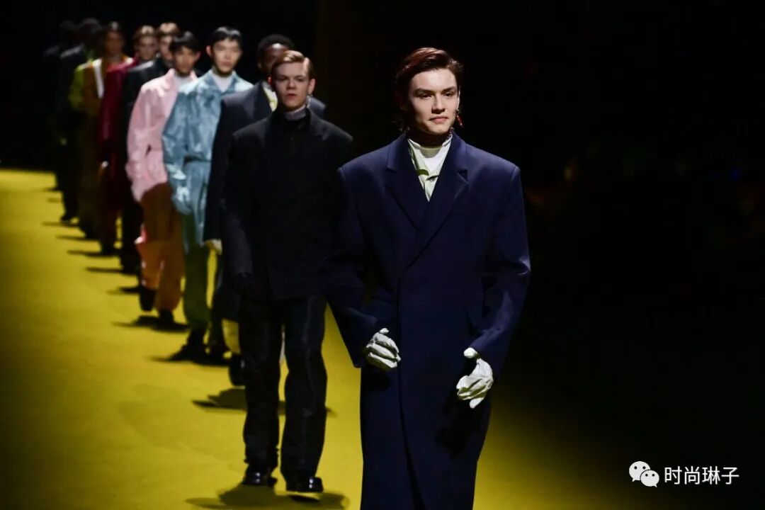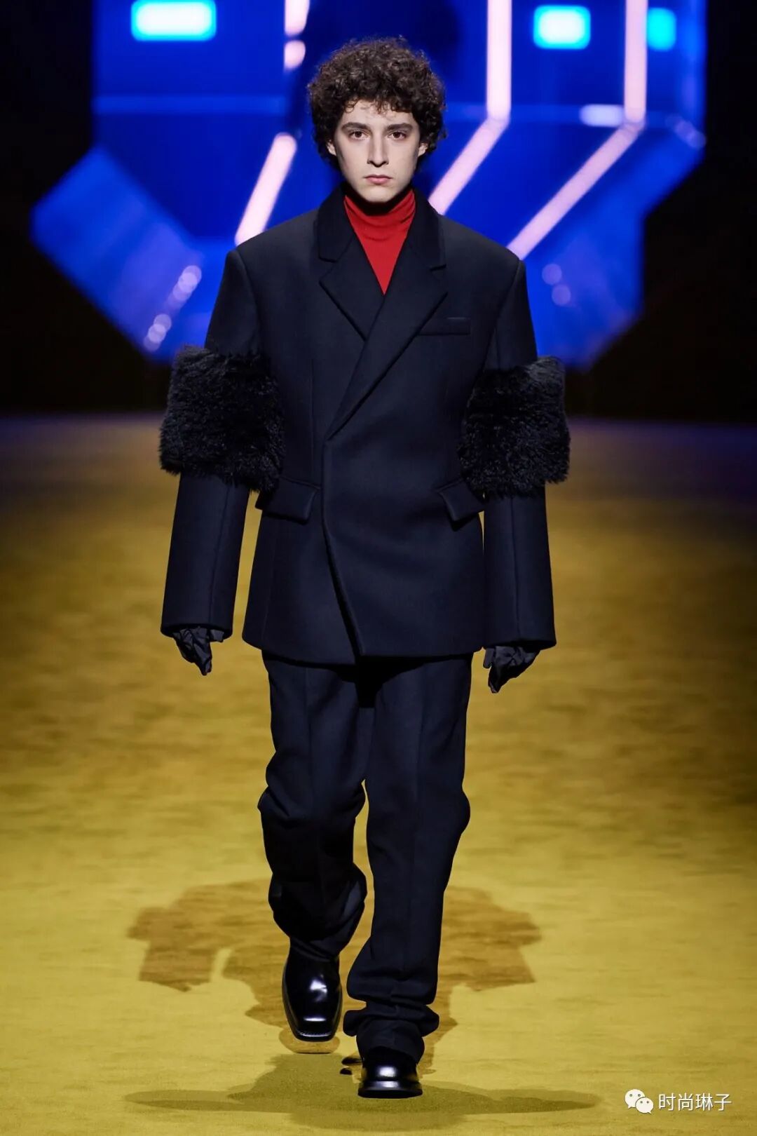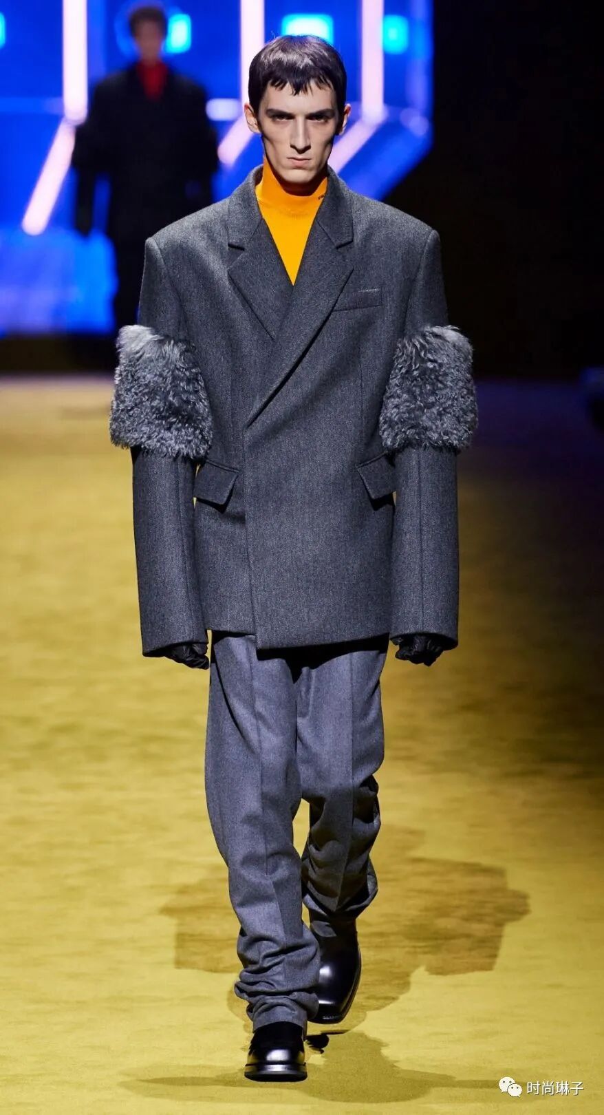 超宽的肩线造型没有从时尚视野中消失,该季Prada普拉达具有军官魅力的大衣,西装外套和夹克,以及宽肩毛衫被定义为男性的现代盔甲,十分硬朗。