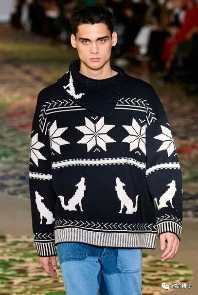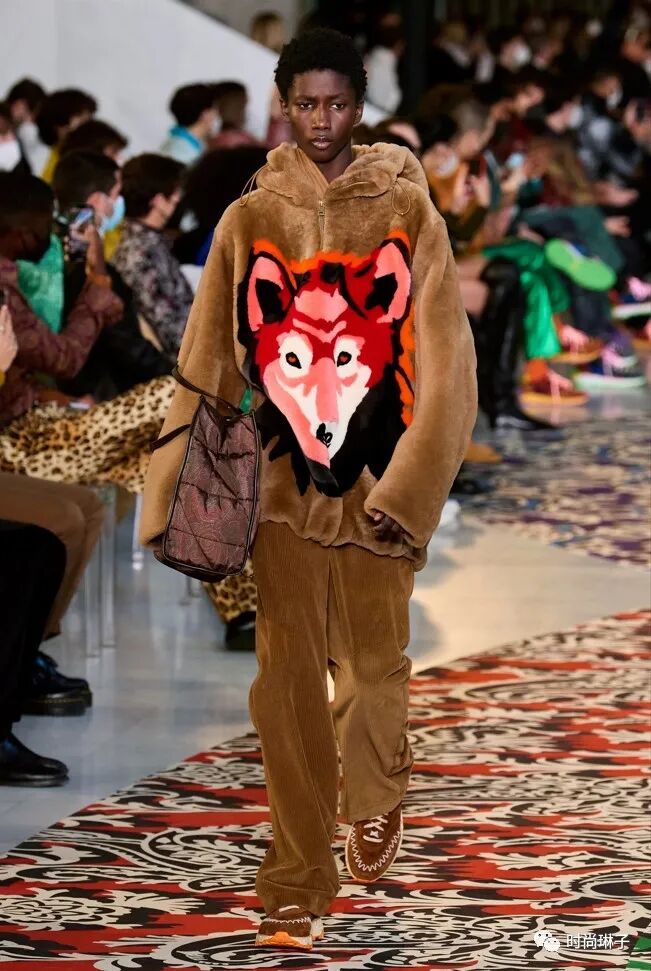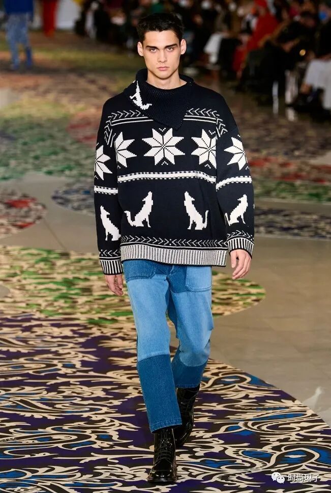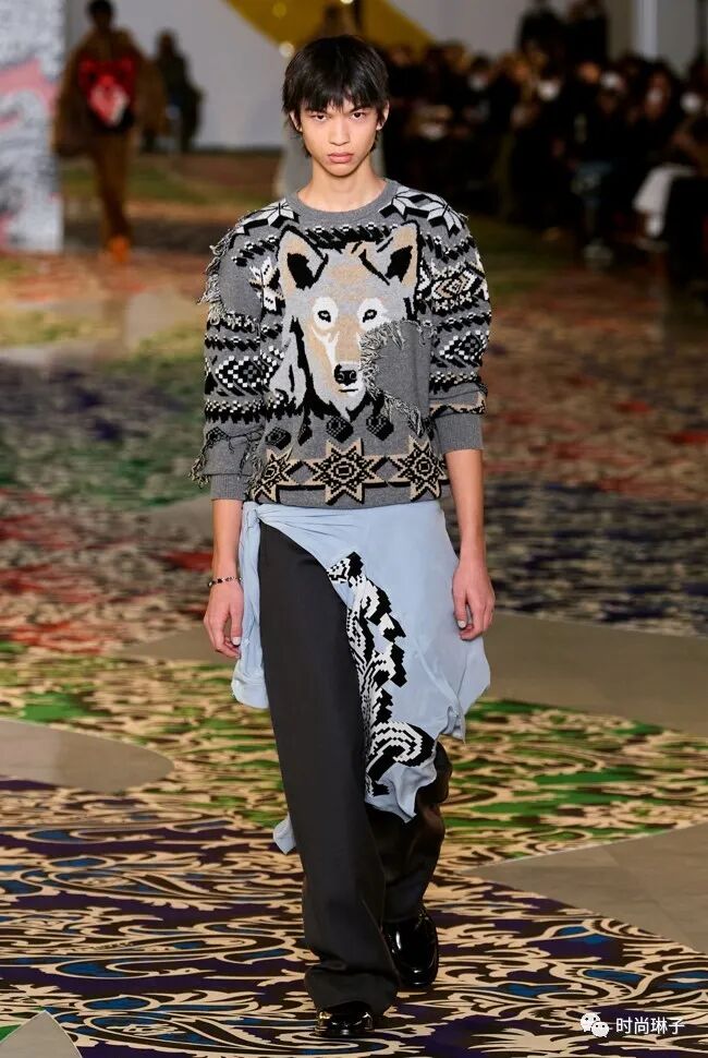 狼,作为品牌自2020年起与世界自然基金会WWF合作保护的动物,通过镶嵌装饰或提花设计展现在该季的服饰上。