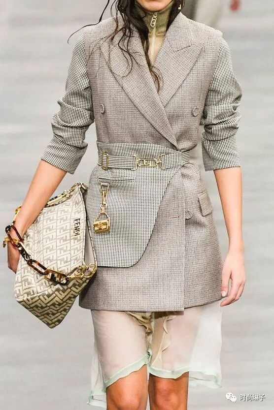 解构的胸衣造型搭配衬衫或立领上衣,凸显了芬迪女性的独特之美。