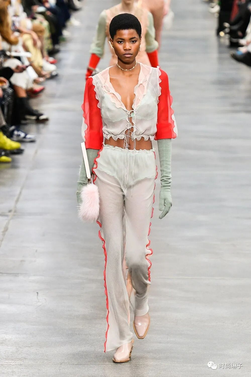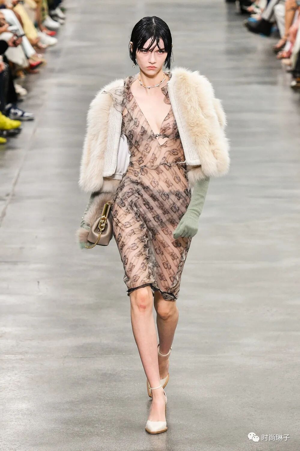 透明薄纱裙搭配80年代风格的皮草外套,性感中带着一丝妩媚。