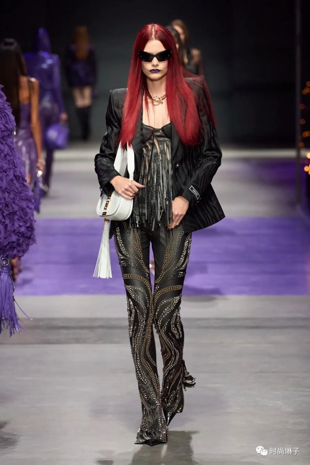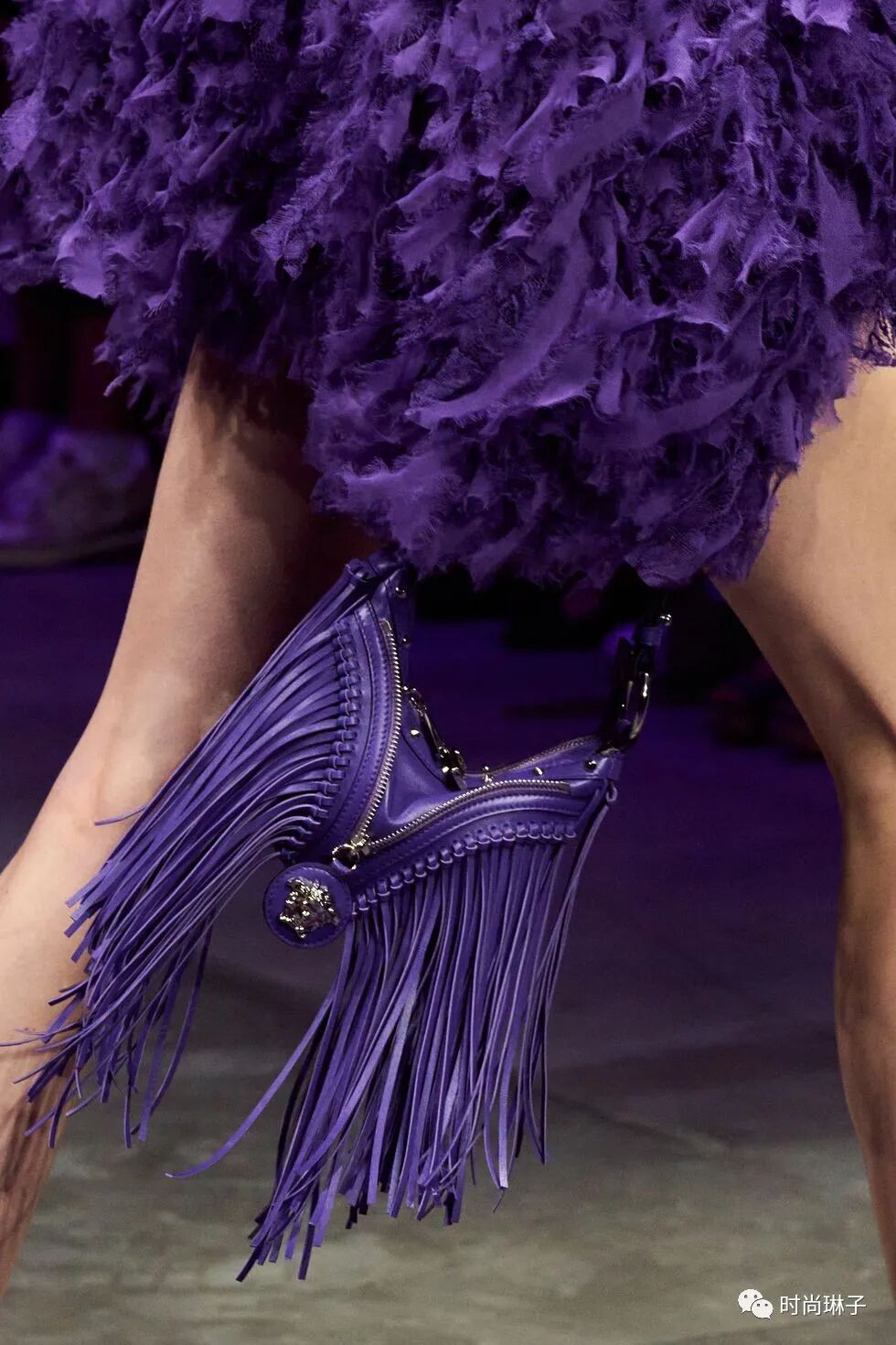 范思哲Versace 2023春夏系列中的配饰从紫色流苏包,到厚底高跟鞋……一系列包款和鞋履为该季增添了崭新的叛逆色彩。