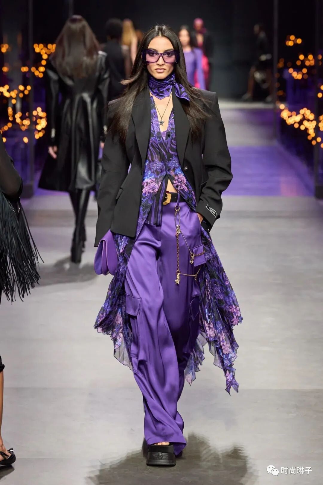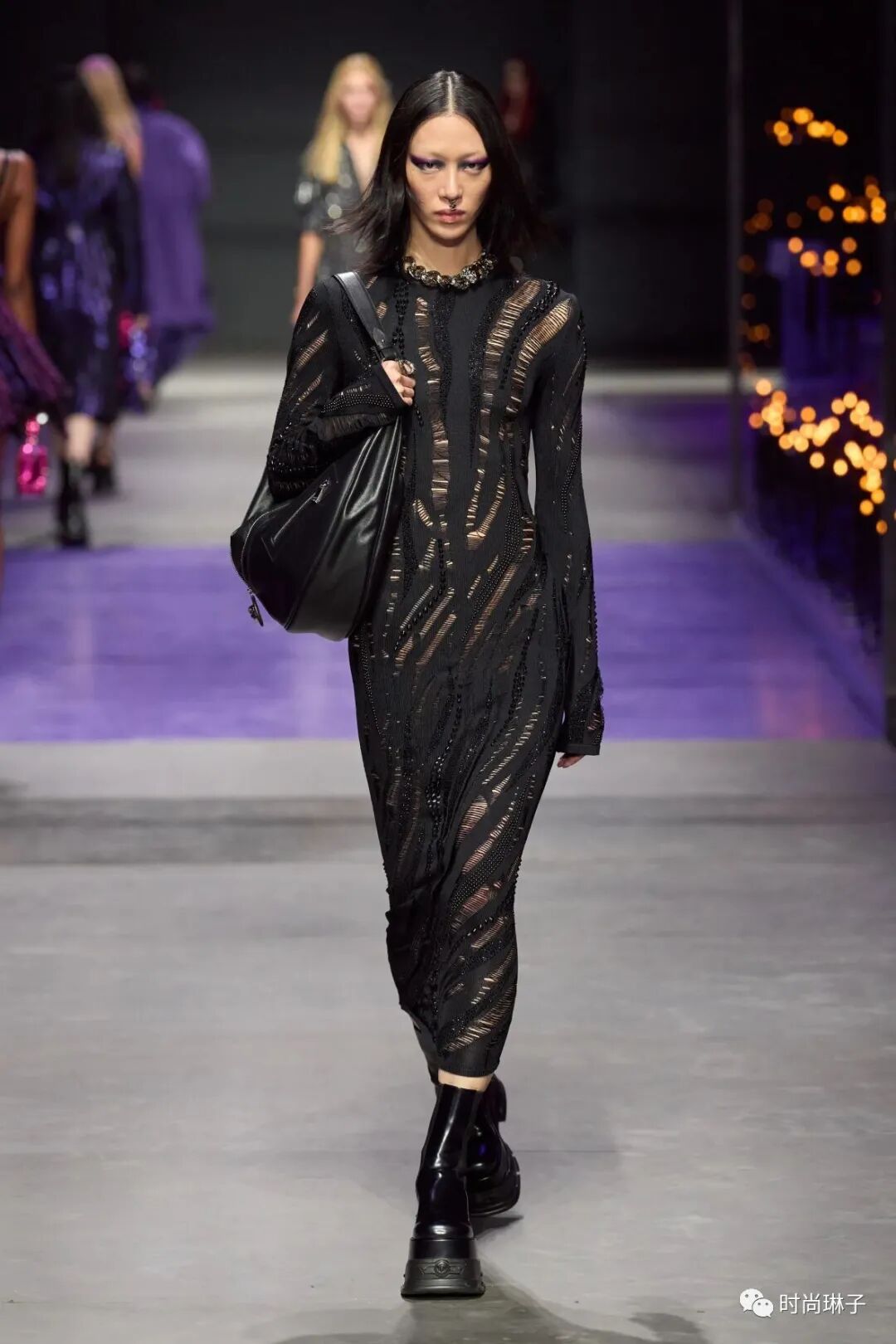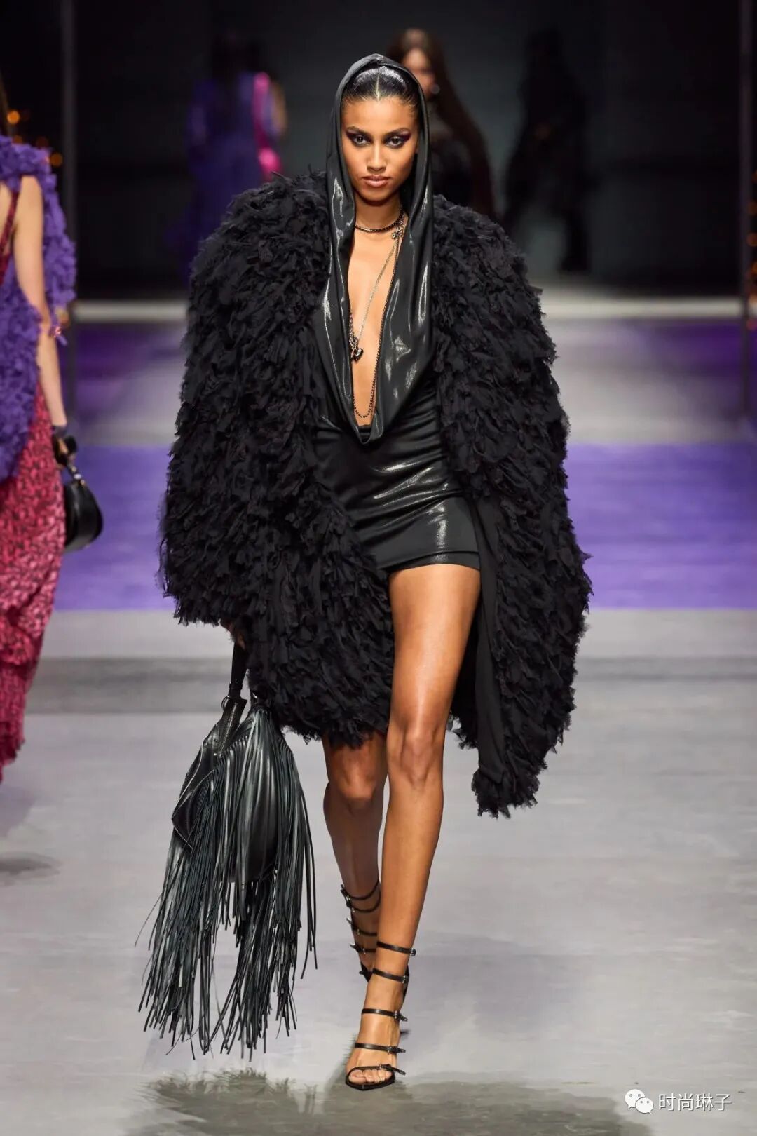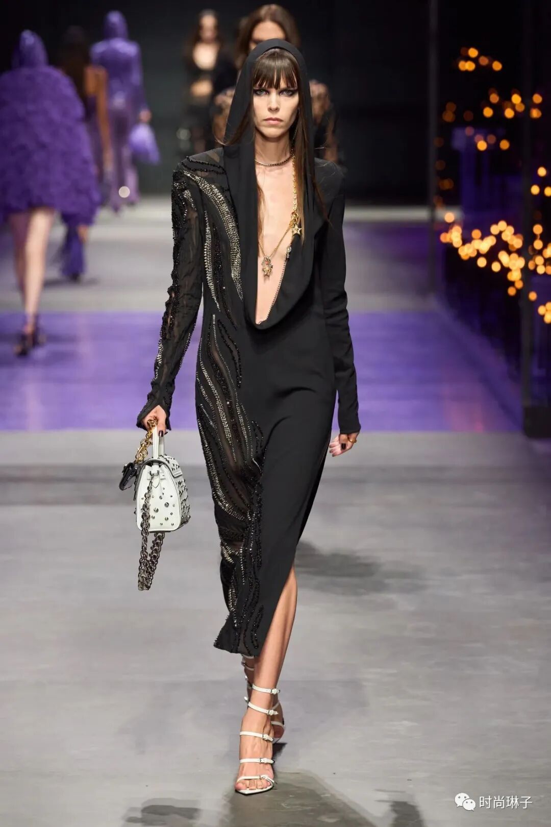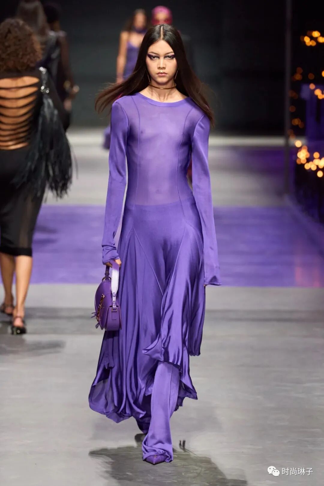 范思哲Versace 2023春夏时装秀以神秘的黑色和紫色为主调,四位全黑造型的超模集体亮相。