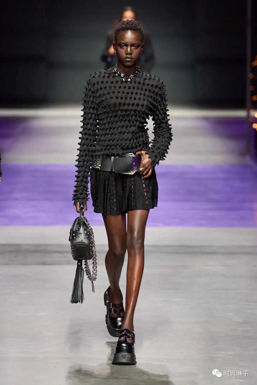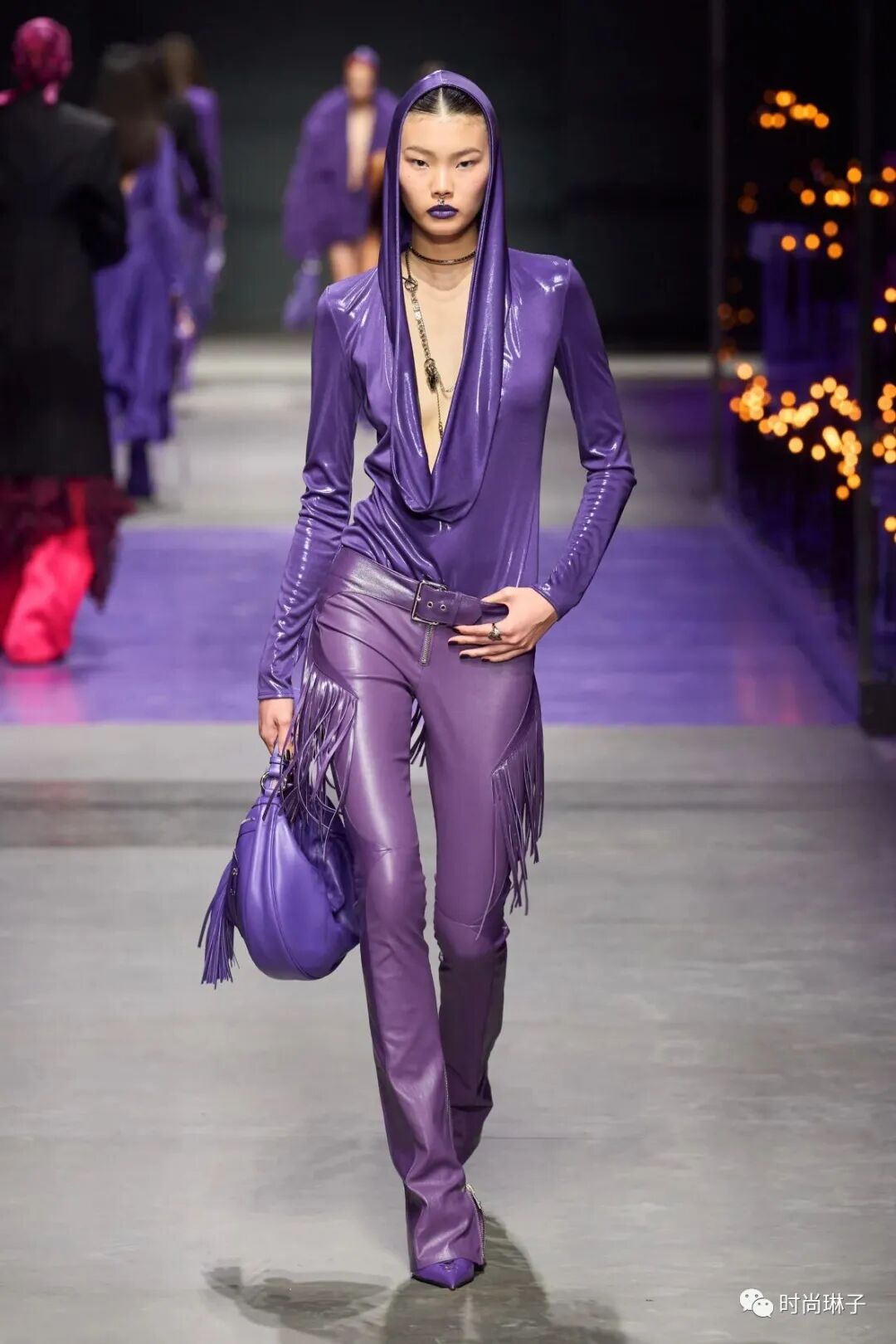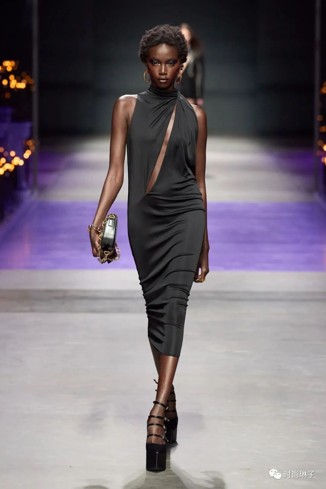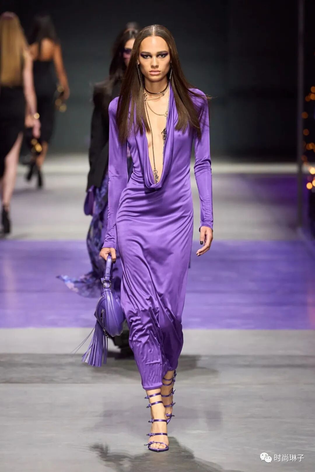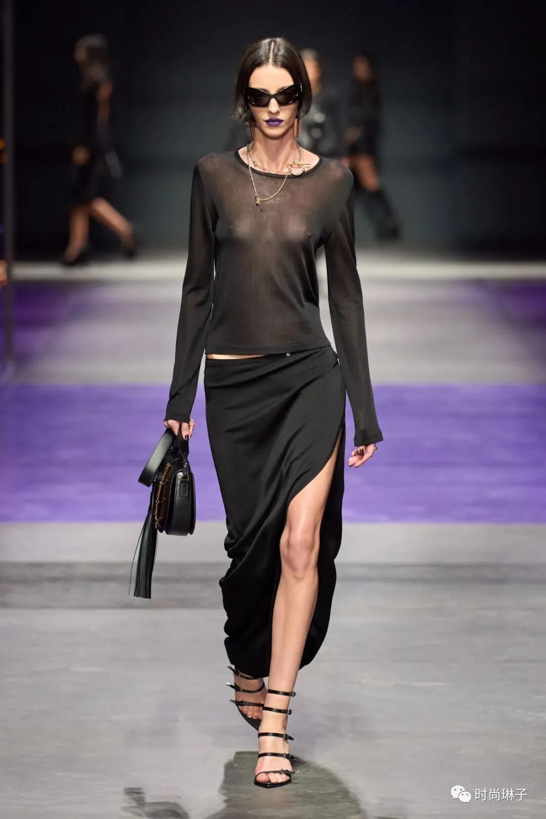 范思哲Versace 2023春夏时装秀以神秘的黑色和紫色为主调,四位全黑造型的超模集体亮相。
