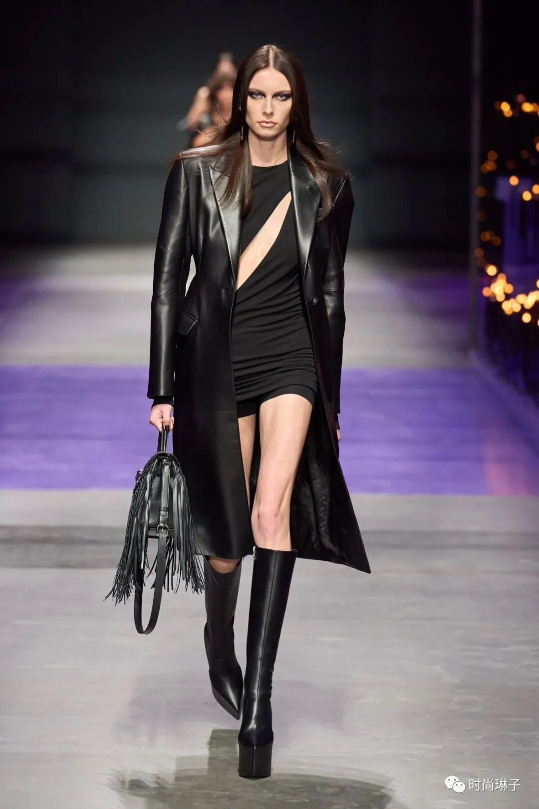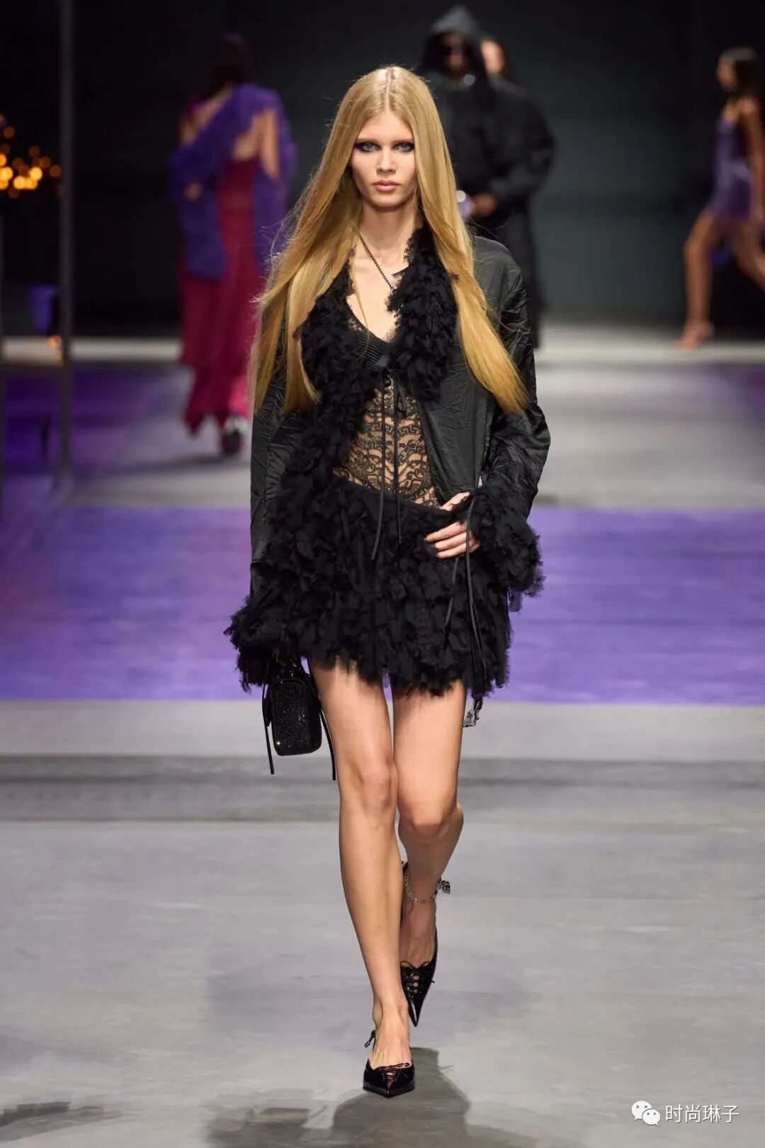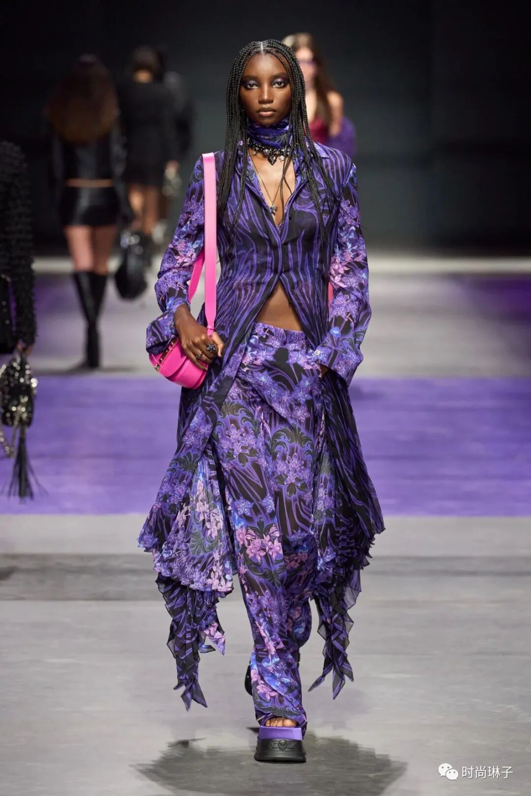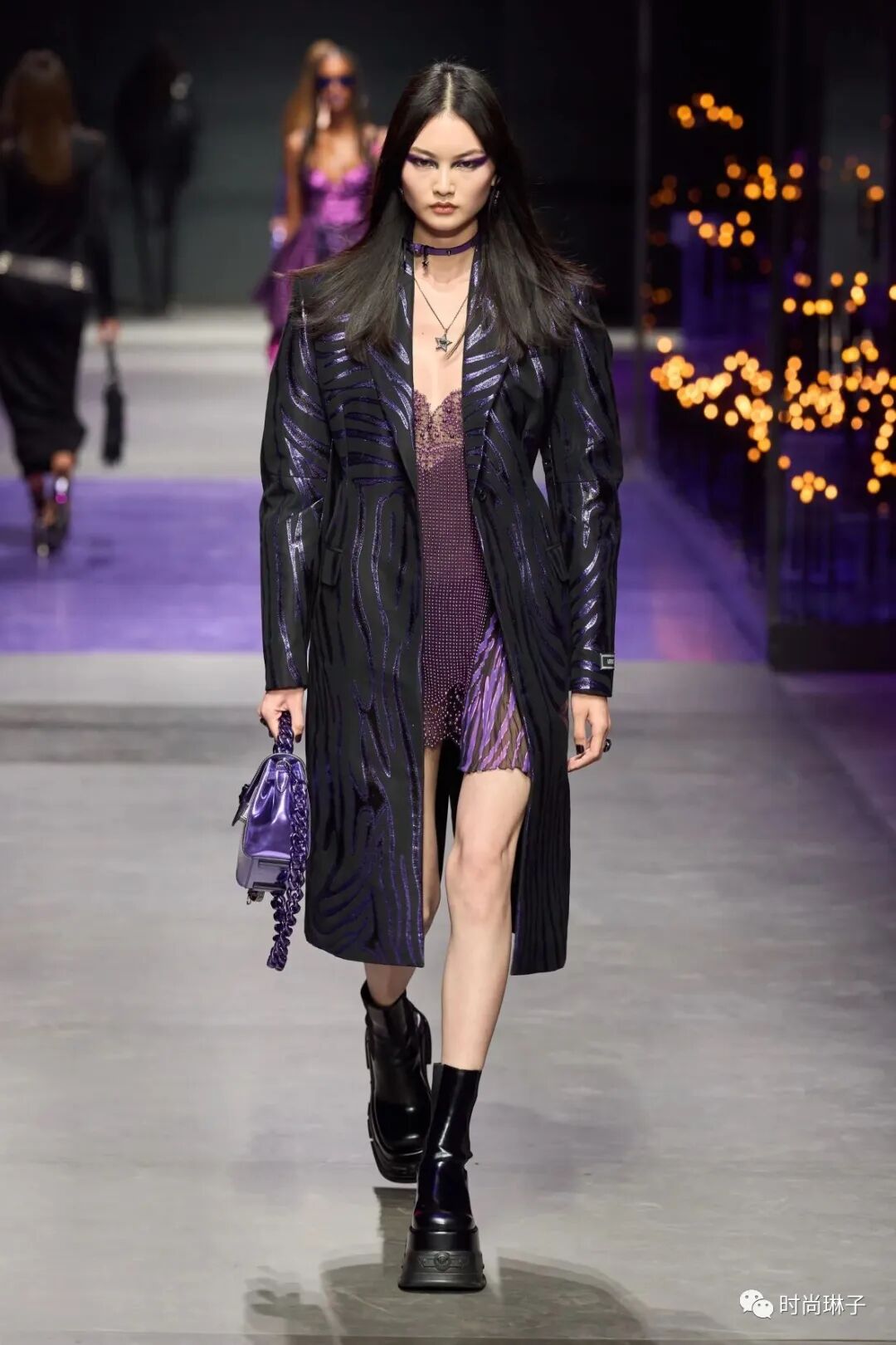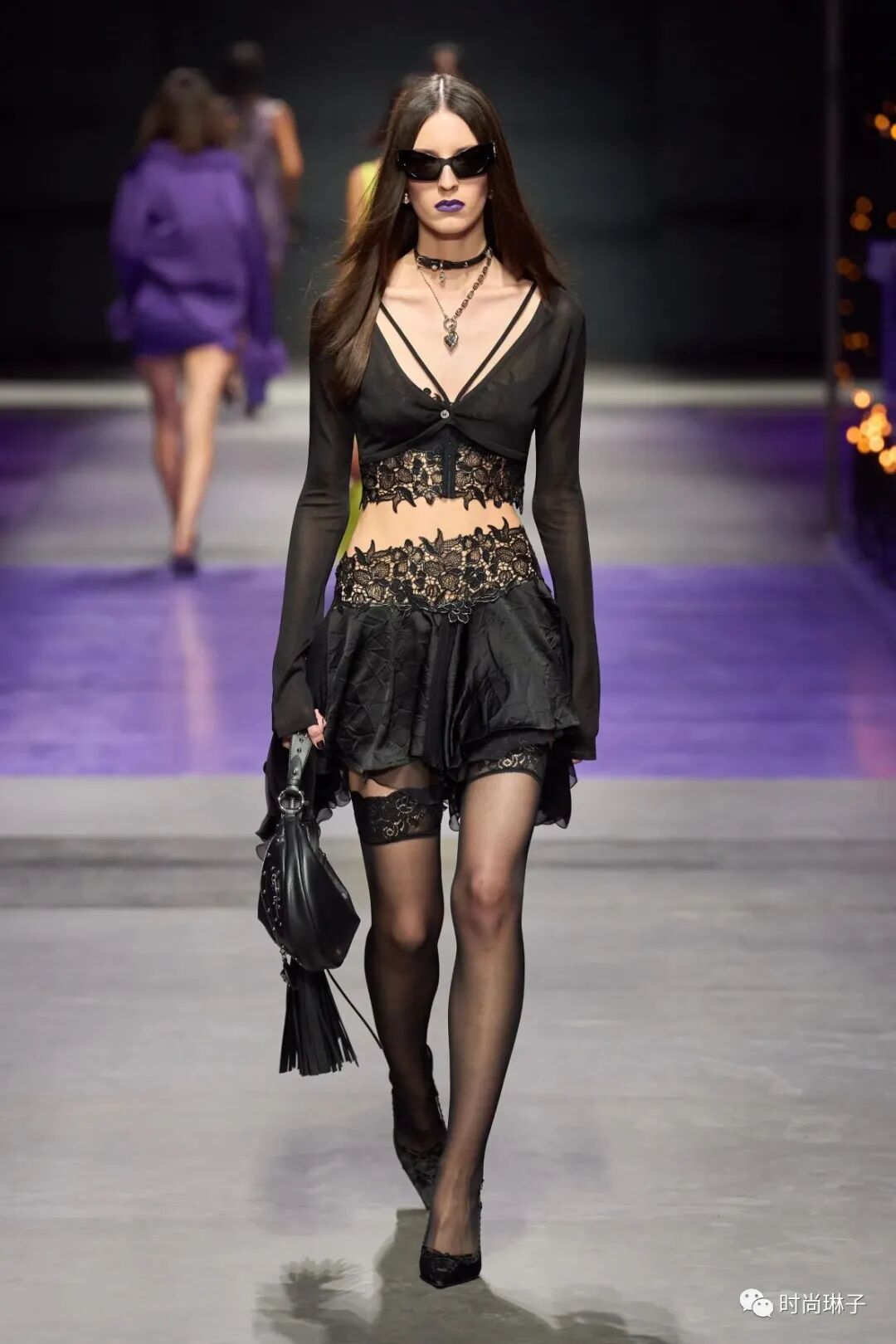范思哲Versace 2023春夏时装秀以神秘的黑色和紫色为主调,四位全黑造型的超模集体亮相。