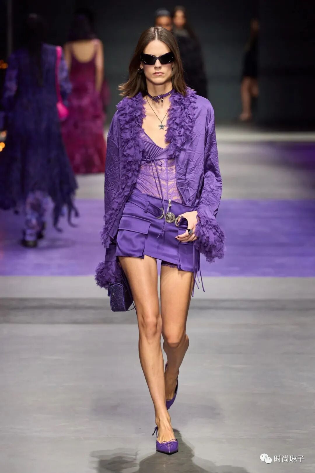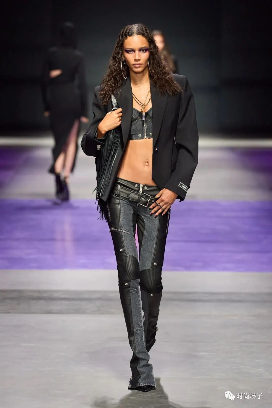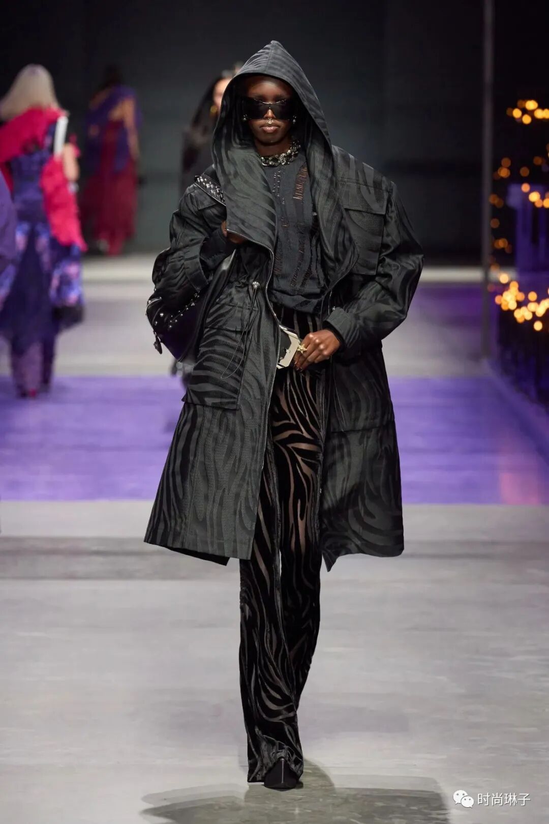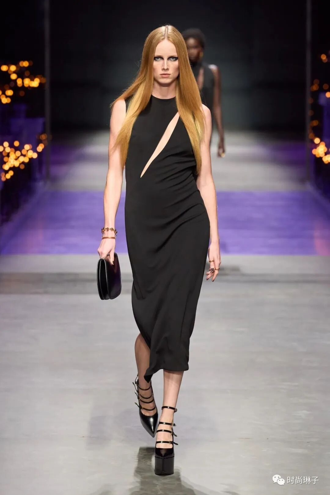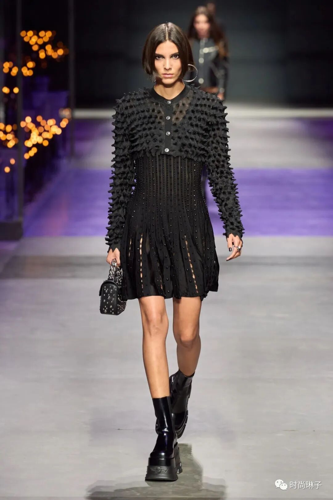 范思哲Versace 2023春夏时装秀以神秘的黑色和紫色为主调,四位全黑造型的超模集体亮相。