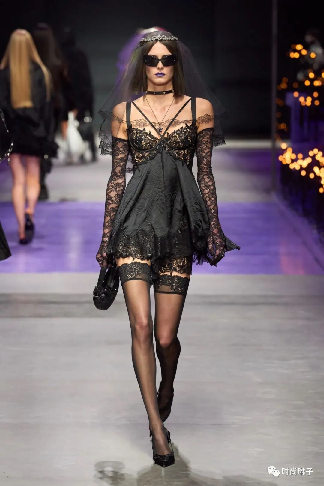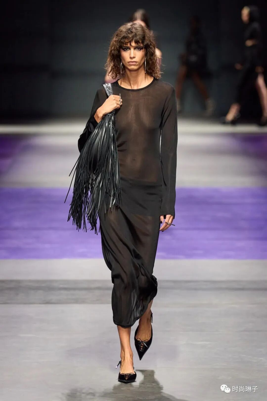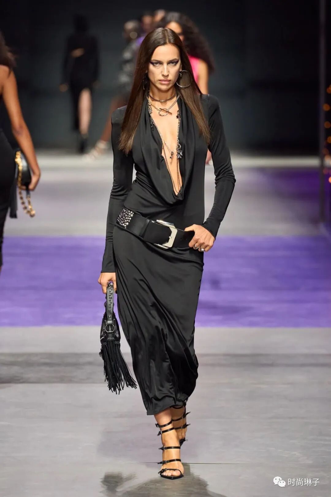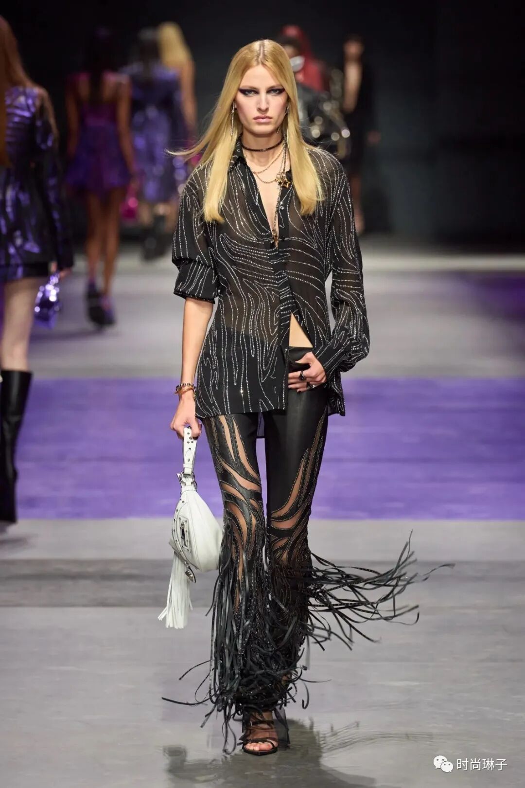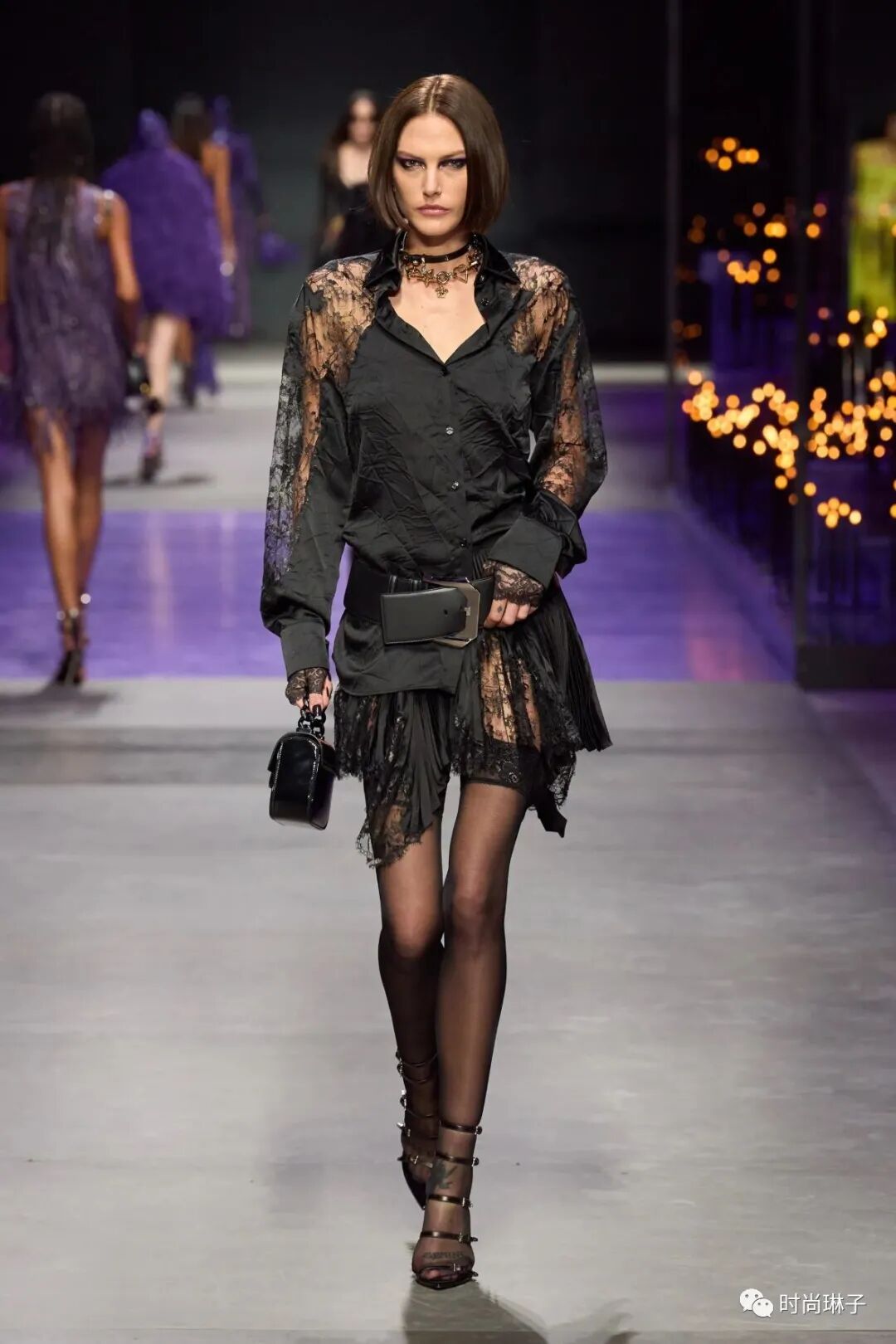 范思哲Versace 2023春夏时装秀以神秘的黑色和紫色为主调,四位全黑造型的超模集体亮相。