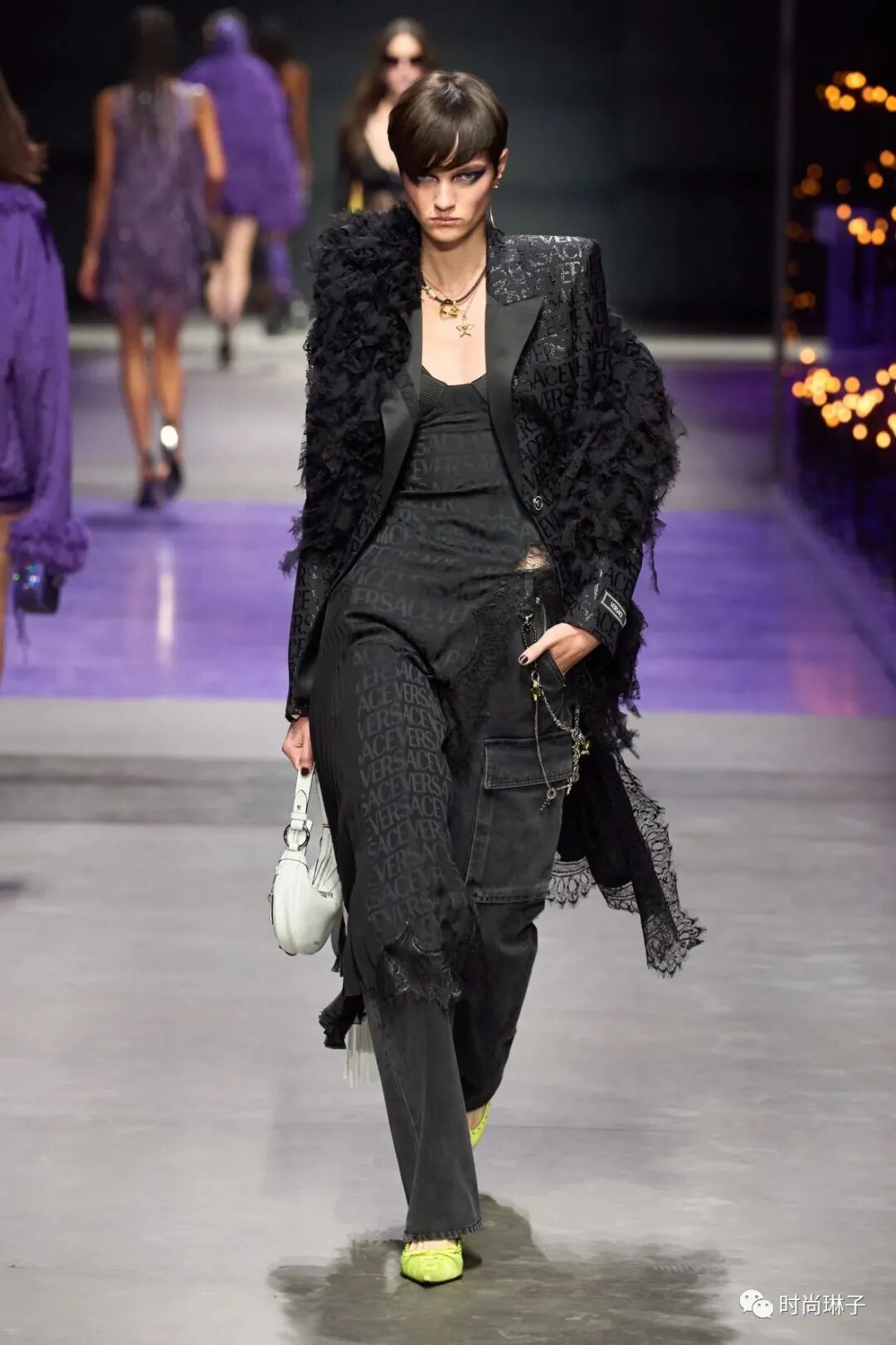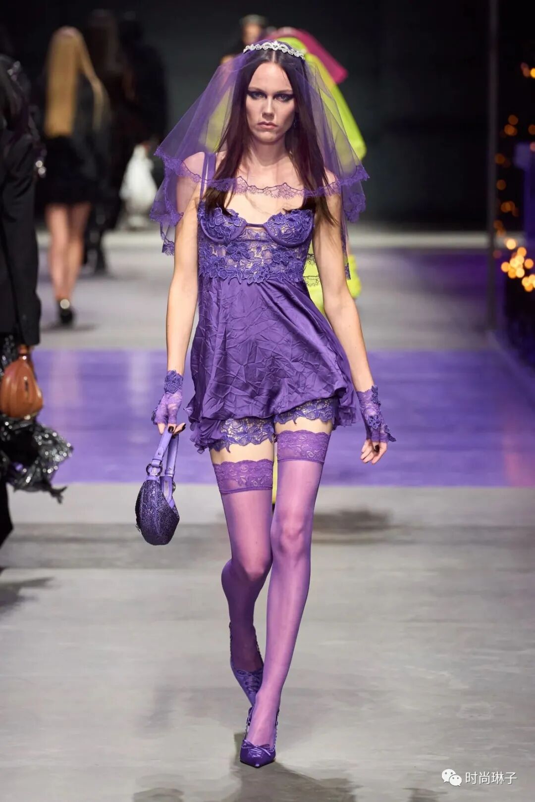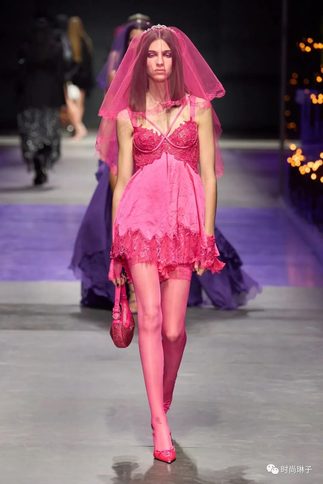 范思哲Versace 2023春夏女装秀的后半场再次由黑变亮,在一系列朋克流苏和性感蕾丝的黑色造型后,模特身穿亮黄,桃红以及紫色蕾丝迷你裙头戴婚礼薄纱以美丽的名义叛逆。