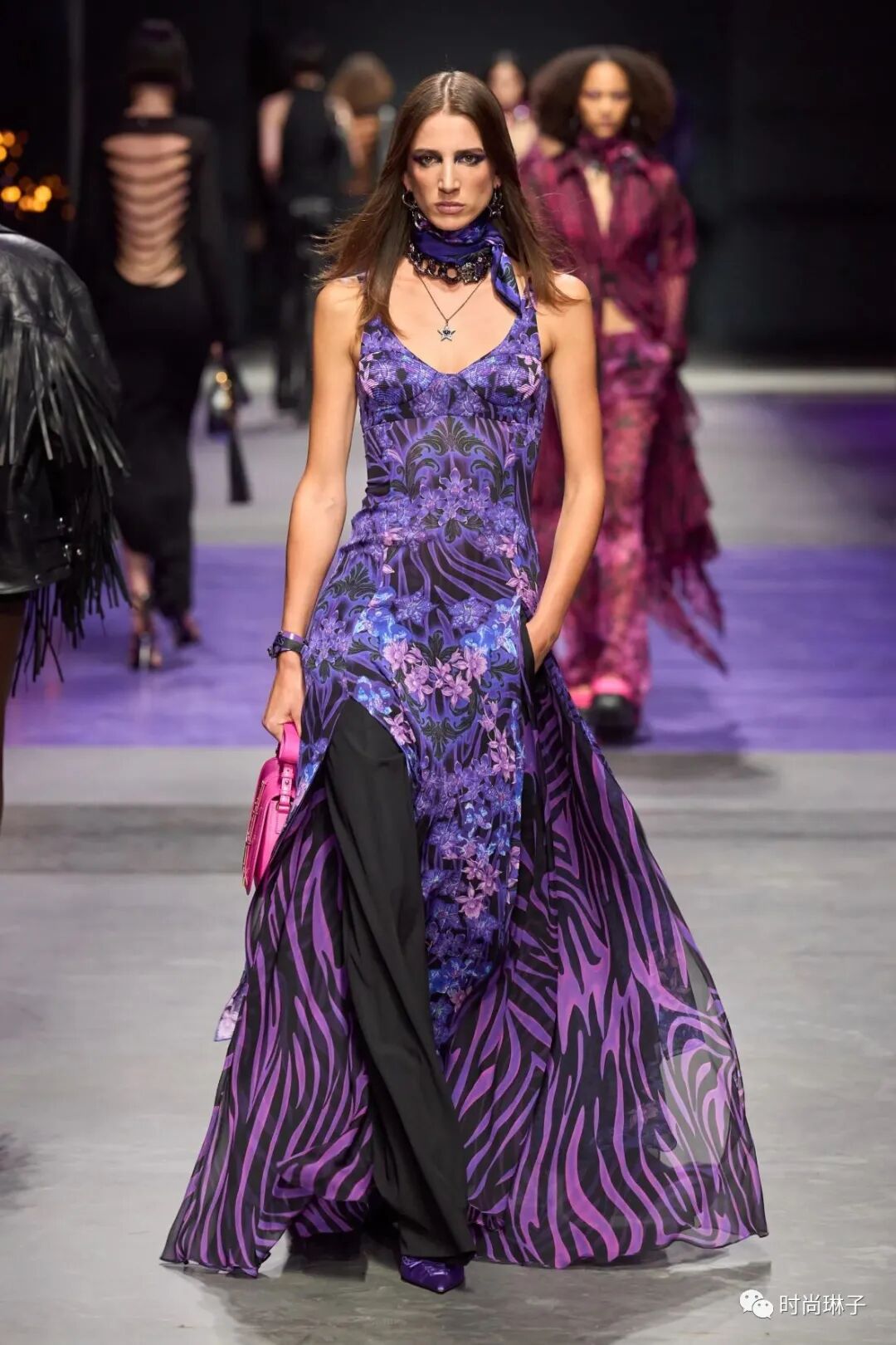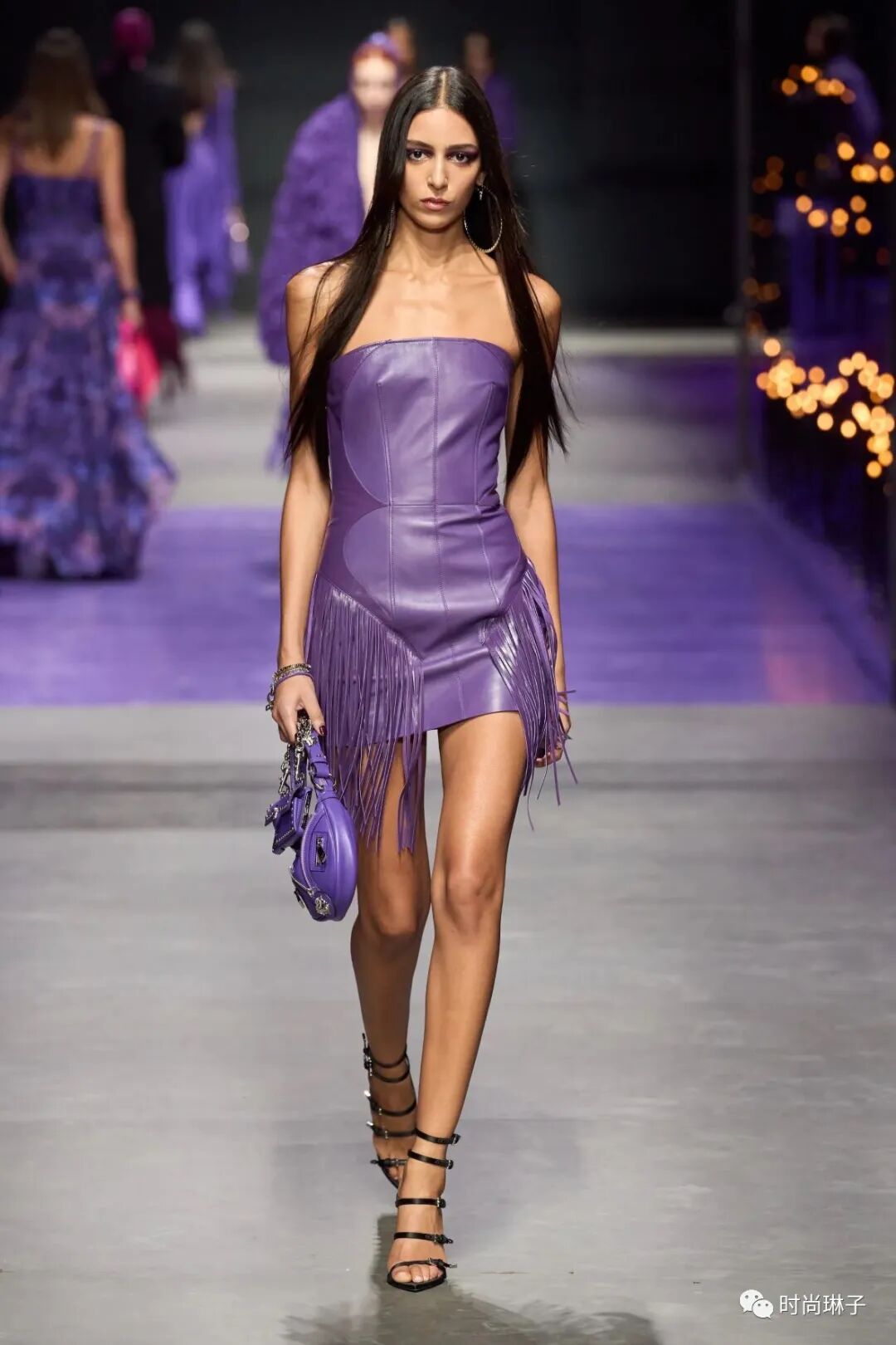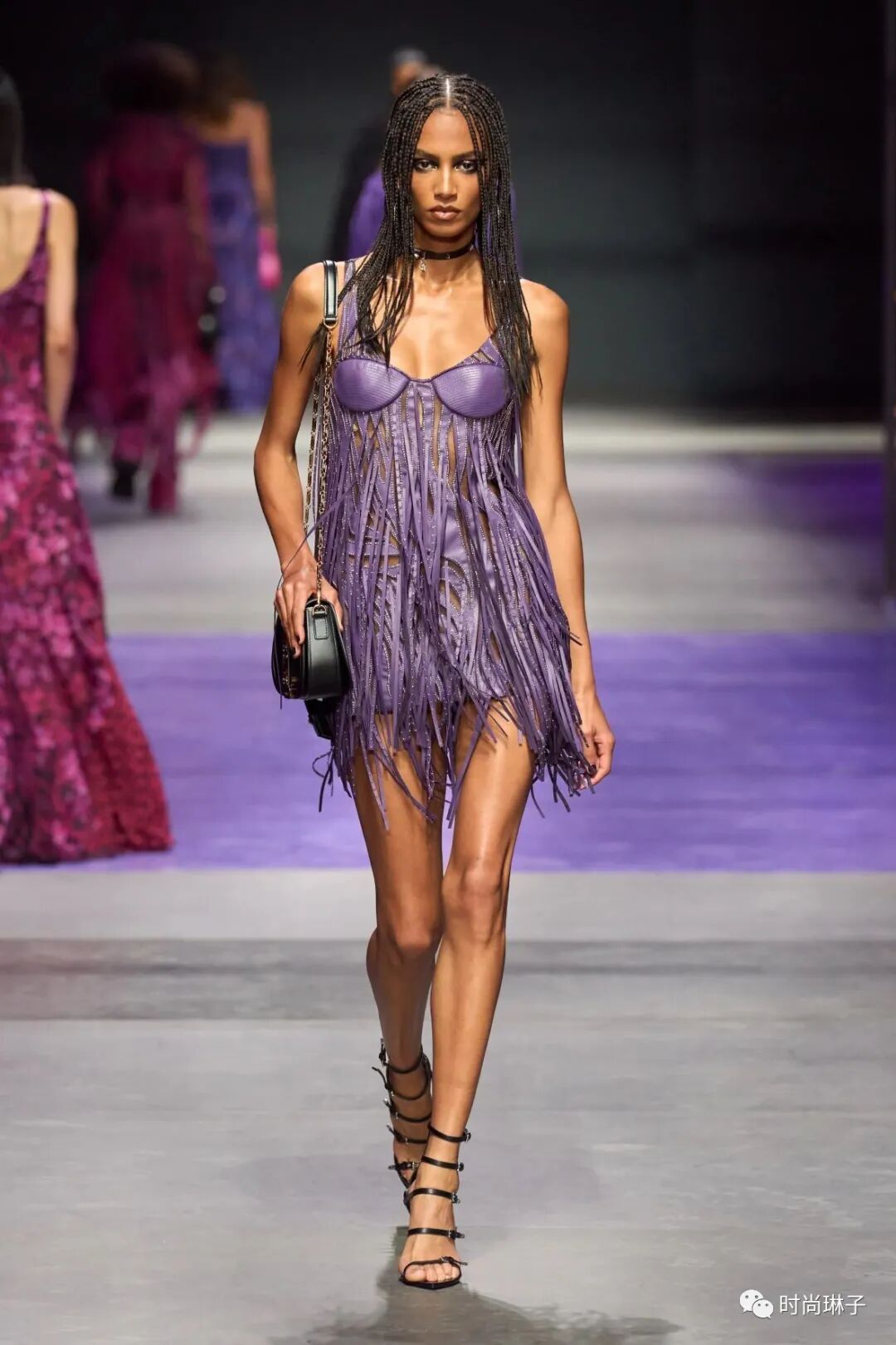 范思哲Versace 2023春夏女装秀从暗黑哥特风到神秘的紫色世界,从全黑的造型到千禧年Y2K回忆杀,通过两次由黑变亮的视觉冲击,展示了该系列别具一格的独特创意。