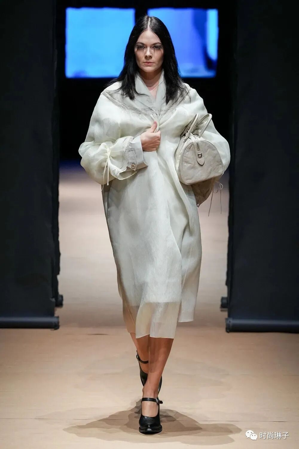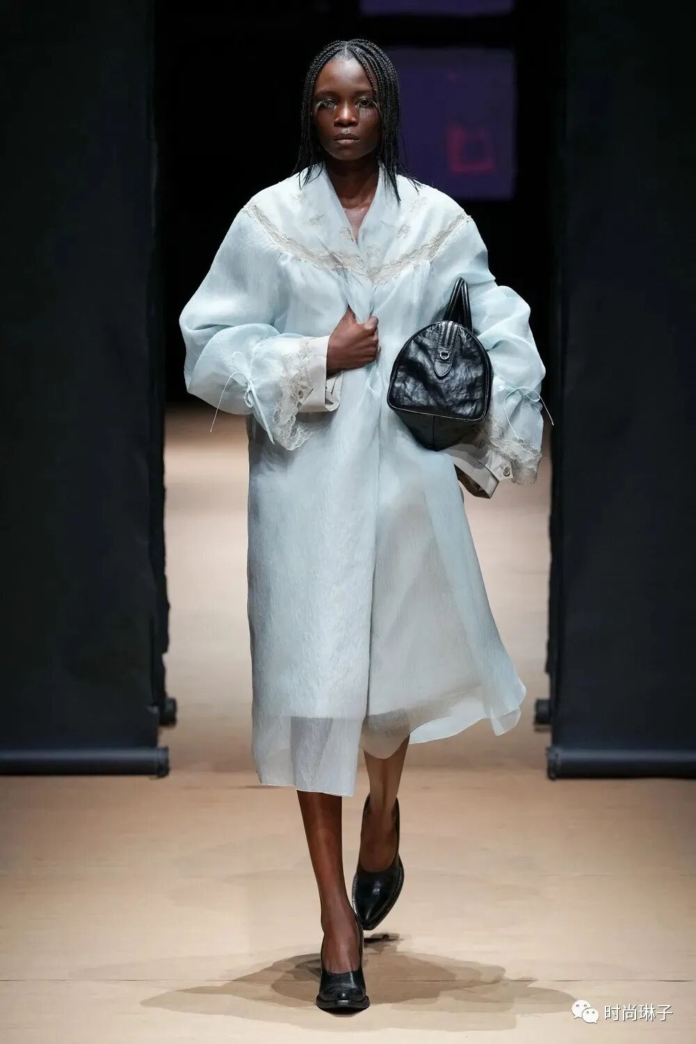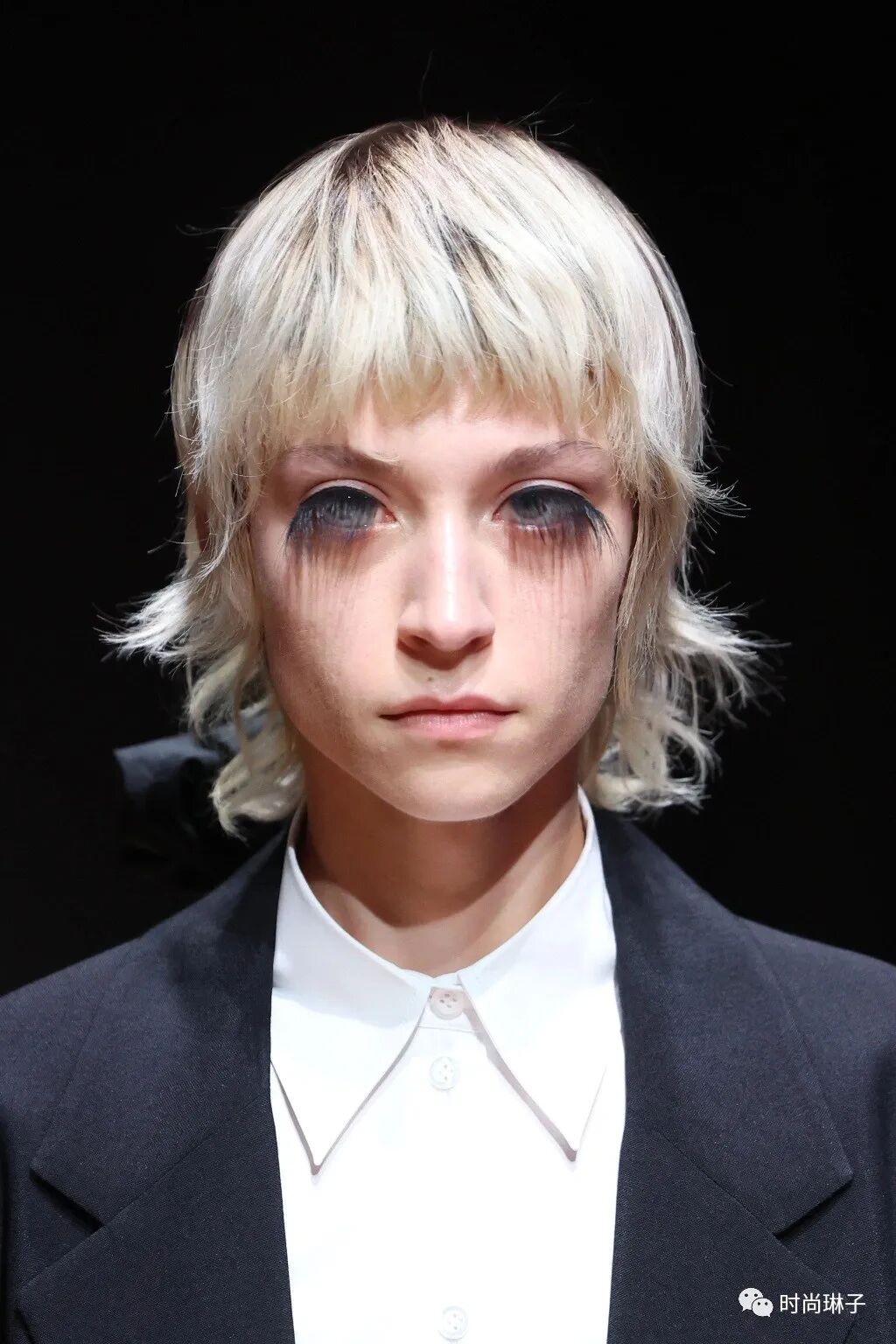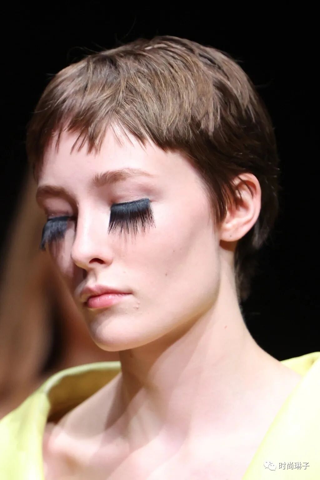 Prada 2023春夏女装秀中模特们的妆容也很特别,超长的眼睫毛虽然遮挡了部分视线,但不能局限人的内心世界。