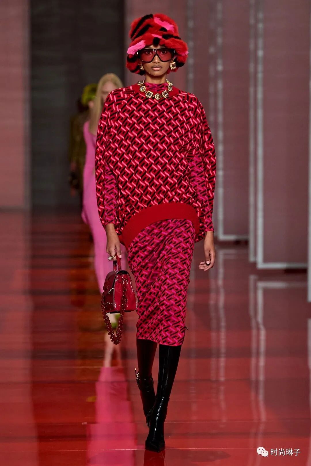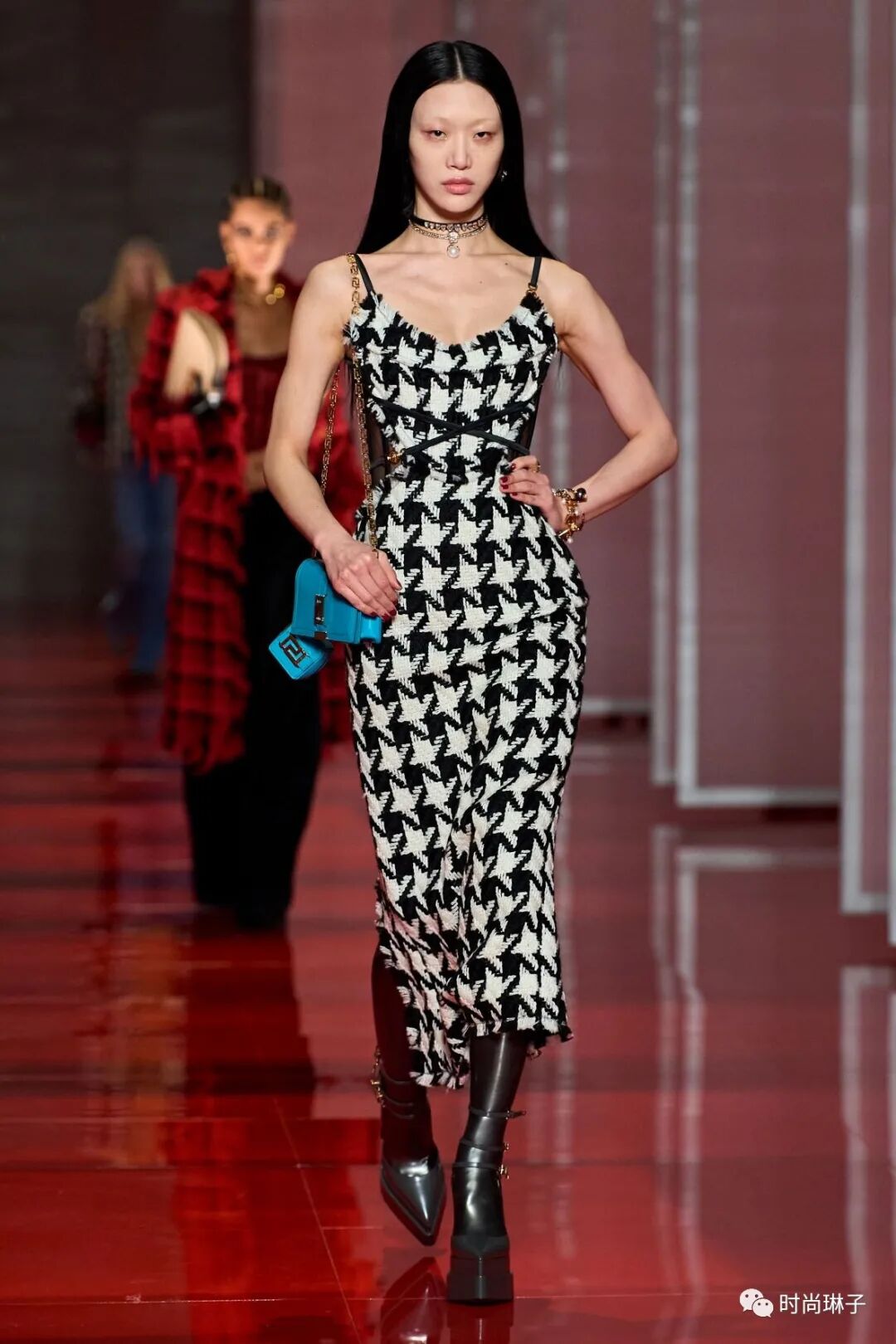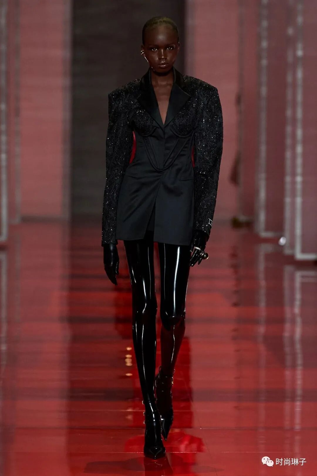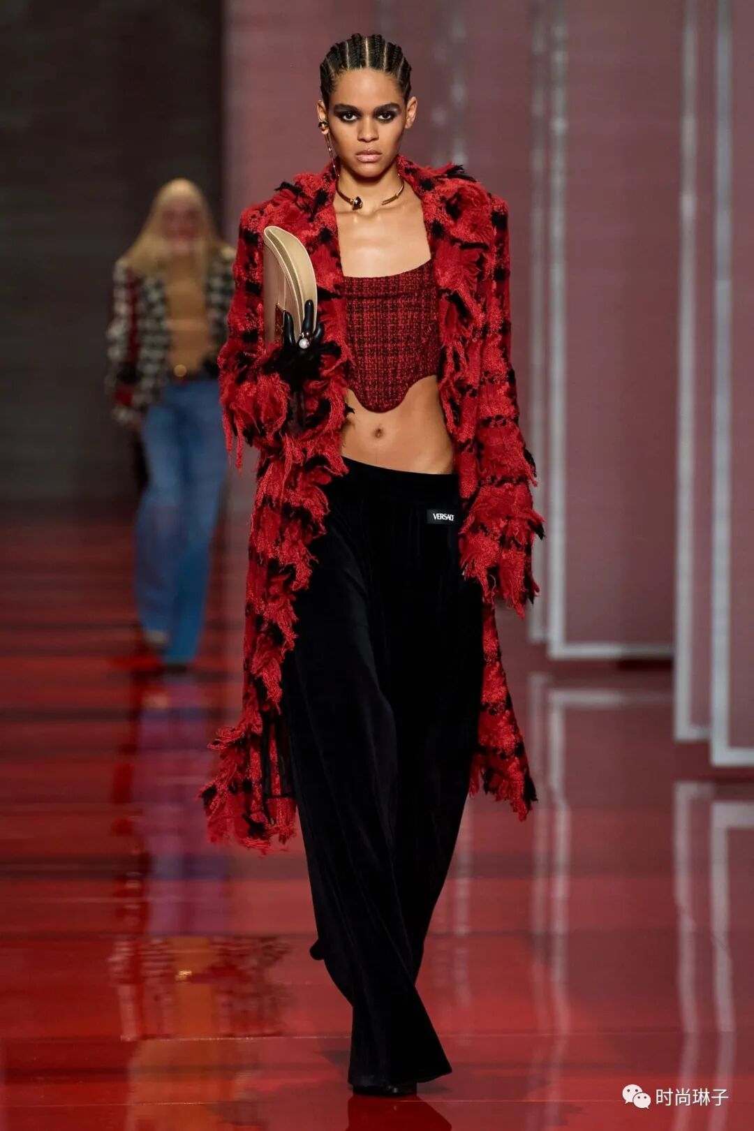范思哲Versace 2022秋冬时装秀以极具视觉冲击力的红色镜面为T台,模特行走在多面半透明的幕布之间,由极具神秘感的女性剪影拉开大秀的序幕。伴随着充满节奏感的背景音乐,模特走出幕布,展示令人期待的新一季秋冬新品。