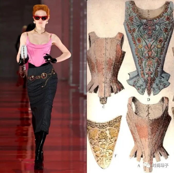 范思哲重新诠释了十七至十八世纪的紧身胸衣造型,它不再是对女性身体的束缚。该季的上衣,连衣裙,西服,皮革大衣,以及羽绒服上的胸衣造型变得更实穿,更轻盈,更唯美的展示了女性性感的线条。