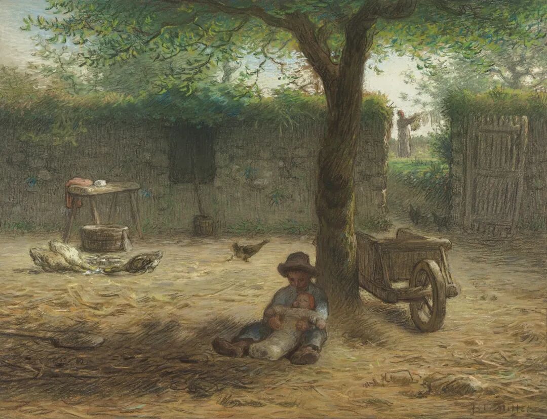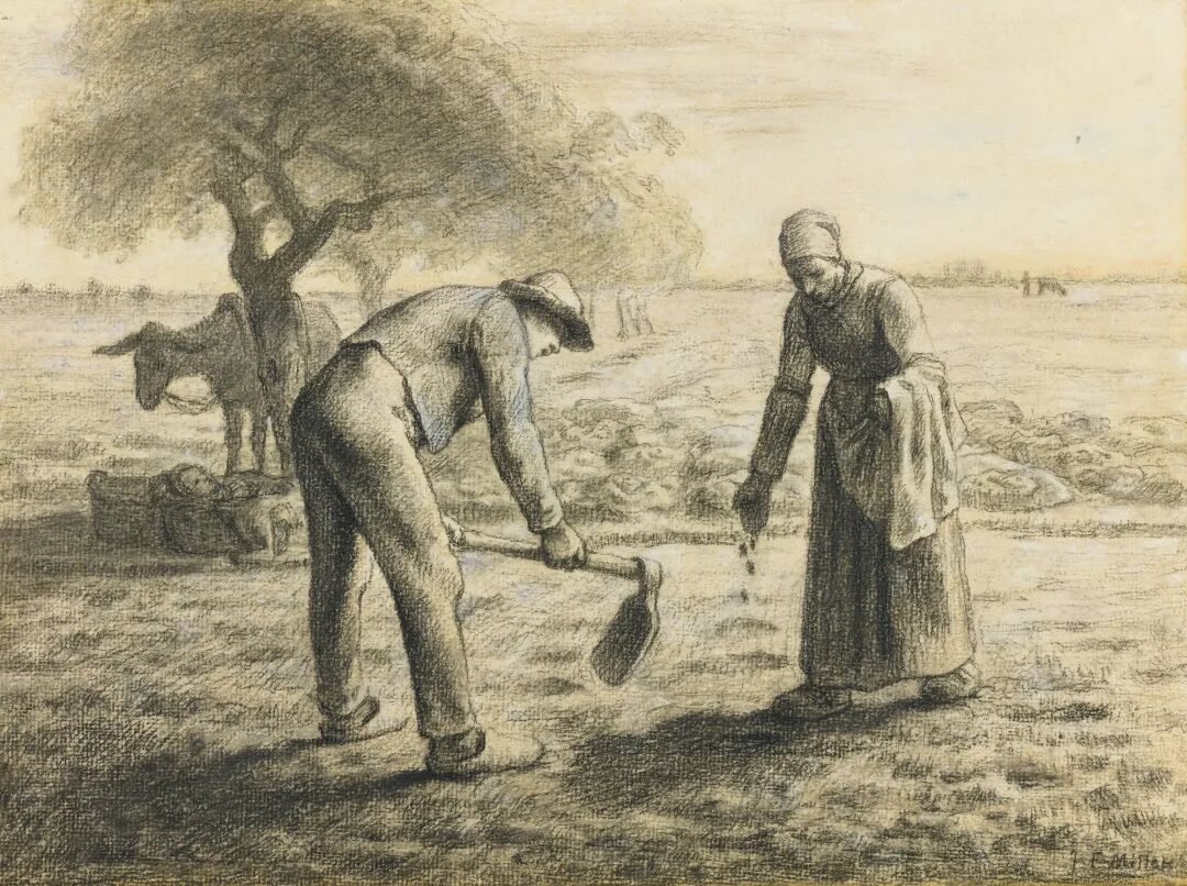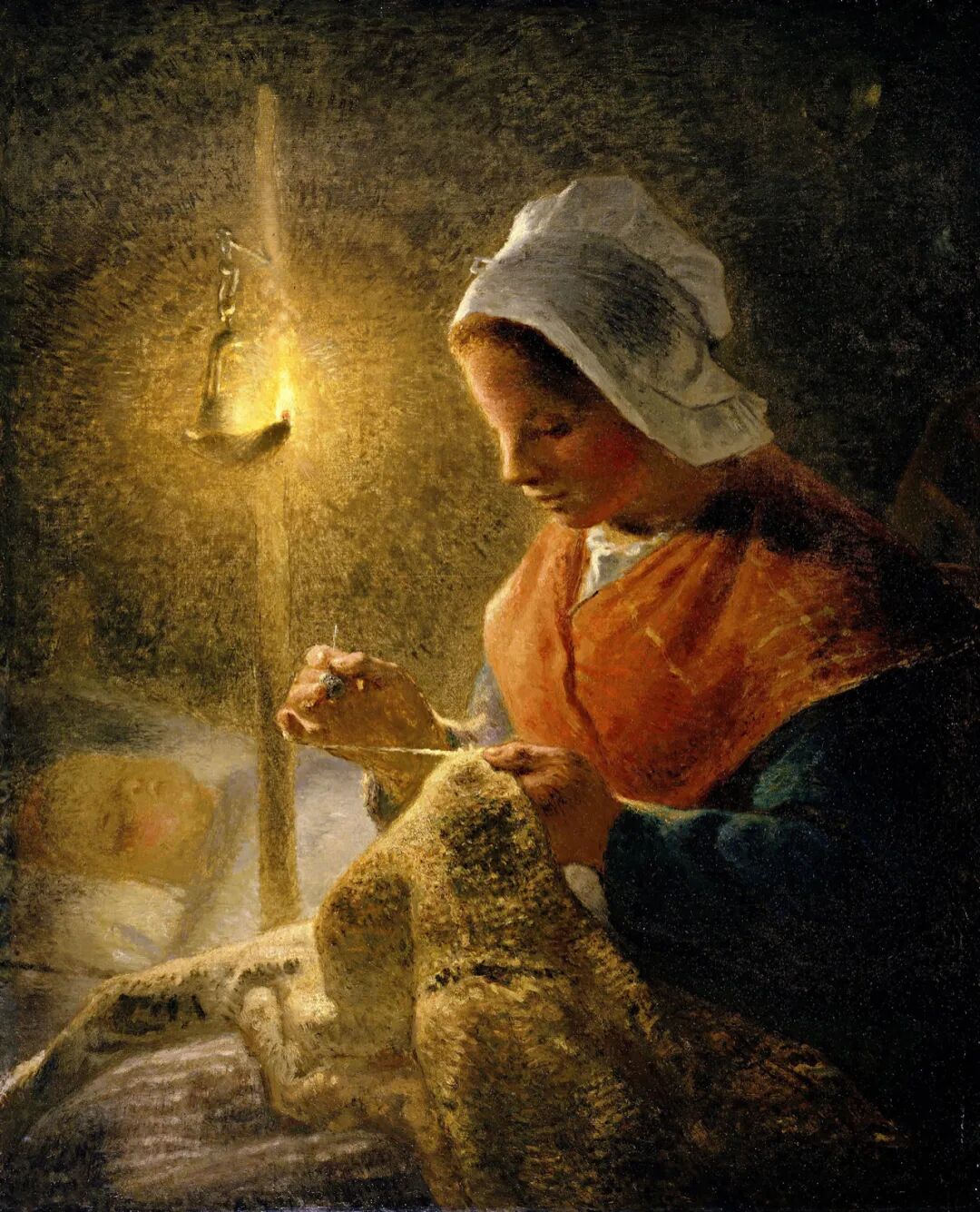米勒的画作,通畅是从一个略显平常的生活化场景入手,并诚恳地描摹出来。很多时候,画一张画的初衷越单纯,所得到的艺术内涵就越深厚。绘画不是数学公式的演算,就像生活无法预设一样,米勒也不会预设绘画的前提,尤其是美学化的、哲学化或是社会化的前提。因为一旦出现预设,就会在很大的程度上成为画面的负担,而这种负担不应该由一个画家来承担。一个单纯的画面,即是一个鲜活的场景,庄严、崇高、博爱、悲悯等文法修辞可以成为画作的前缀。同时,无声的画面又胜过一切美学的、哲学的、社会学的剖析。