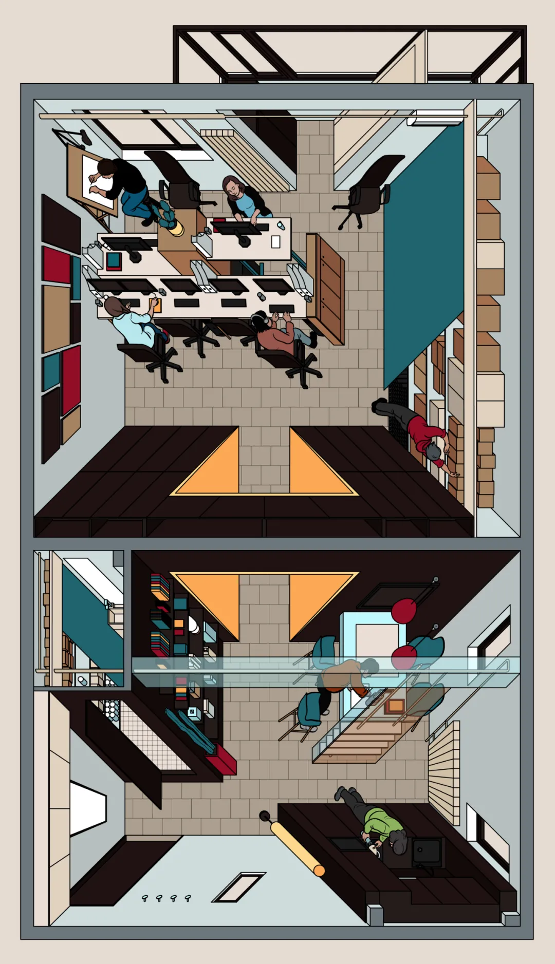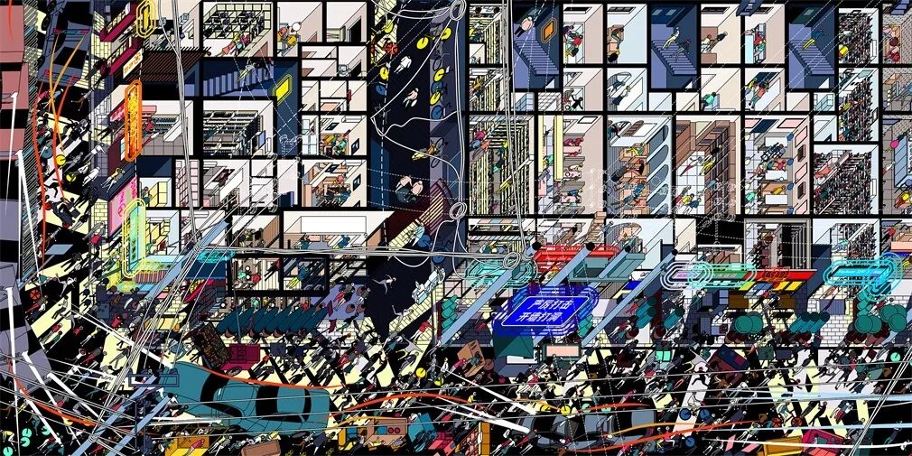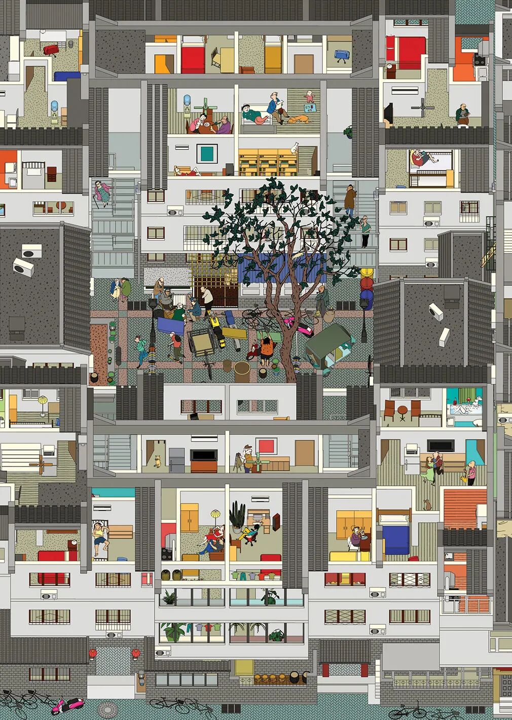 在描绘 42 号楼时,李涵会加入很多强迫症般的密度与细节,家具、小的器皿、烟囱、管道等等,让原本冷冰冰的工程图纸出现了生活的温度。画面充满了故事,也表现出了多样的当代城市文化。